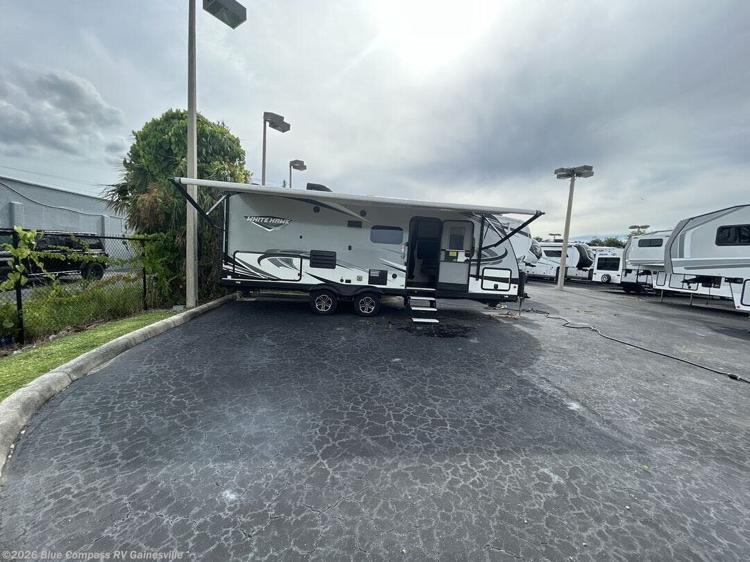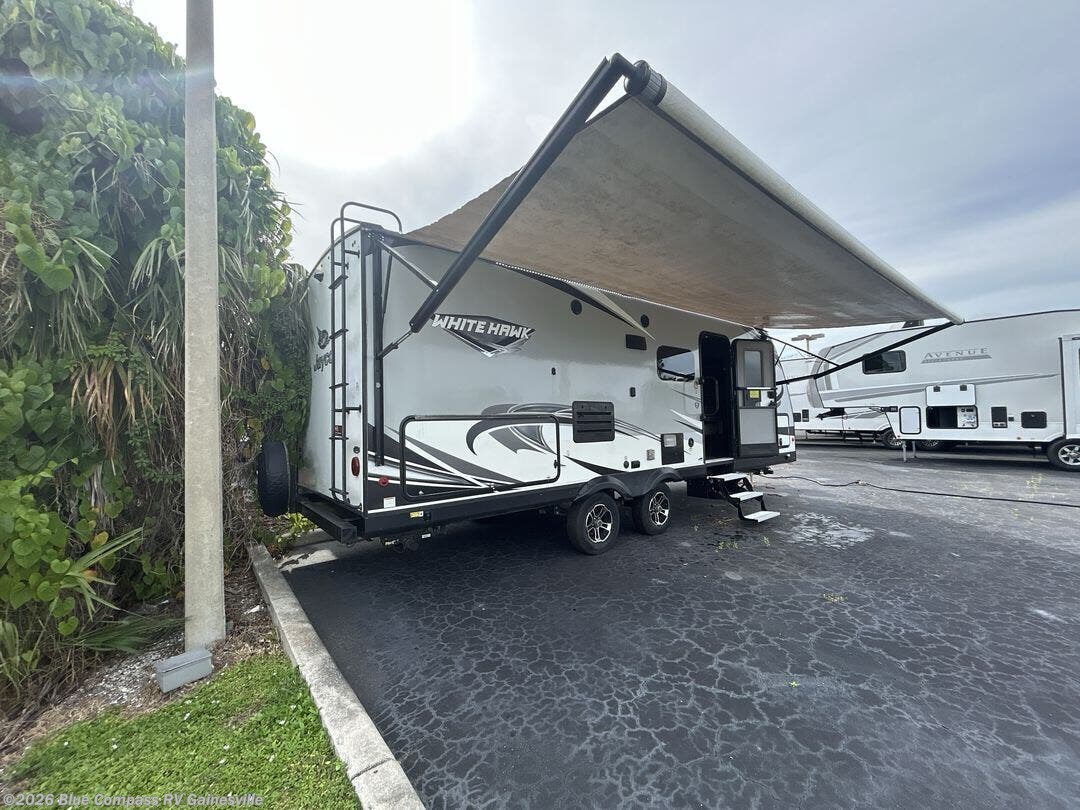 This White Hawk travel trailer is a wonderful addition to any family who is looking for an RV that delivers style and reliability. The stainless steel appliances allow you to cook and store dinner with ease, and in this unit, you aren't restricted to only cooking dinner indoors because you can take the entire party outside of the trailer to the outdoor kitchen. After a long night of fun underneath the 20' electric awning, you can rest comfortably indoors on the Murphy bed that now allows 100% access to the exterior pass-through storage.