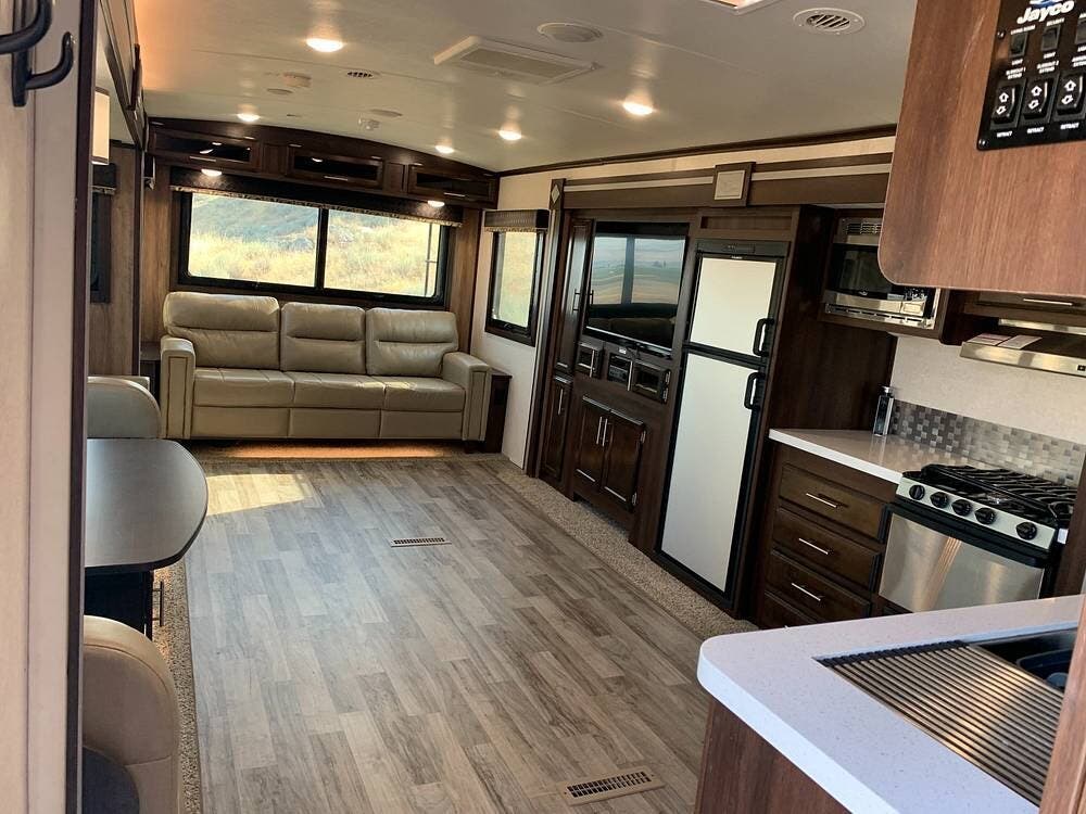 Step into a spacious and inviting interior that feels more like a high-end apartment than a typical RV. The open floor plan of the 31RL model creates an airy and free-flowing space, perfect for entertaining or enjoying quiet moments. Sink into plush furnishings, including a cozy sofa and two reclining chairs, strategically placed to take in panoramic views through expansive windows.