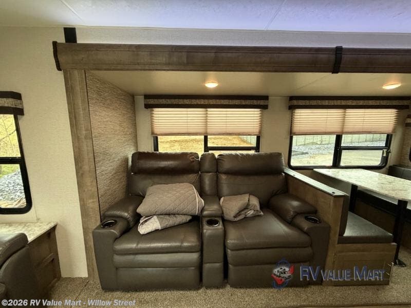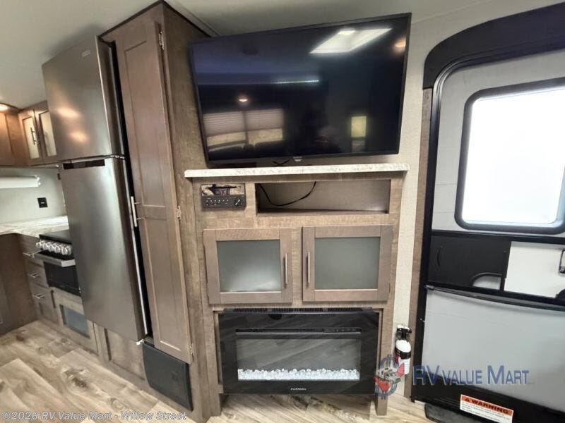Looking for outdoor adventures with inside comforts such as reclining on theater seats while watching the LED TV with a multimedia entertainment center or staying warm by a fireplace if you decide to add that optional feature? This travel trailer offers those desired features and option, plus provides a spacious living area including a USB port to keep the devices charged and ready for taking pictures when you get outside to enjoy the weather. You will love the L-shaped kitchen which allows you to prepare any meal while visiting with everyone relaxing on the furniture. The master bedroom offers a comfortable queen bed with overhead lights to enjoy reading a book, and there is plenty of storage including underneath the bed. Now imagine you can enter the trailer through the main living area or the master bedroom, that's convenient! Take a look today!