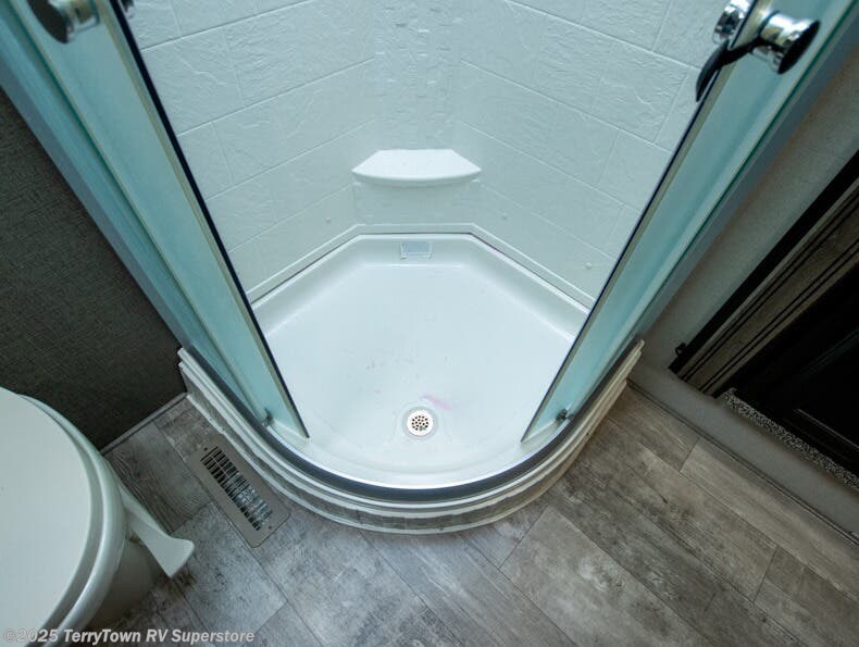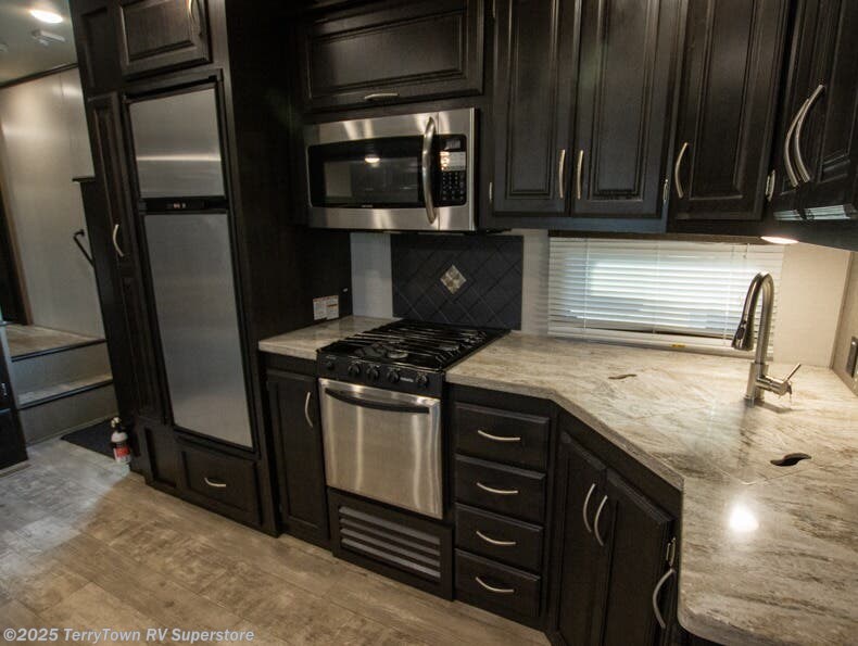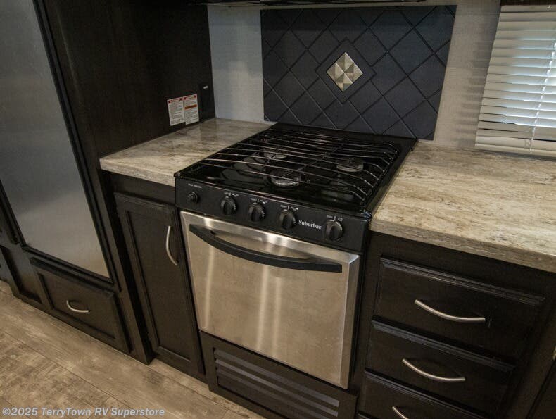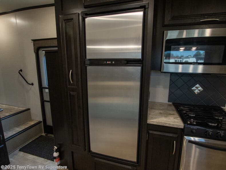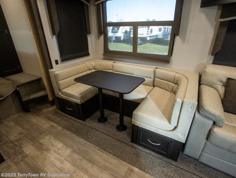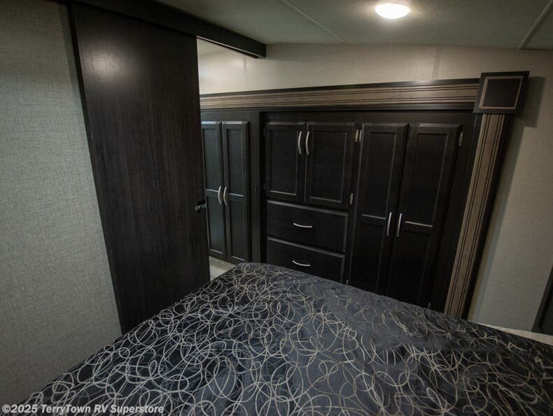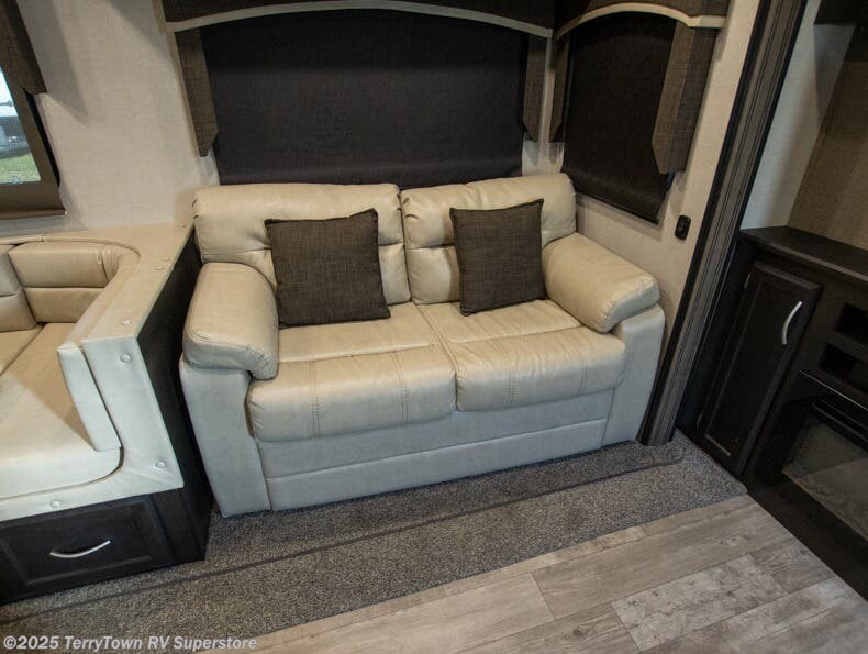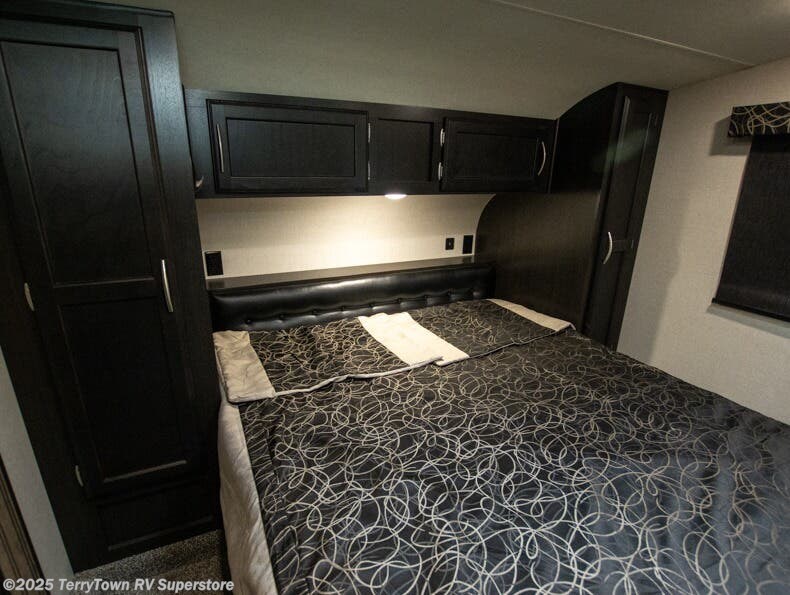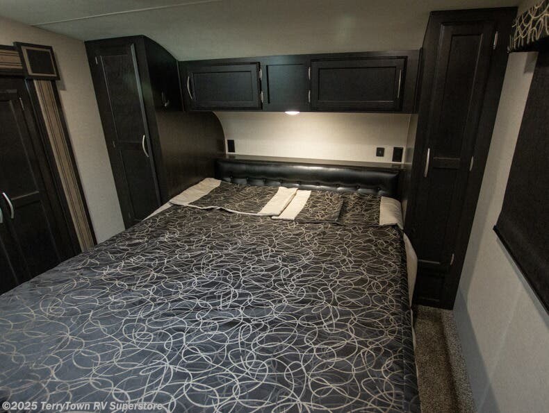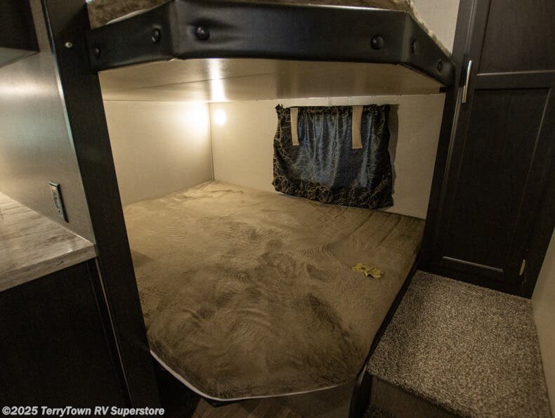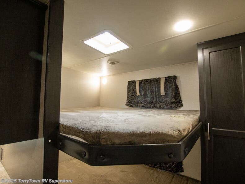 The grandkids will beg you to take them with you on every camping trip with this fifth wheel that features queen bunk beds. Within the slide out you'll find a hide-a-bed sofa and a convenient U-shaped dinette that everyone can sit around at meal times. This unit includes a front private bedroom with a queen bed, and a slide out wardrobe that provides you more space. In the evenings, head outdoors to cook a meal on the outside kitchen as you enjoy the 14' awning with LED lights.