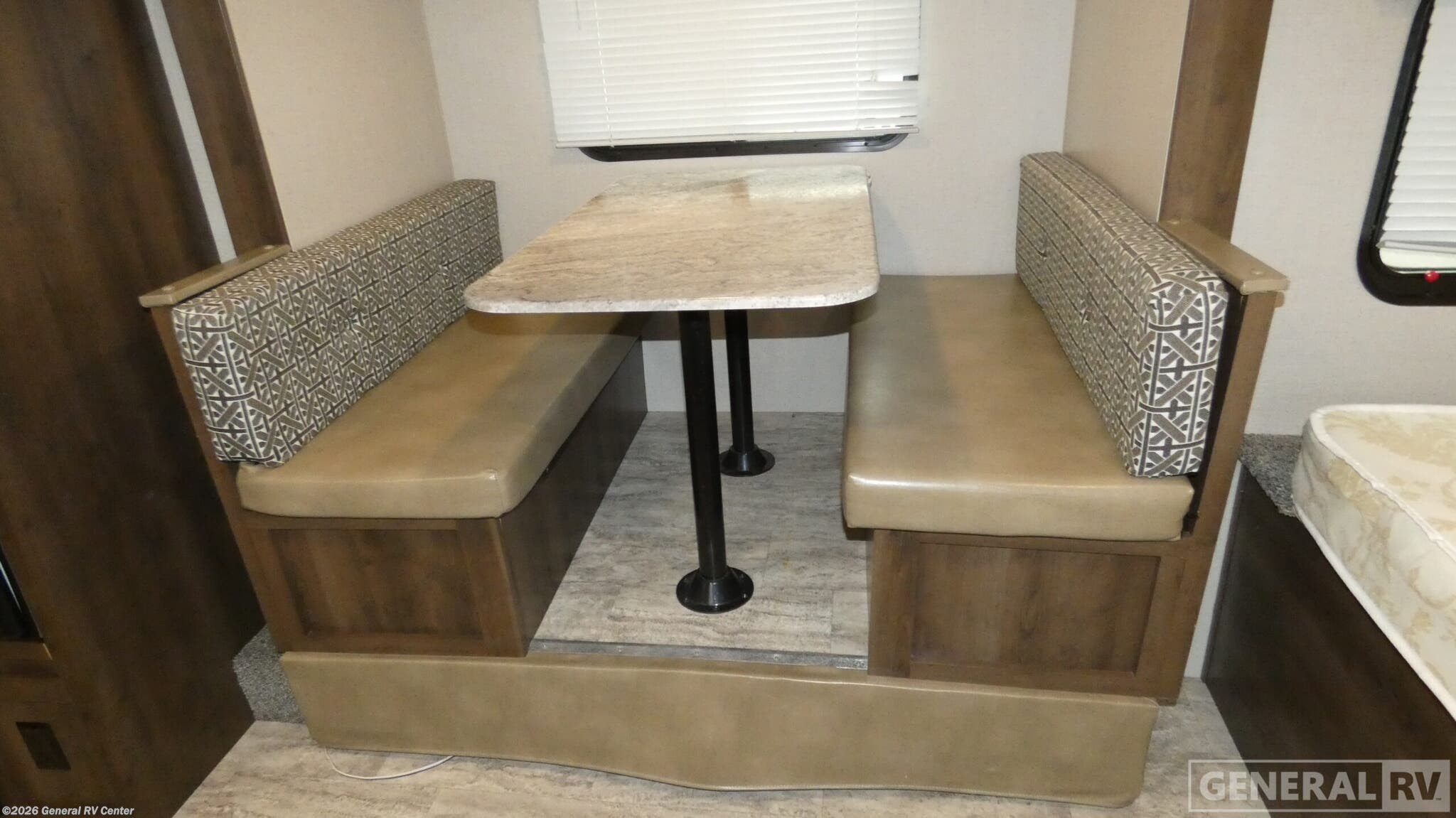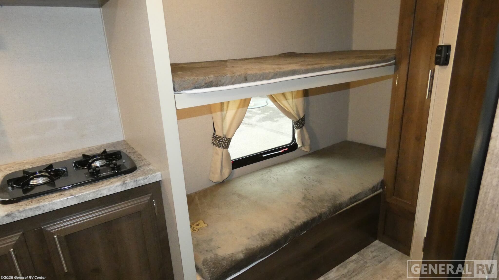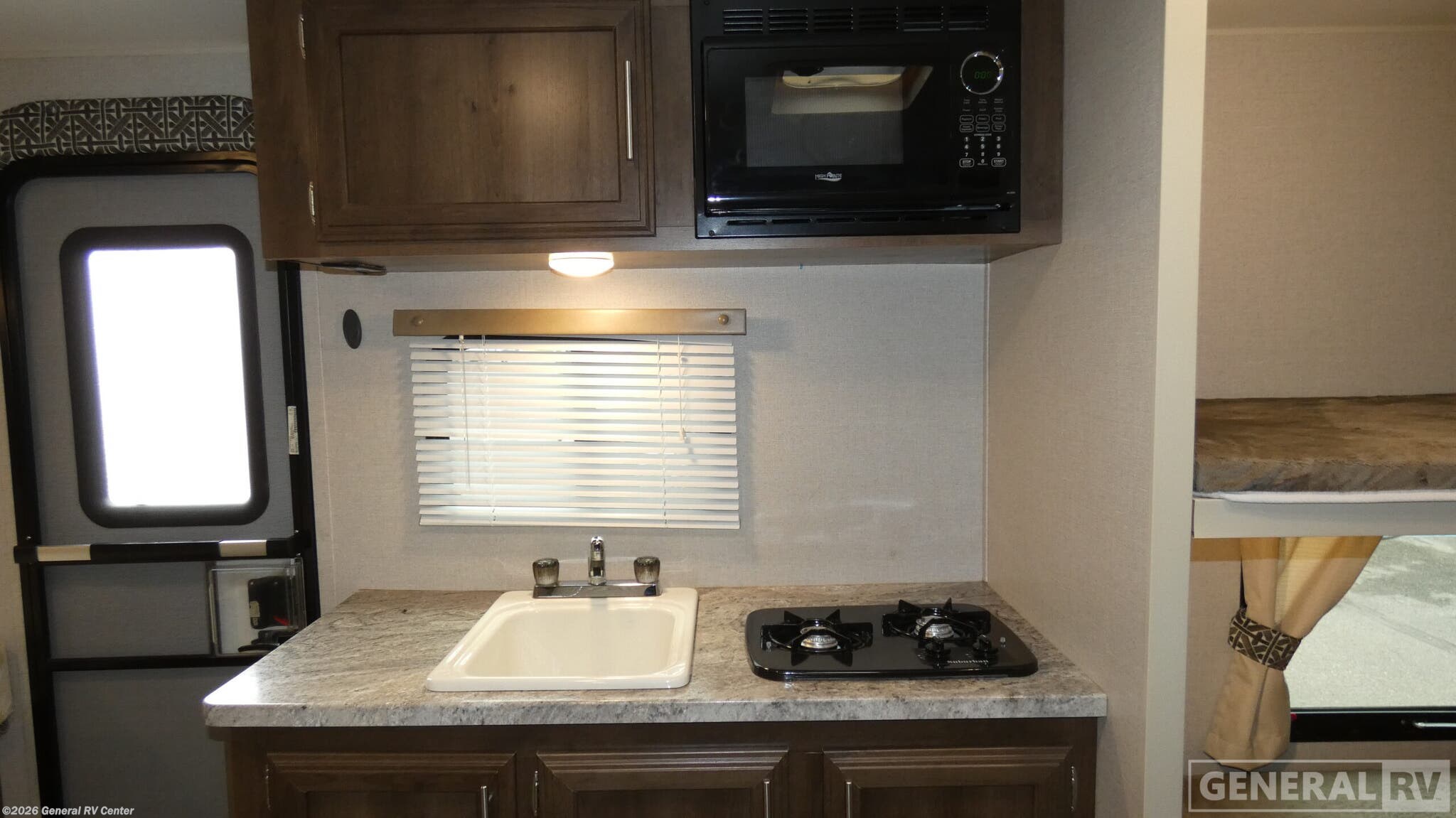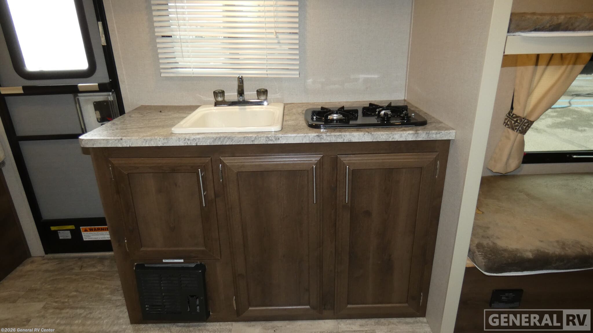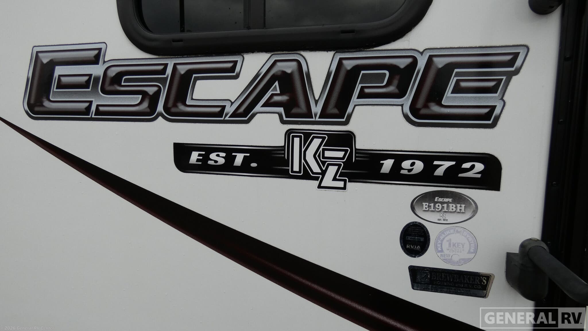 KZ Escape travel trailer E191BH highlights: Rear Corner Bath Queen-Size Bed Booth Dinette Convection Microwave This spacious KZ Escape travel trailer suits a medium-size family for a comfortable living experience with a rear set of bunk beds for anyone to enjoy. It offers extra space to keep your camping necessities handy in the exterior pass-through storage. With the versatility of the booth dinette, it creates not only a dining area, but also a sleeping area along with the bunk beds. You can unwind at night underneath the 10' power awning with LED lights as you roast marshmallows around the campfire. KZ Escape lightweight travel trailer, expandable, or toy hauler models combine comfort and functionality into one. The Escape shows this by offering cable hookup, using LED lighting, and equipping a power awning with an LED light strip to enhance each late-night party. KZ is the only brand that uses the Aqualon Edge material with a 7-year warranty and Alum-a-Tough roofing with a 12-year limited warranty. These warranties prove they are built to last. The Off-Road package shows this brand is also equipped to satisfy your desires to travel off the beaten path. So come choose your new Escape and show it off to your friends and family!