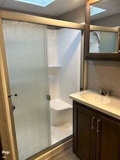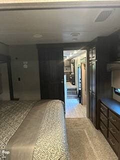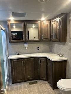 The huge Master Bathroom to the rear of the RV features two sinks, a large vanity, a toilet, and a large shower. The RV is also prepped for a W/D in the bathroom closet.