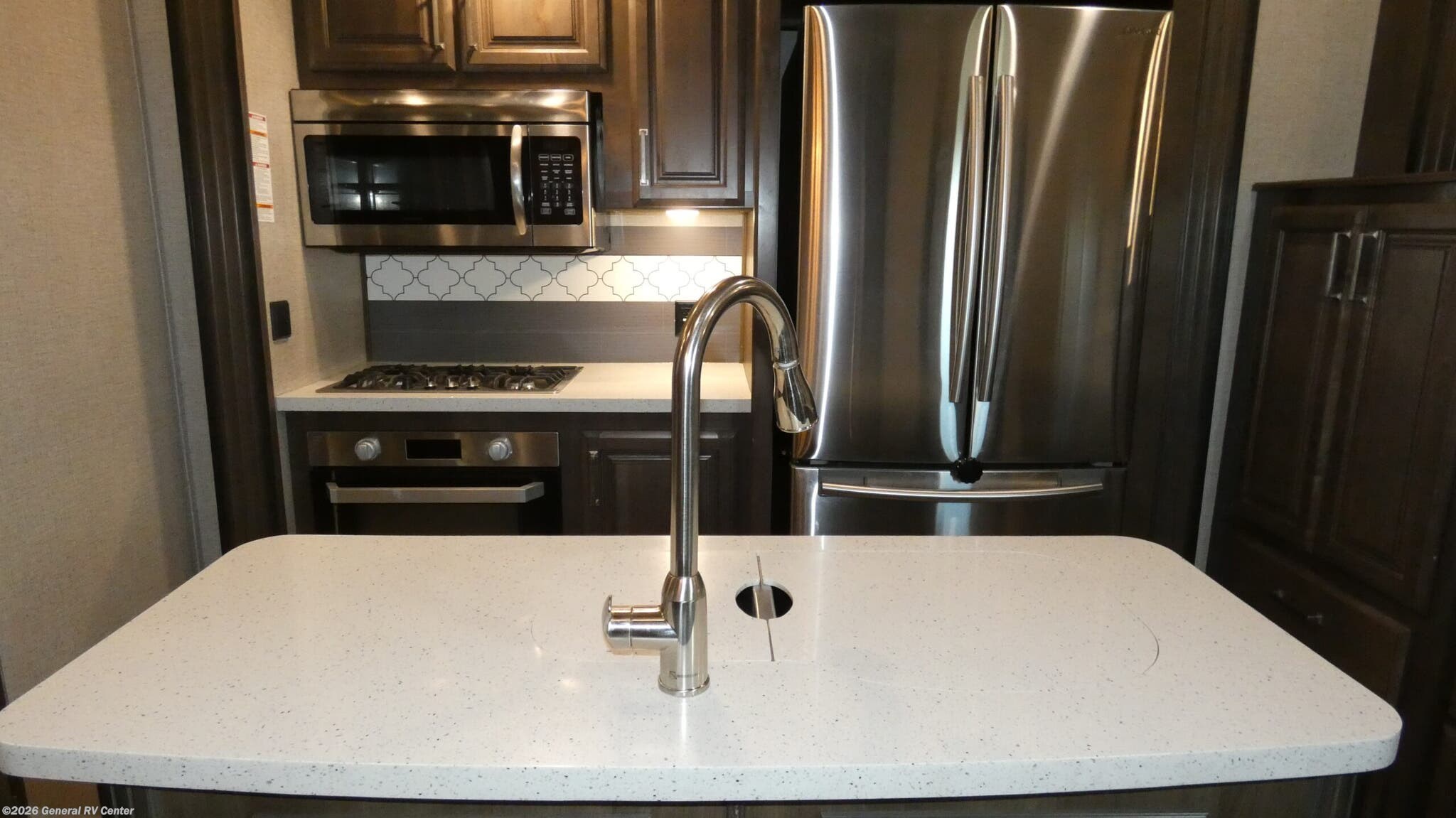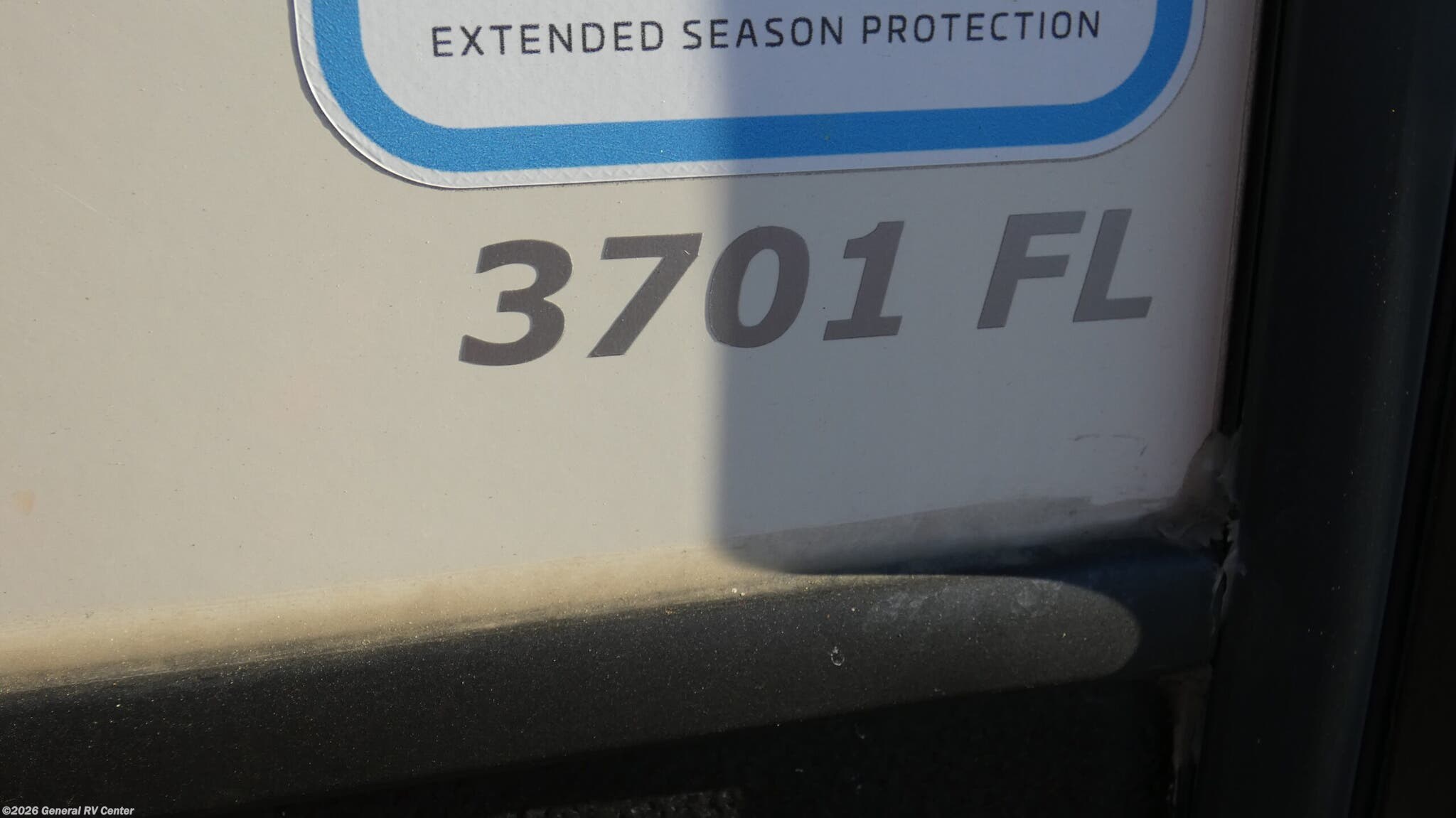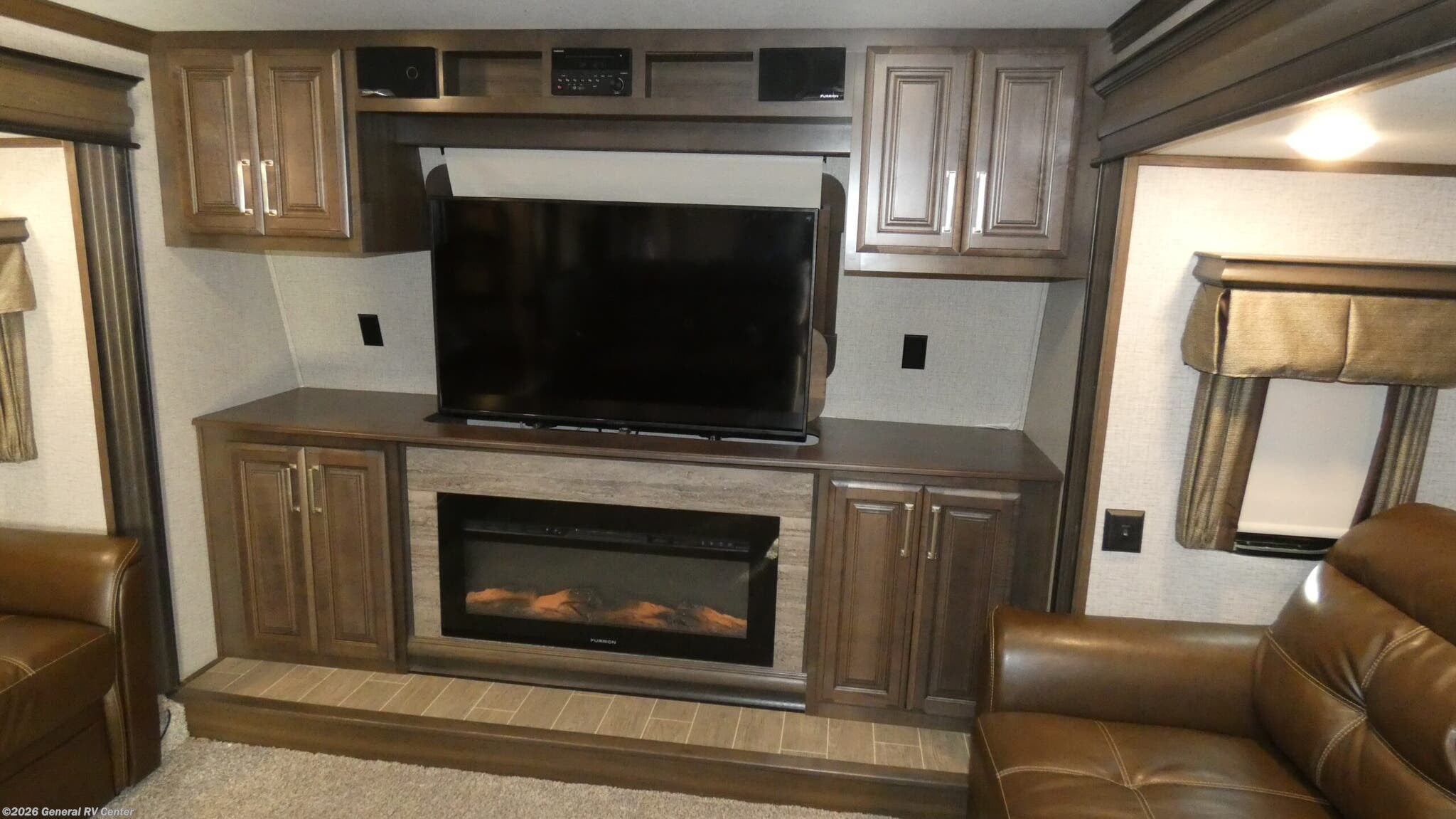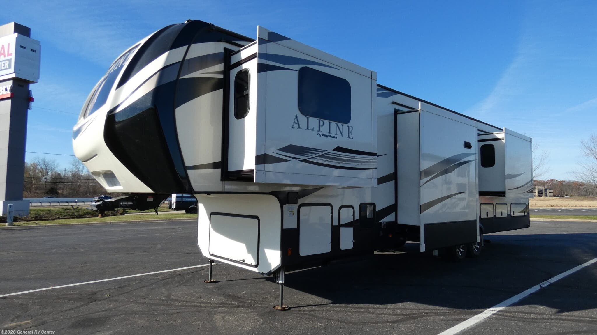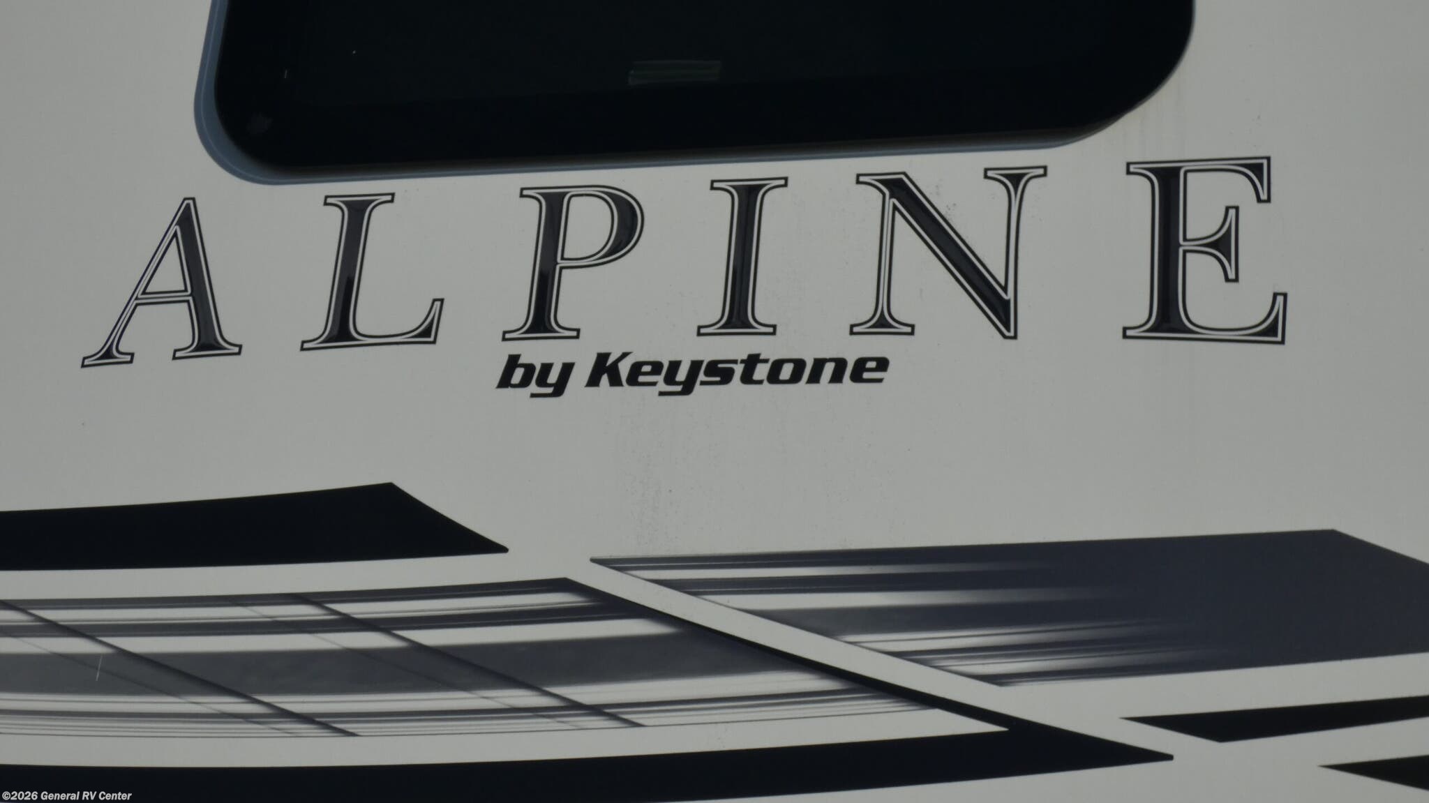 **Keystone RV Alpine fifth wheel 3701FL highlights:** - Kitchen Island - Five Slides - Full and Half Bath - Two Electric Awnings - Separate Living Room Come see just how fun and easy camping can be with this luxurious five-slide Alpine fifth wheel by Keystone RV. Getting ready for the day is easy with a large master bathroom that has two sinks, plenty of counter space, and a shower, and the second half bathroom is conveniently located just off of the kitchen. In the kitchen area, you will find dual opposing slides and all of the amenities you need to fix your favorite meals, such as a convection microwave, a two-burner range, and an 18 cubic foot refrigerator. Step up to the front living room where you will find two tri-fold sofa sleepers, theater seats, a fireplace, and an entertainment center with a 50" LED TV. When you choose an Alpine fifth wheel by Keystone RV, you are choosing luxury. The Whisper Air System is the quietest cooling system ever developed, and it keeps your RV at the perfect interior temperature no matter what the outside weather may bring. Every aspect of the Alpine has been designed to enhance your full-time camping experience, like the oversized pass-through storage which is the industry's largest at roughly 200 cubic feet, and the central vacuum system will help you keep your Alpine looking its best throughout each adventure. You will also love the Furrion RV Chef Collection that gives you the ability to cook with precision and consistency as you travel the country and helps you provide your guests with a higher level of cuisine during each camping trip.