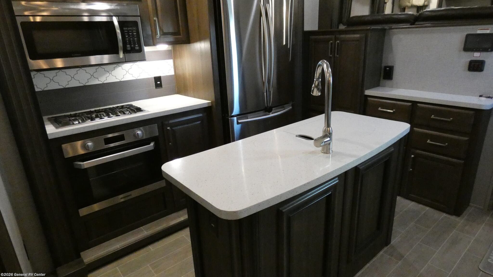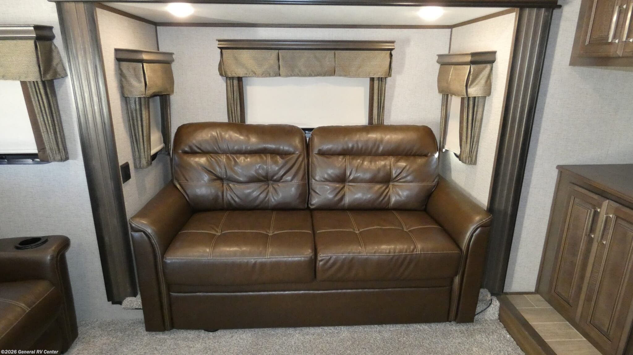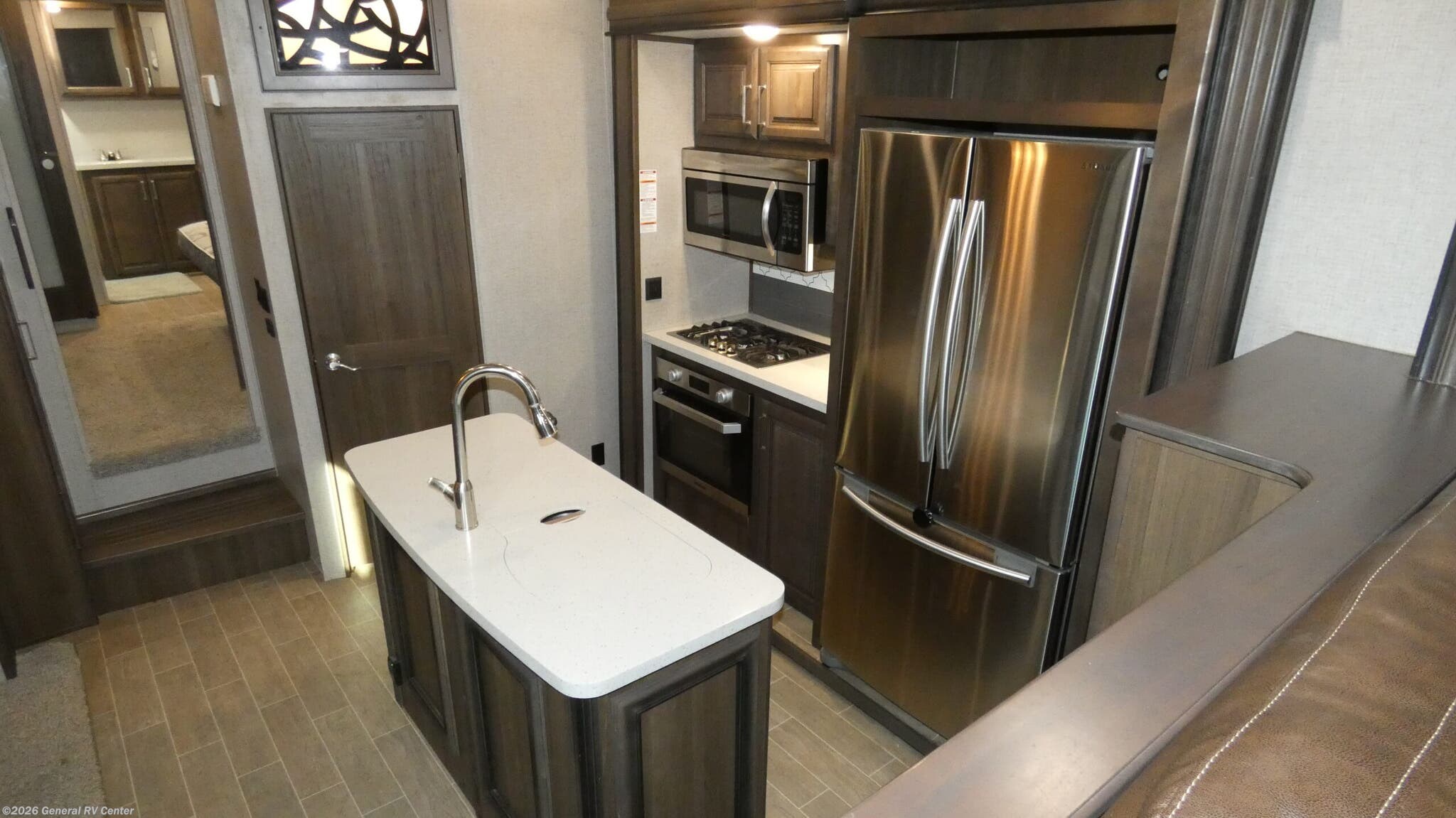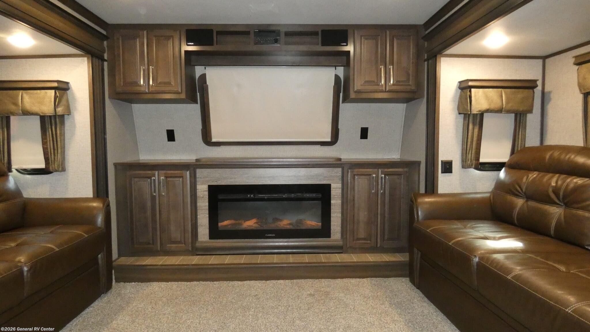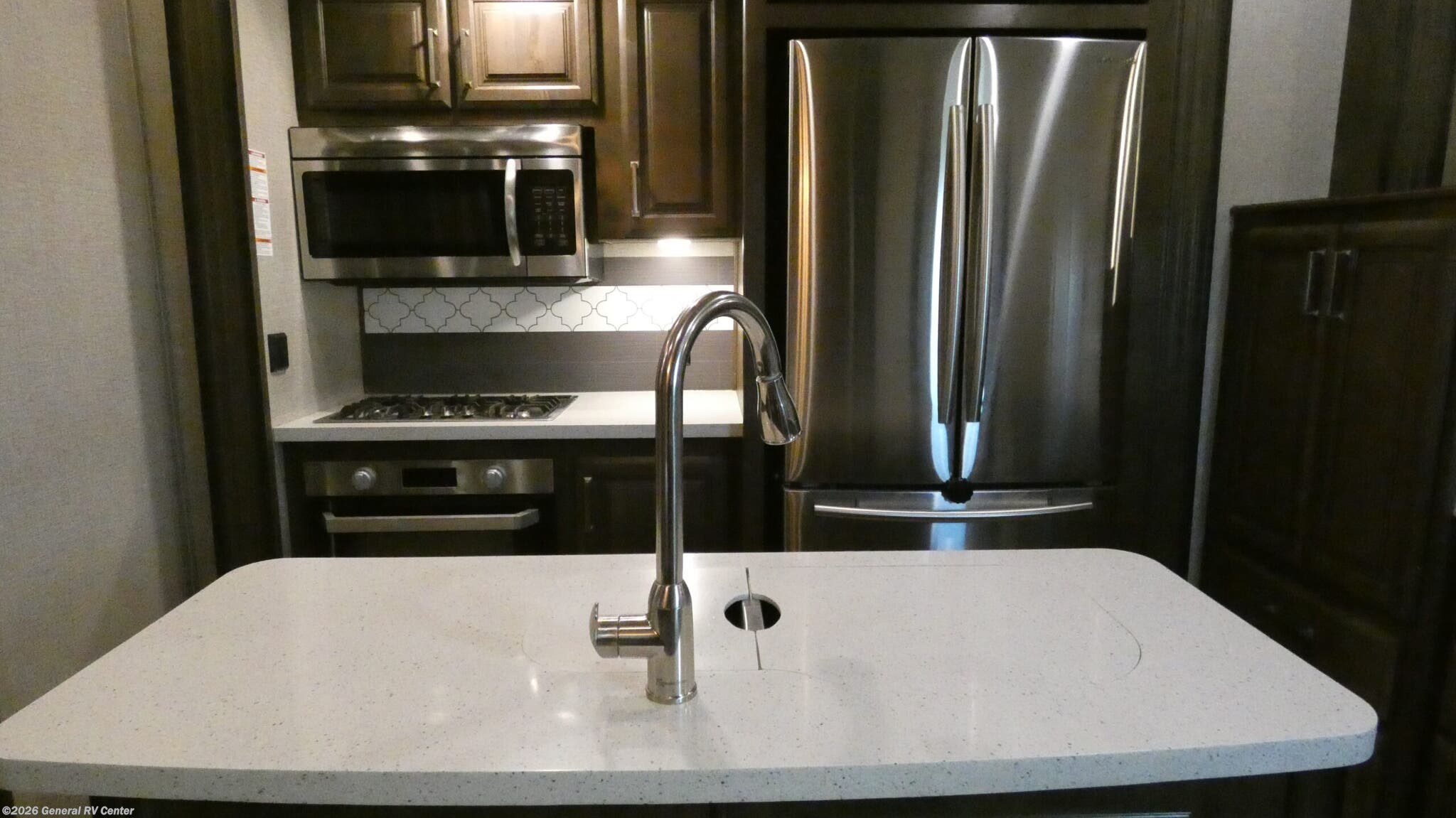 **Keystone RV Alpine fifth wheel 3701FL highlights:** - Kitchen Island - Five Slides - Full and Half Bath - Two Electric Awnings - Separate Living Room Come see just how fun and easy camping can be with this luxurious five-slide Alpine fifth wheel by Keystone RV. Getting ready for the day is easy with a large master bathroom that has two sinks, plenty of counter space, and a shower, and the second half bathroom is conveniently located just off of the kitchen. In the kitchen area, you will find dual opposing slides and all of the amenities you need to fix your favorite meals, such as a convection microwave, a two-burner range, and an 18 cubic foot refrigerator. Step up to the front living room where you will find two tri-fold sofa sleepers, theater seats, a fireplace, and an entertainment center with a 50" LED TV. When you choose an Alpine fifth wheel by Keystone RV, you are choosing luxury. The Whisper Air System is the quietest cooling system ever developed, and it keeps your RV at the perfect interior temperature no matter what the outside weather may bring. Every aspect of the Alpine has been designed to enhance your full-time camping experience, like the oversized pass-through storage which is the industry's largest at roughly 200 cubic feet, and the central vacuum system will help you keep your Alpine looking its best throughout each adventure. You will also love the Furrion RV Chef Collection that gives you the ability to cook with precision and consistency as you travel the country and helps you provide your guests with a higher level of cuisine during each camping trip.