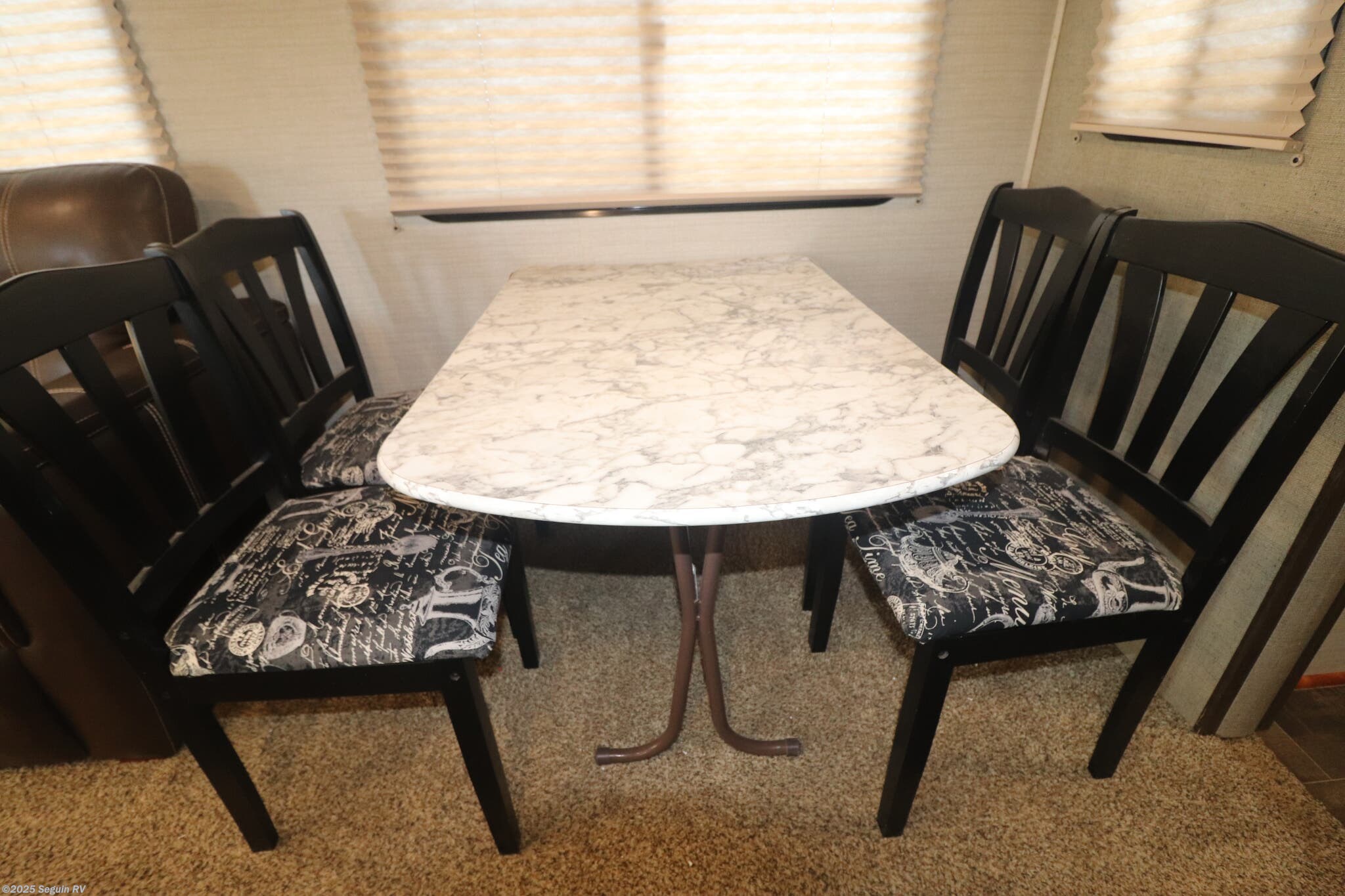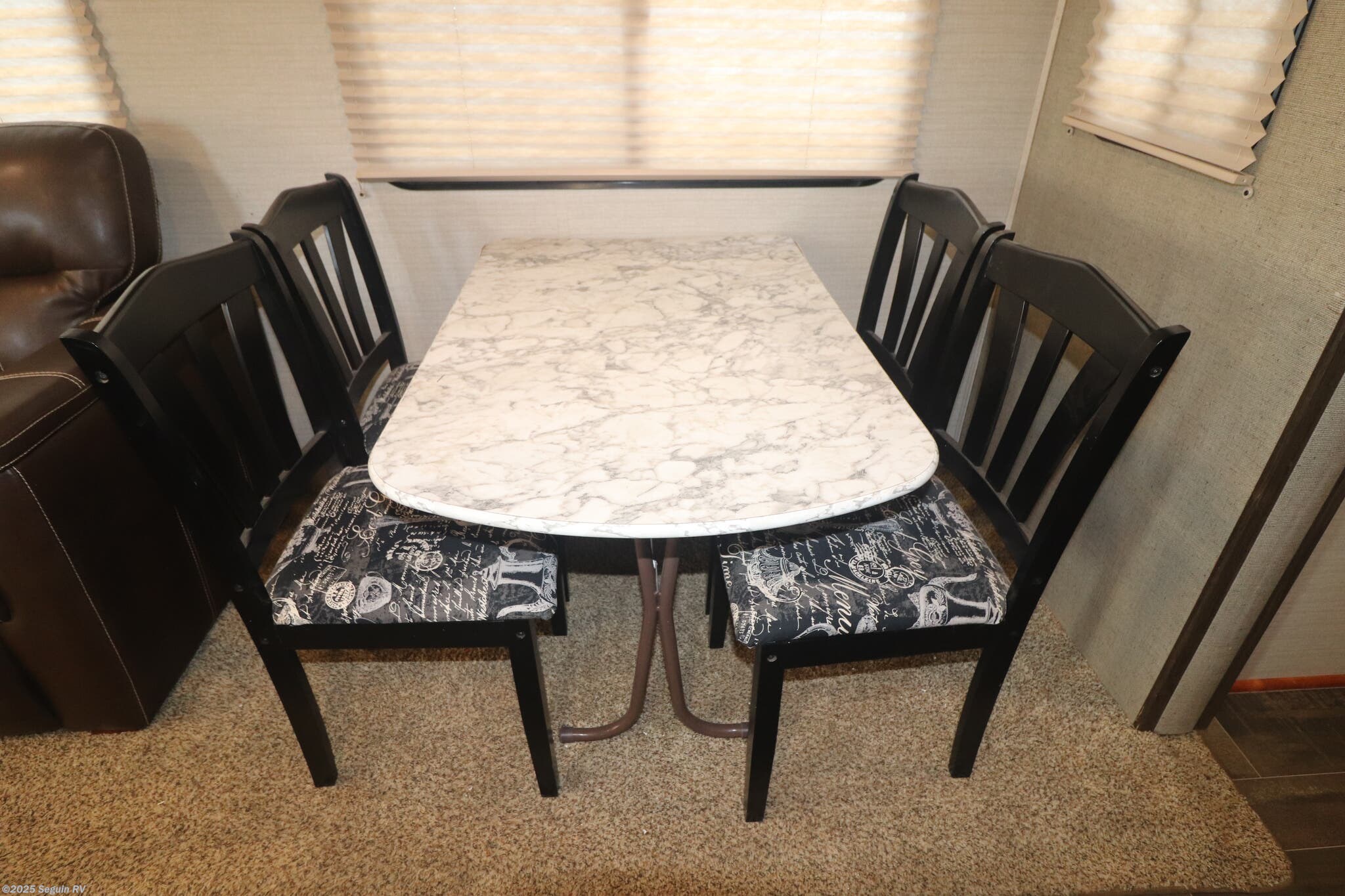 - Two lounge chairs, a 68" sofa, and a booth dinette for versatile seating