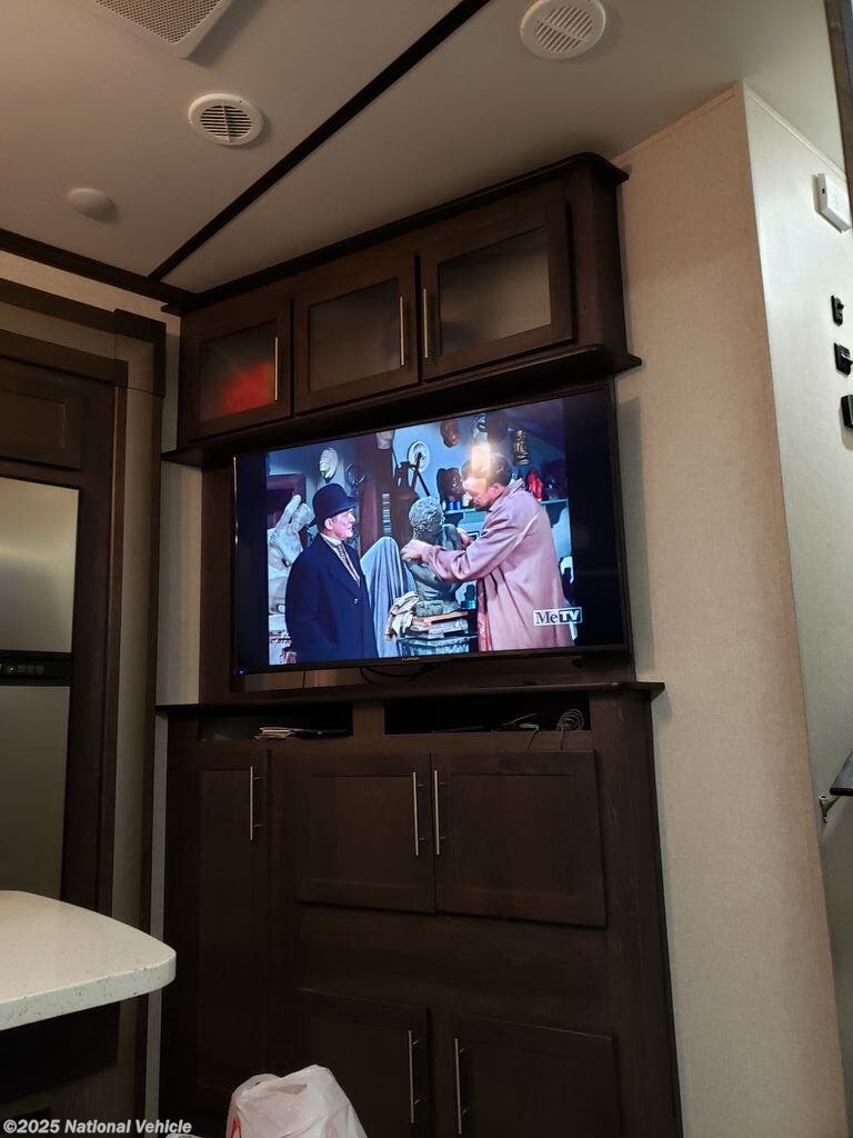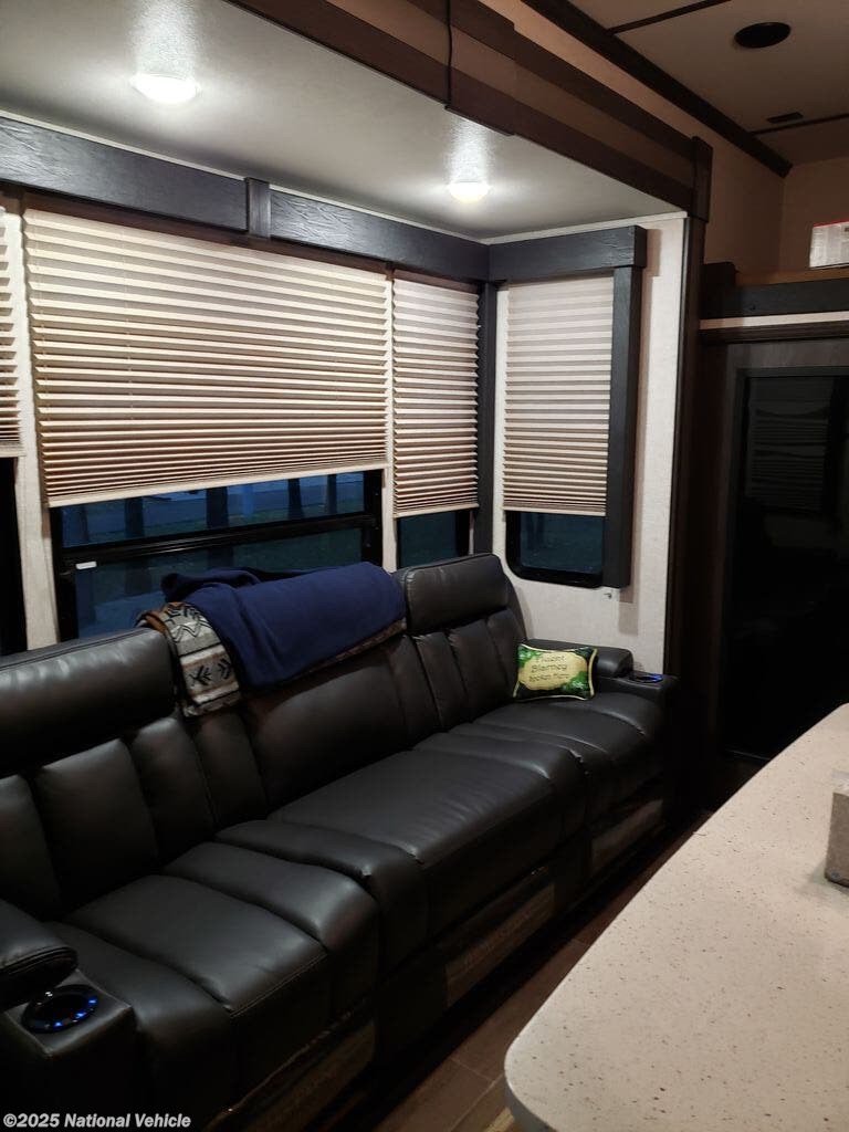 Inside, the Carbon 357 offers an inviting, contemporary living area with reclining seating, a full entertainment center, and a modern kitchen equipped with solid-surface counters, abundant storage, stainless-steel appliances, and a large refrigerator to keep you stocked for every trip. The open layout ensures everyone has room to relax after a day on the trails.