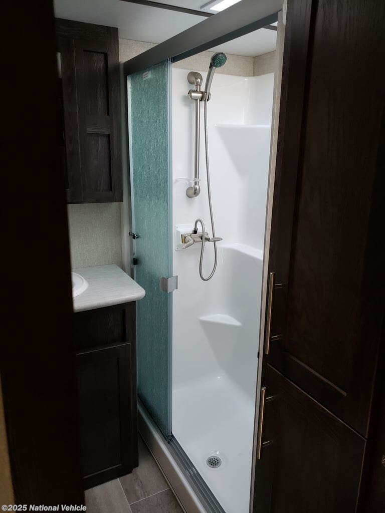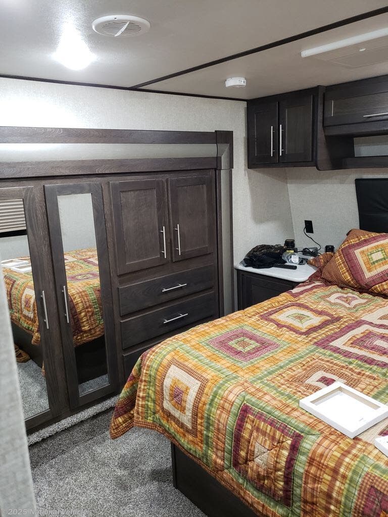 The private front bedroom provides a peaceful retreat, featuring a walk-around queen bed, wardrobe storage, and easy access to the spacious bathroom with a large shower and premium fixtures. Climate control systems, high-capacity tanks, and sturdy construction make this fifth wheel ideal for extended stays and all-season exploring.