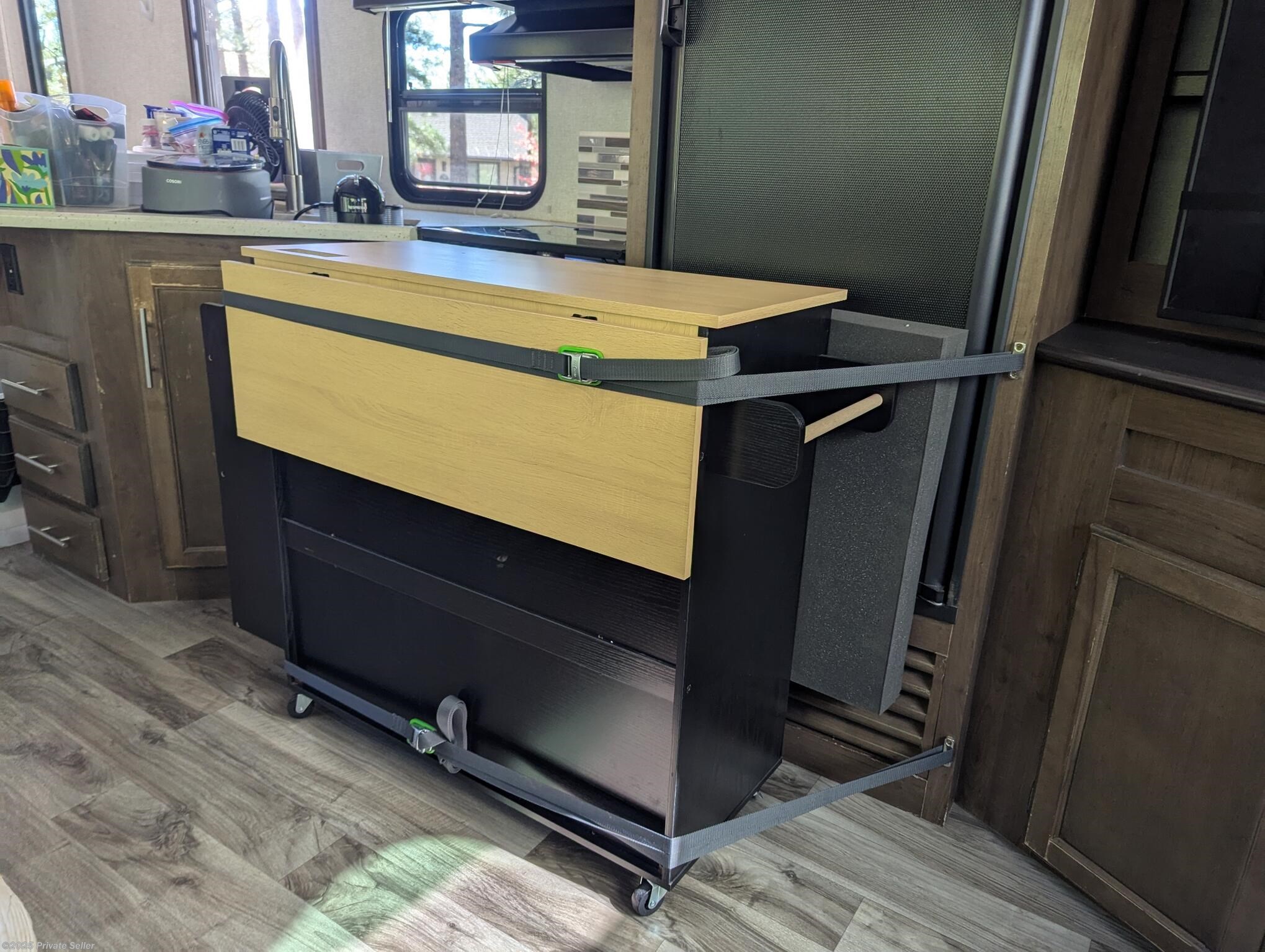 - Kitchen Island, moveable, secures to front of cabinets when on the road. Easily removed if not wanted