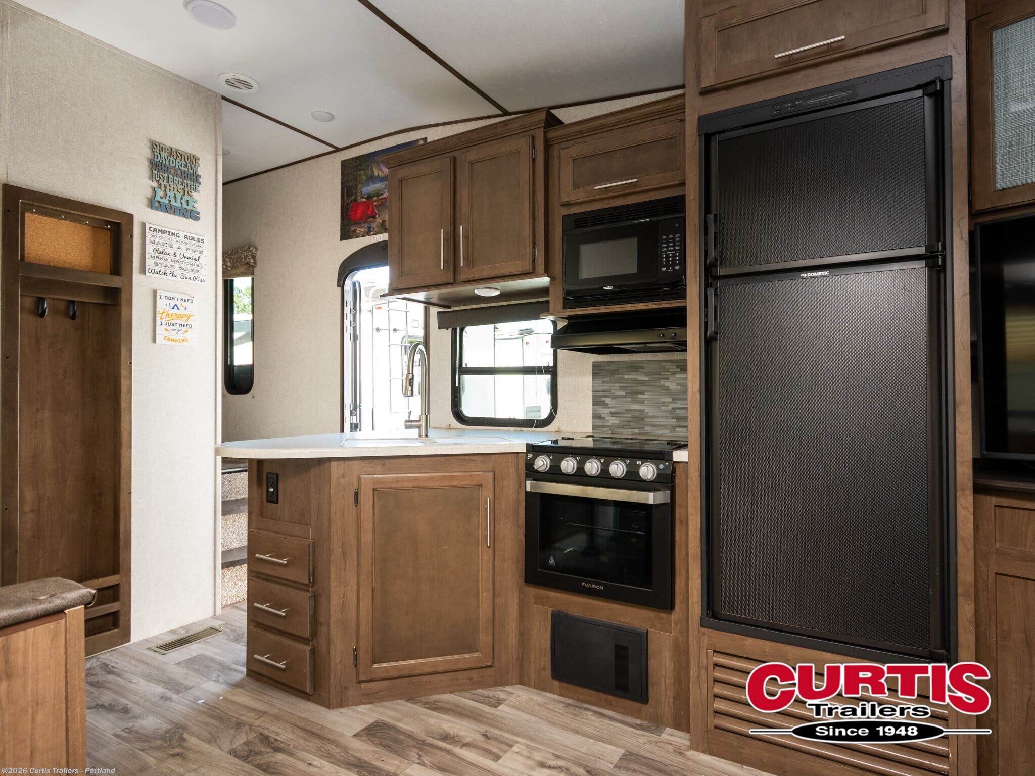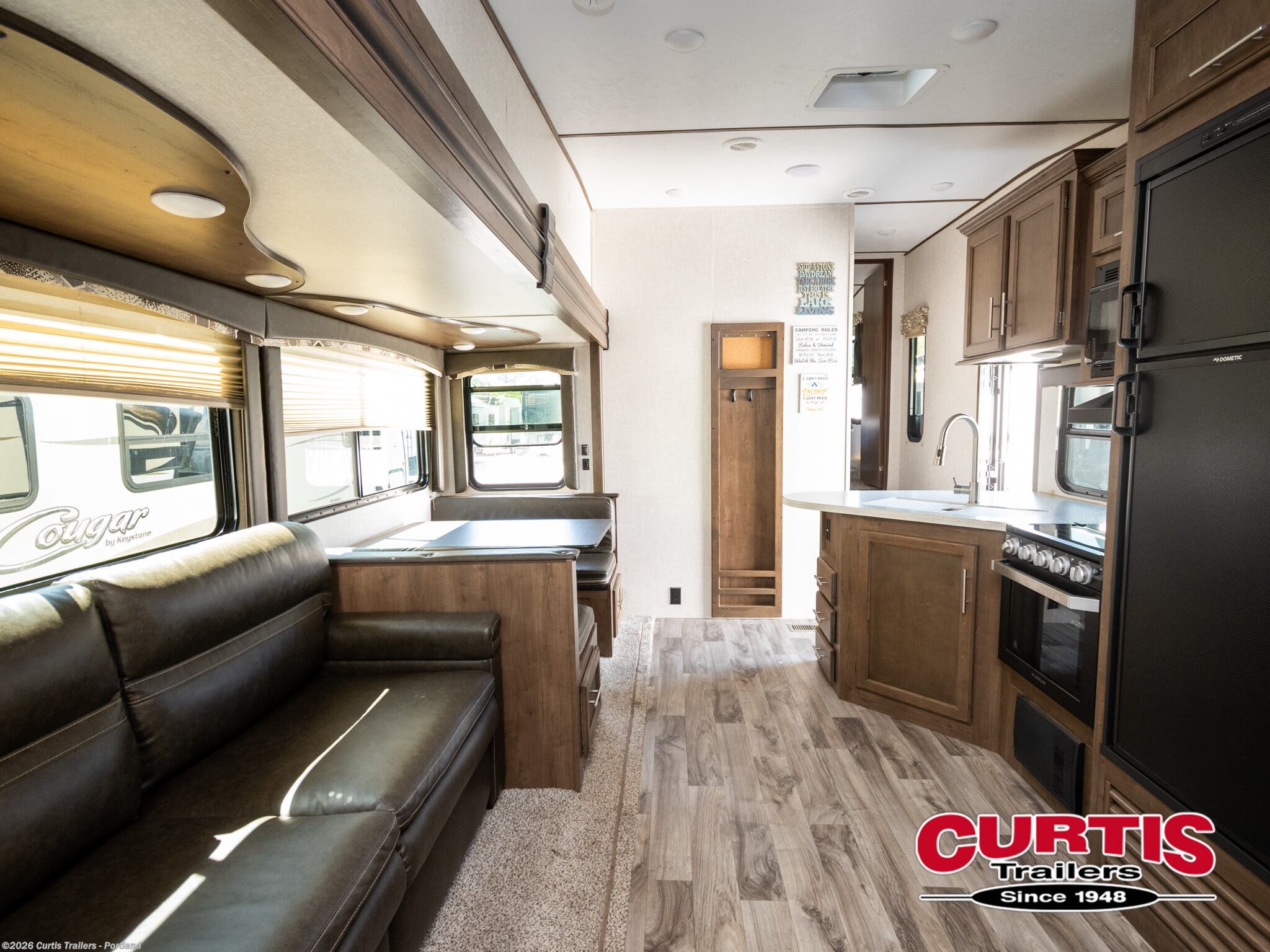 If your wish list includes a bunkhouse in your next fifth wheel then stop and take a look at this Cougar Half-Ton. The front master bedroom and rear bunkhouse provide separation from you and the kids when everyone is wanting their own space. If you have two kiddos or four sleepy campers, the double size bunk beds allow you that sleeping space. You will appreciate more interior walking around room in the living/kitchen area and the front bedroom just like you imagined with two slides. You have the choice of cooking inside, or outside on the capital grill, and storing your drinks in the mini refrigerator. The Hitch Vision backup mirror provides a safe and easy way to hitch up and park at home or at your favorite campsite, who wouldn t desire that! Load up and head out! With any Keystone Cougar Half-Ton fifth wheel you will be able to camp in any weather with the forced-air heated and enclosed underbelly with enclosed dump valves and astorfoil insulated slide floor. If you need to stay cool or warm, these units have you covered. Each interior includes oversized panoramic windows that are fully ventilated, the KeyTV which is a multi-source signal controller, and new modern interior styling with pillow-top seating, a fold-flat sofa and dimmable lighting. You are sure to appreciate the iN-Command Generation 3 with Global Connect giving owners total control over power, slides, awnings, HVAC and more. Choose your favorite model today!
