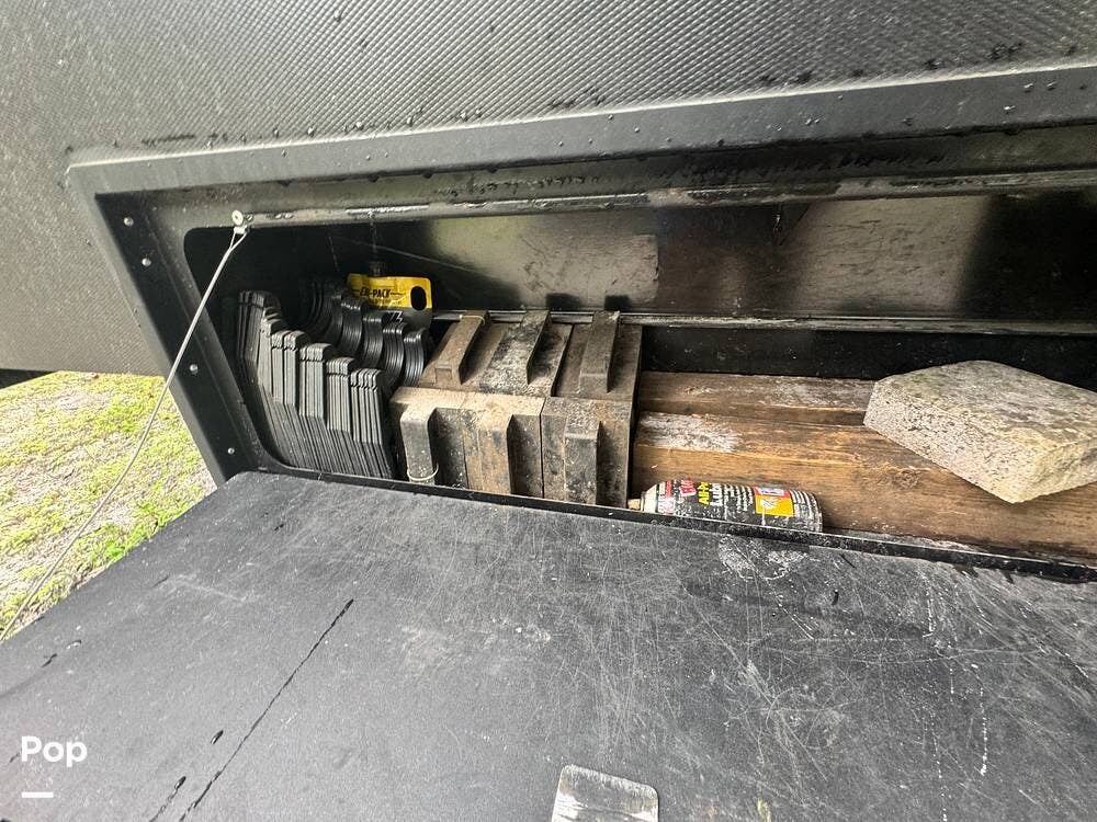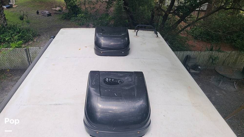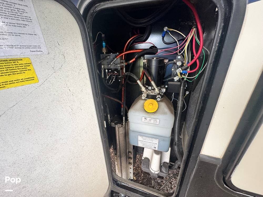 Interior amenities include an 11-foot garage area w awning over decking, an In-Command control system, three air conditioners, one and a half bathrooms with a shower (in the full bathroom), 4 televisions, laundry washer/dryer hookups, and a fireplace beneath an entertainment center.