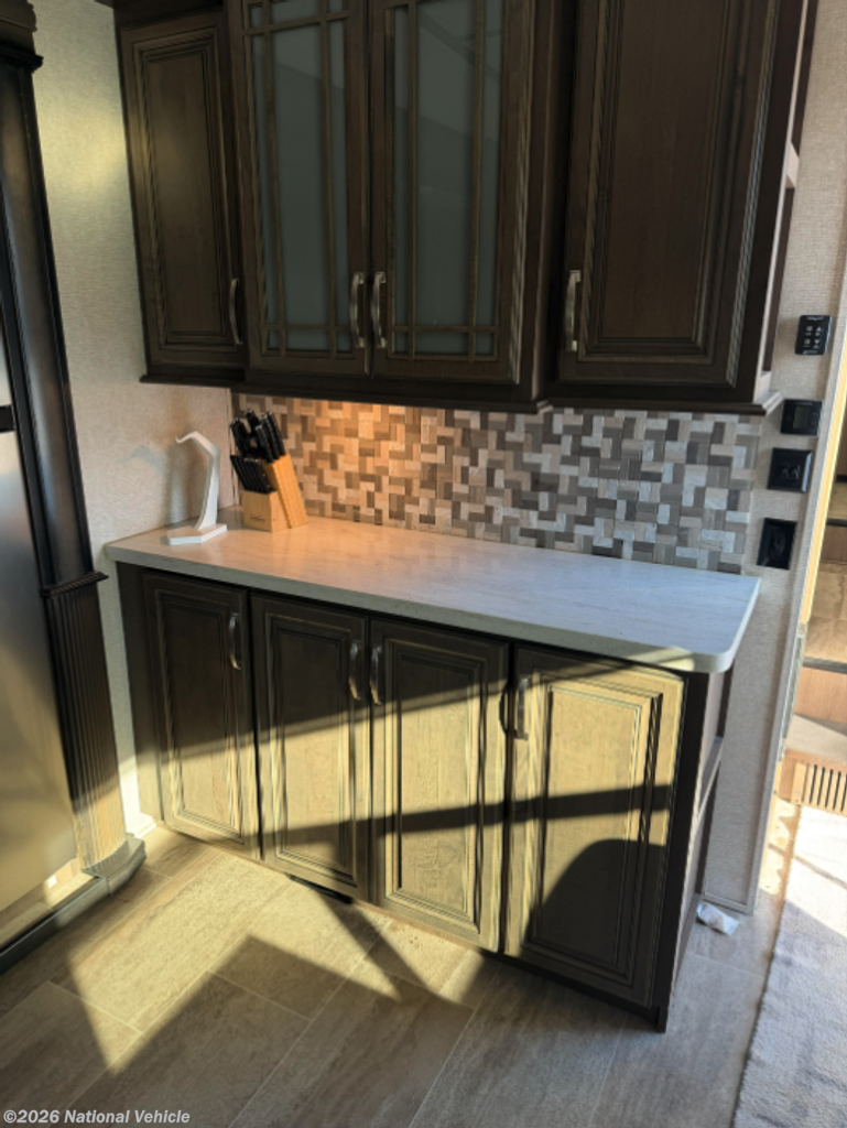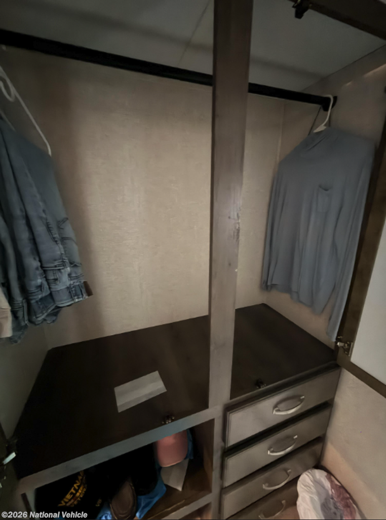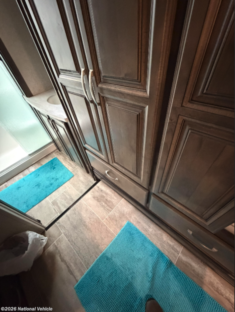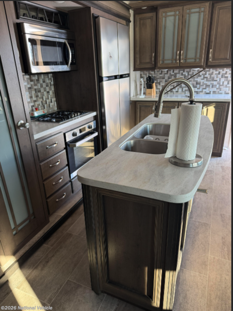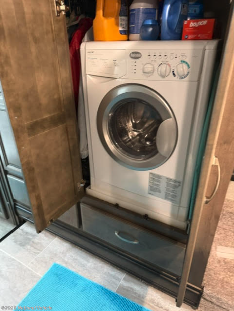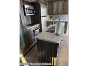 The gourmet kitchen is a true highlight, featuring solid-surface countertops, a residential-style convection microwave, and abundant storage throughout. The center island offers generous prep space and a polished, upscale look, making meal prep effortless whether you?re on a weekend getaway or extended stay. A combo washer/dryer is seamlessly integrated, providing unmatched convenience for full-time or long-term travel.
