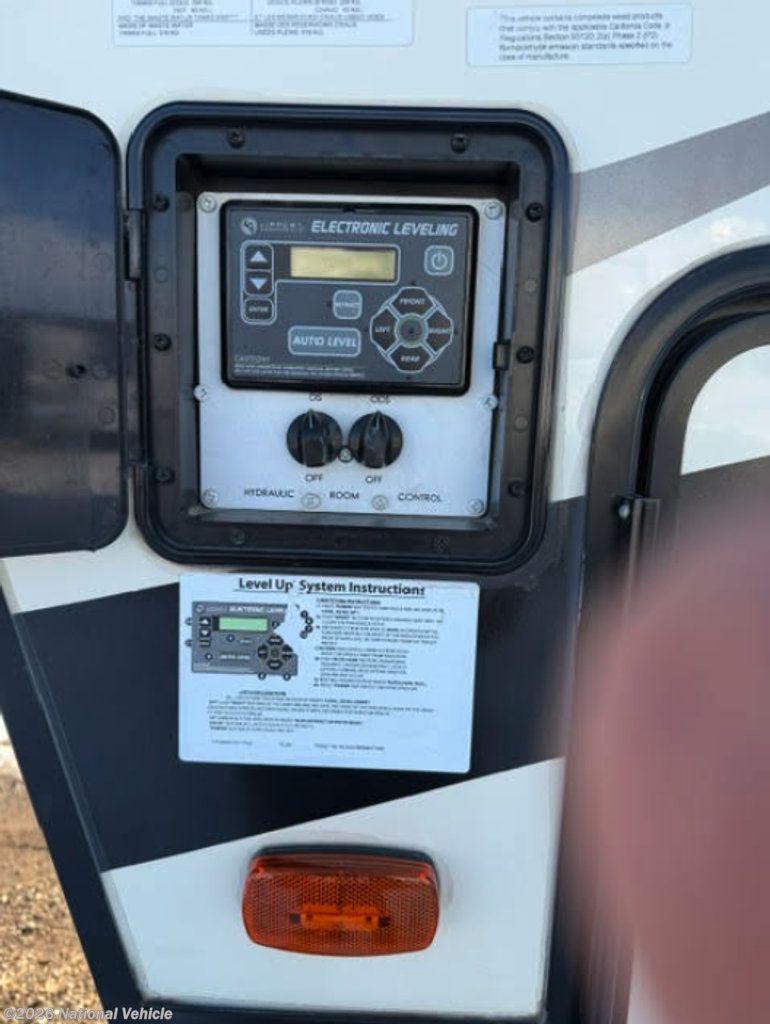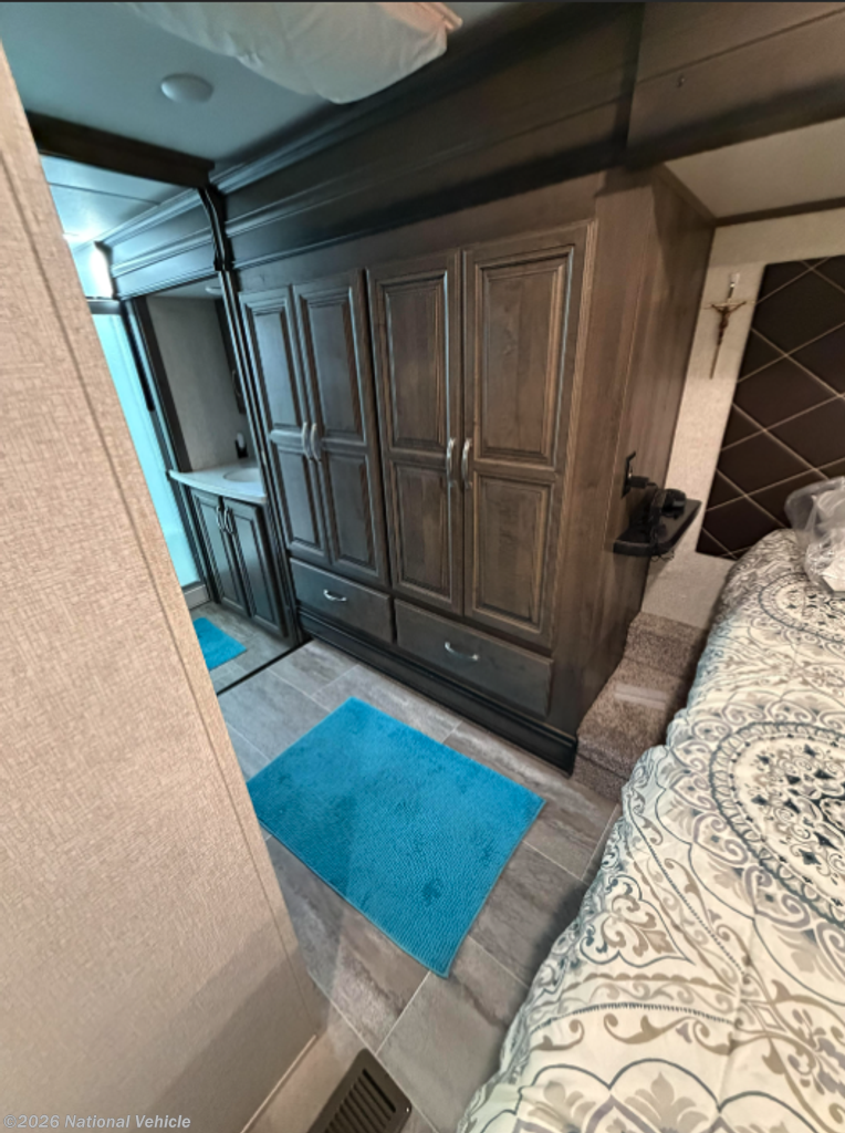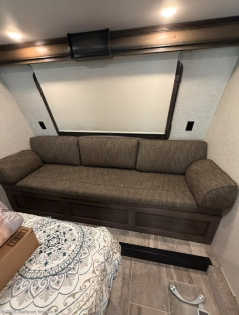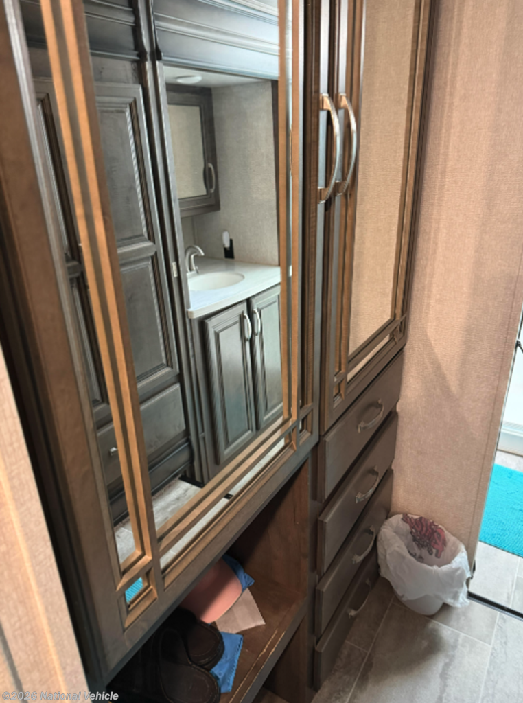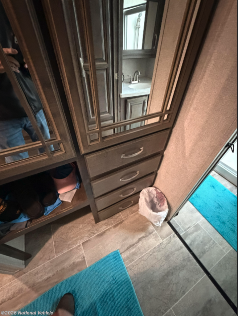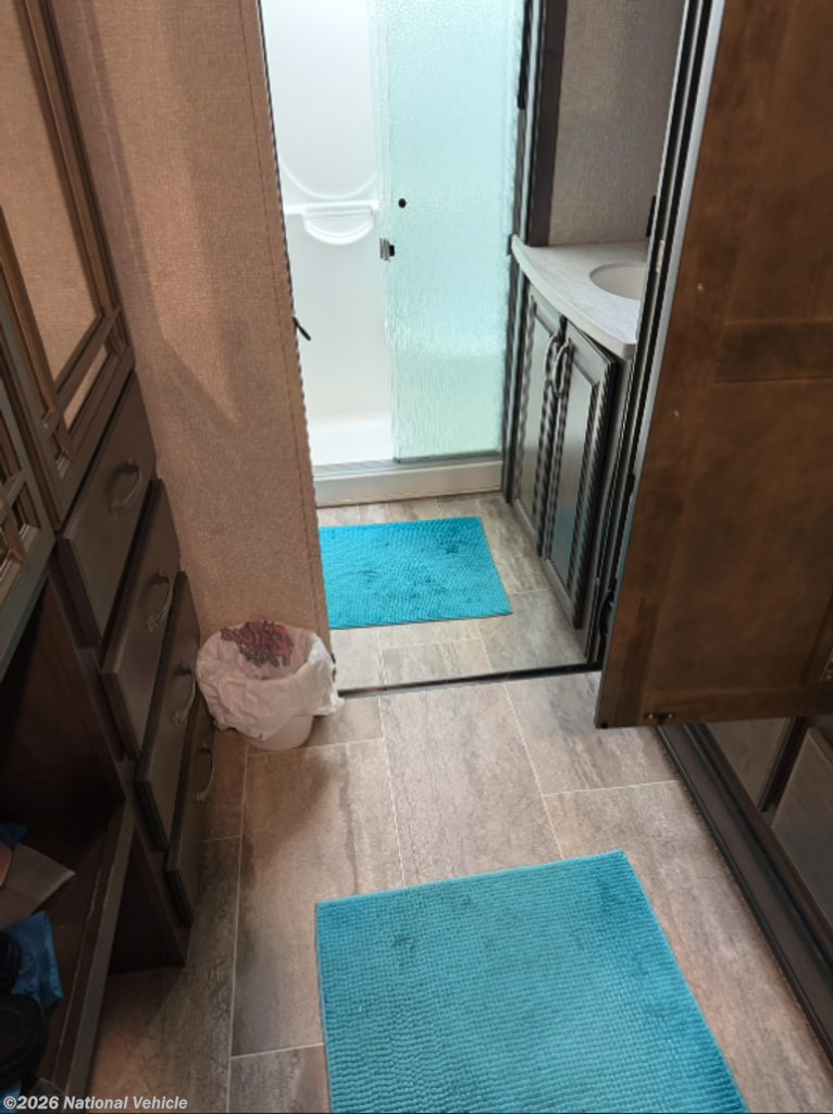 The gourmet kitchen is a true highlight, featuring solid-surface countertops, a residential-style convection microwave, and abundant storage throughout. The center island offers generous prep space and a polished, upscale look, making meal prep effortless whether you?re on a weekend getaway or extended stay. A combo washer/dryer is seamlessly integrated, providing unmatched convenience for full-time or long-term travel.