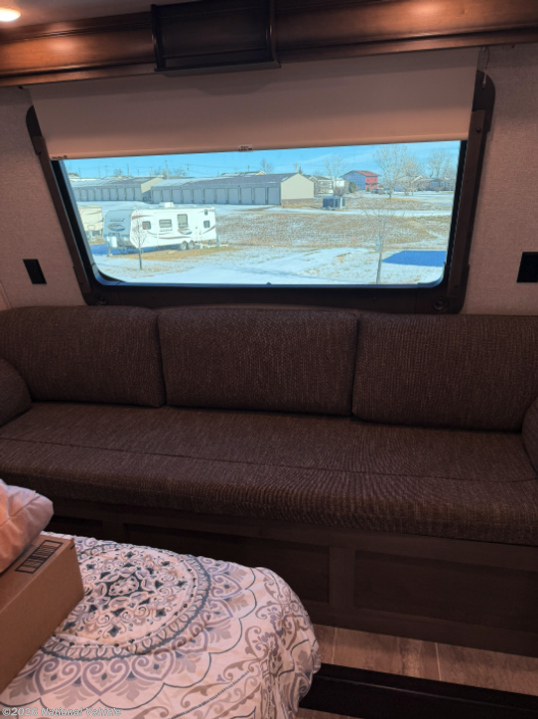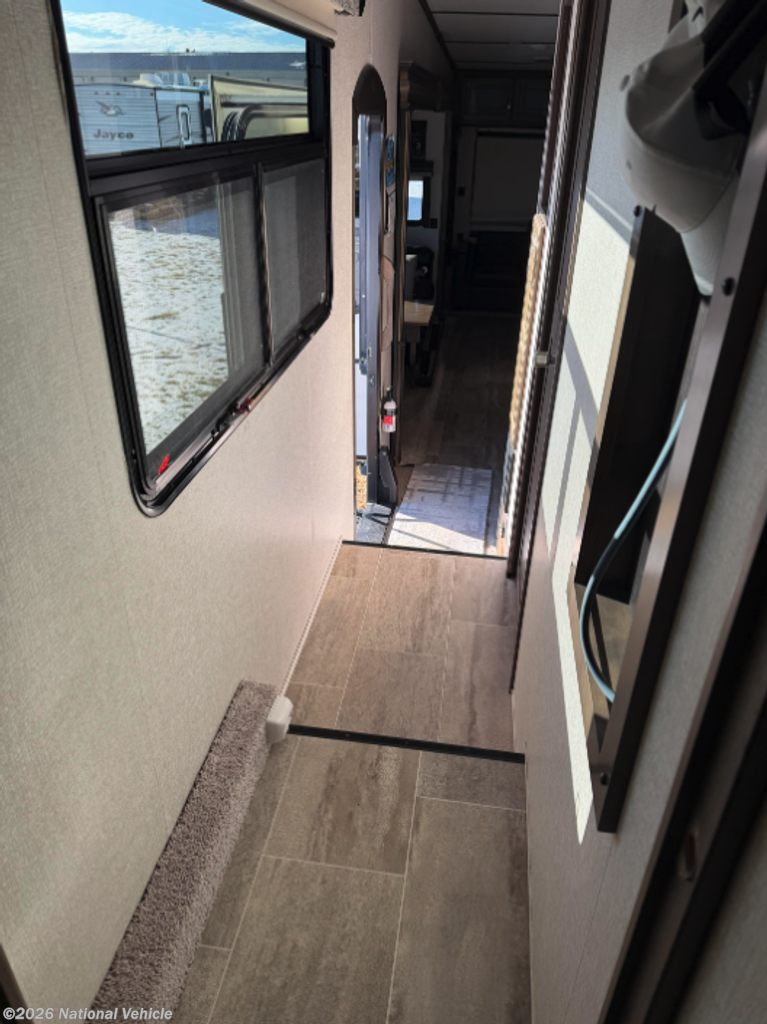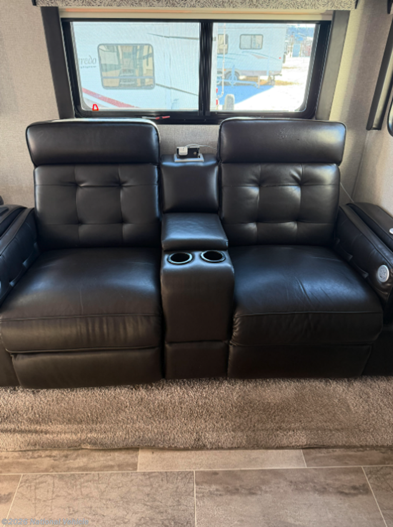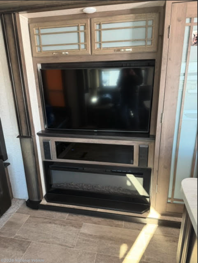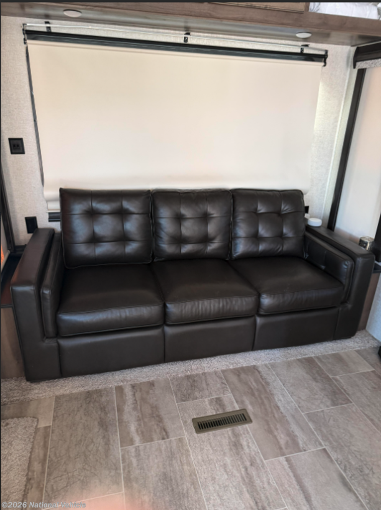 From the moment you enter, the rear living floorplan welcomes you with expansive opposing slides, creating a wide-open living space ideal for both entertaining and relaxing. Plush seating, rich wood cabinetry, and designer lighting elevate the interior, while large panoramic windows flood the space with natural light.
