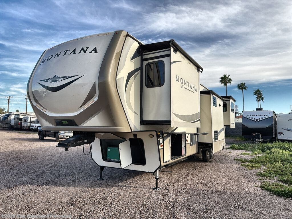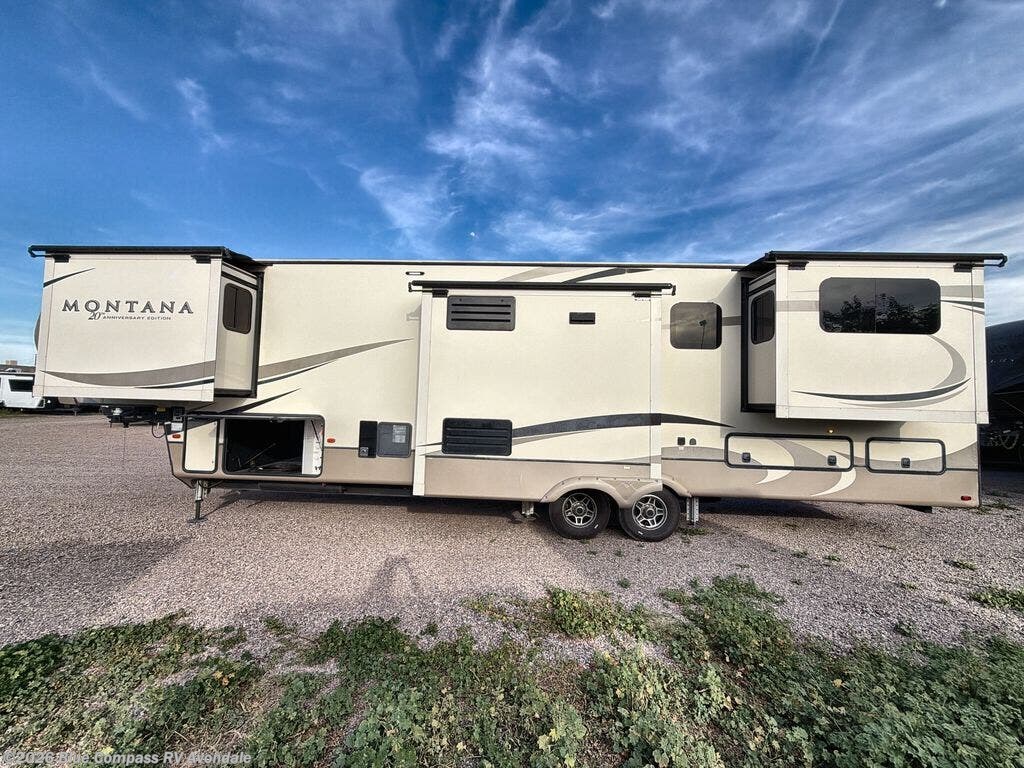 When packing for your next trip in a Keystone Montana luxury fifth wheel you will appreciate the enormous drop frame pass-through storage compartment, the MORyde "Step Above" entry steps with strut assist, and the LED light package including "super-bright" taillights with backup marker and off-door scare light. The Montana 20th Anniversary Edition adds exclusive features such as the Key TV satellite prep, color-coded wiring, Tru-fit slide construction, and a Dometic power channel awning with free accessory. You will love the new designed front fiberglass cap with upgraded graphics, the LED motion sensor light in the pass-through compartment and convenience center, plus the Four Season Living package allowing you to travel whenever you like. It's time to find the luxury fifth wheel you can enjoy for years to come, choose a Montana by Keystone today!