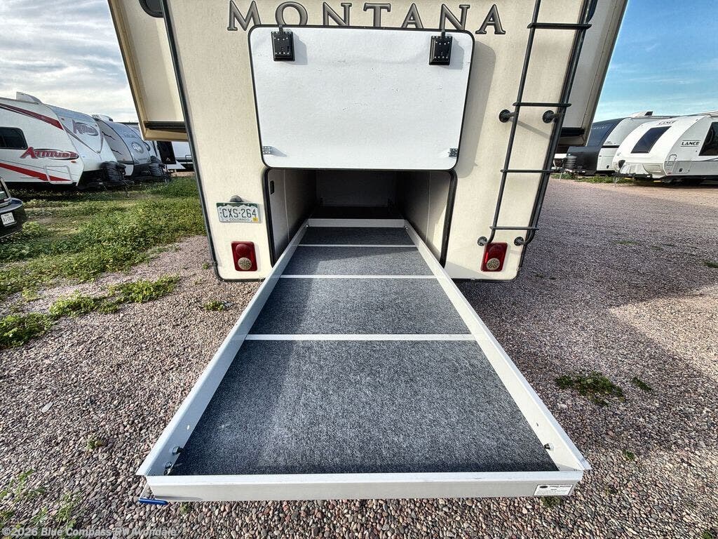If you want your own space to cook, your own space to watch TV, and your own private bedroom, take a look at this Montana fifth wheel. This layout offers a rear living and entertaining room with plenty of seating including dual hide-a-bed sofas and theatre seats with power recliners. Imagine everyone gathered around the HDTV and fireplace to talk about their day, watch a movie, or relax for a while in the warm indoors. The kitchen offers a separate space to make and eat meals. You will find a center island, an 18 cu. ft. RV refrigerator, a convection microwave, and a pantry, plus more. There is inside storage throughout for your clothes, camping gear, and kitchen cookware. And outside there is exterior compartments including a slide out storage tray.