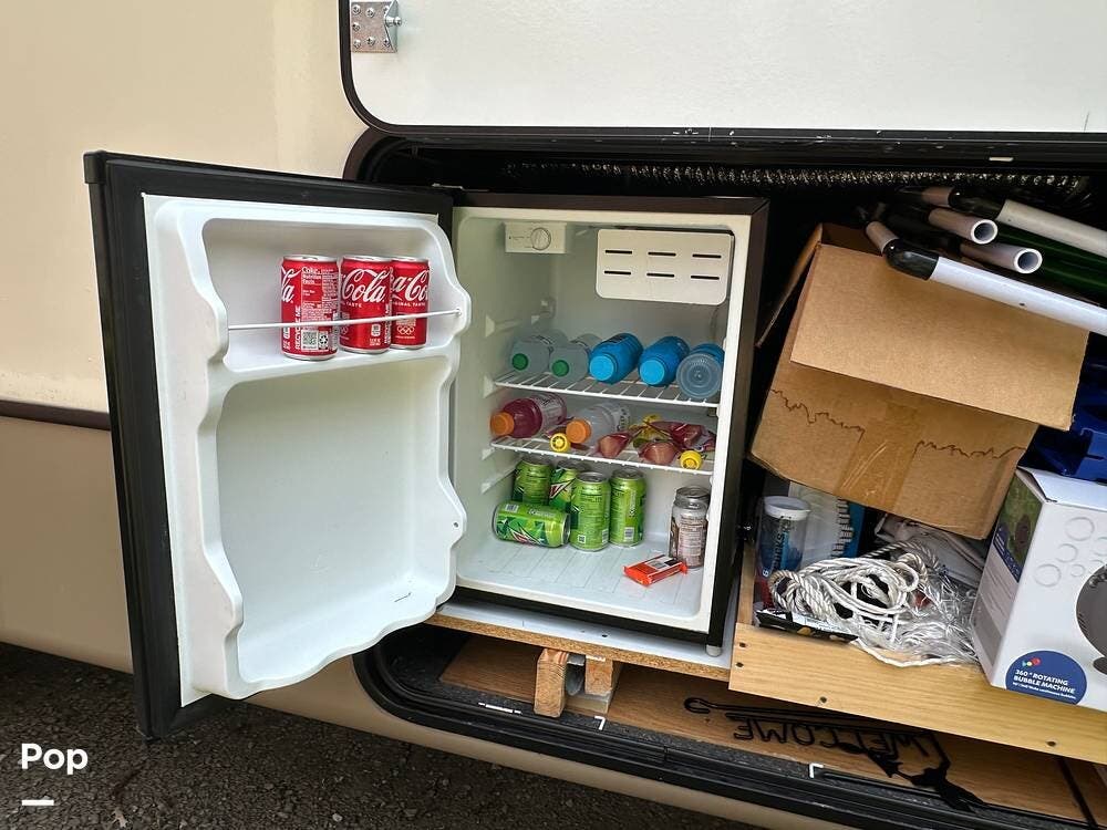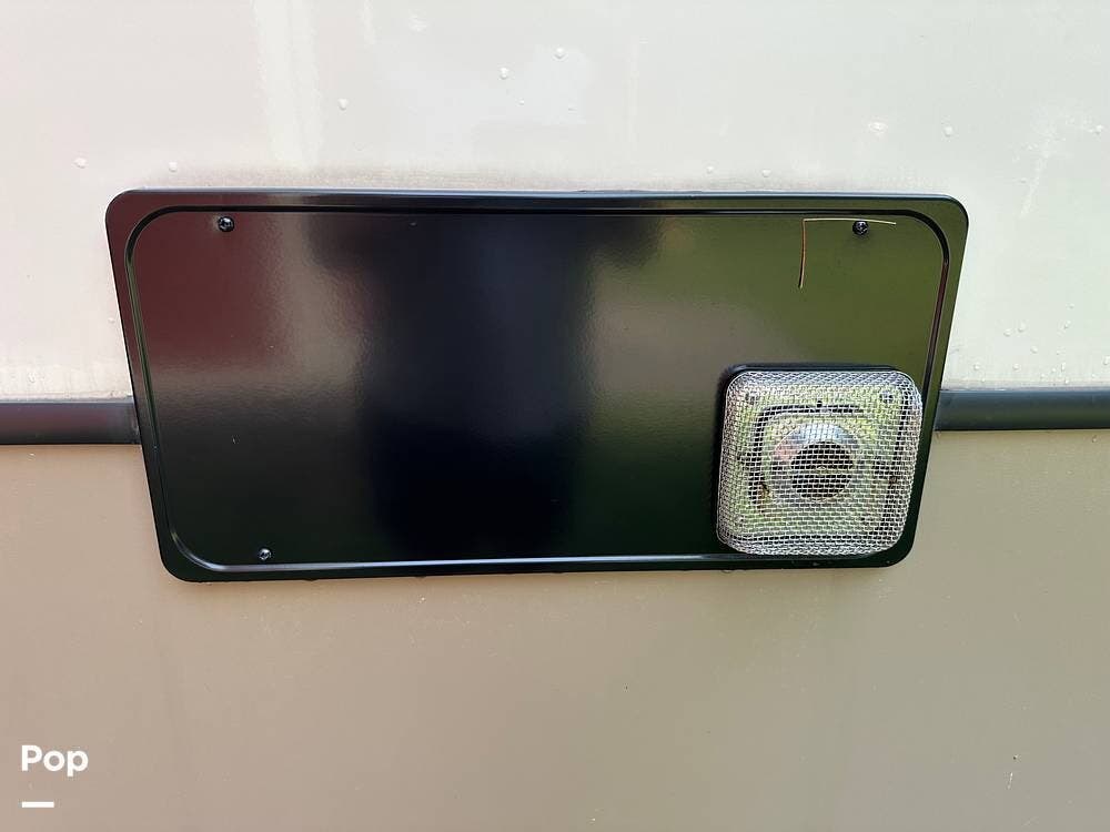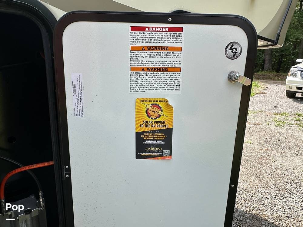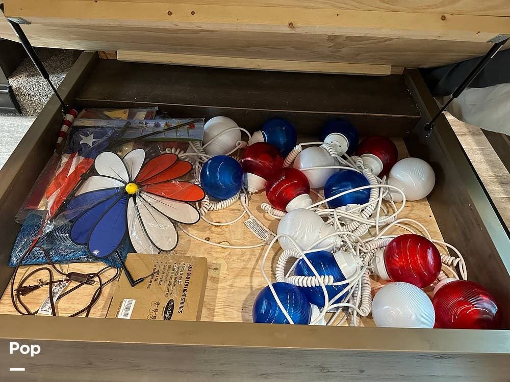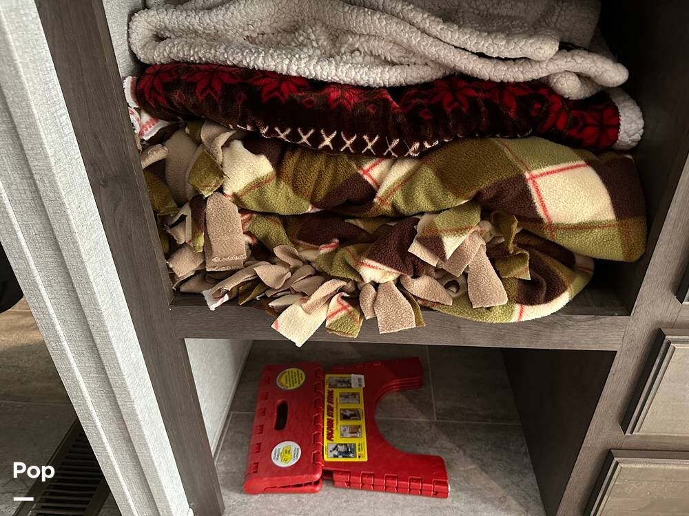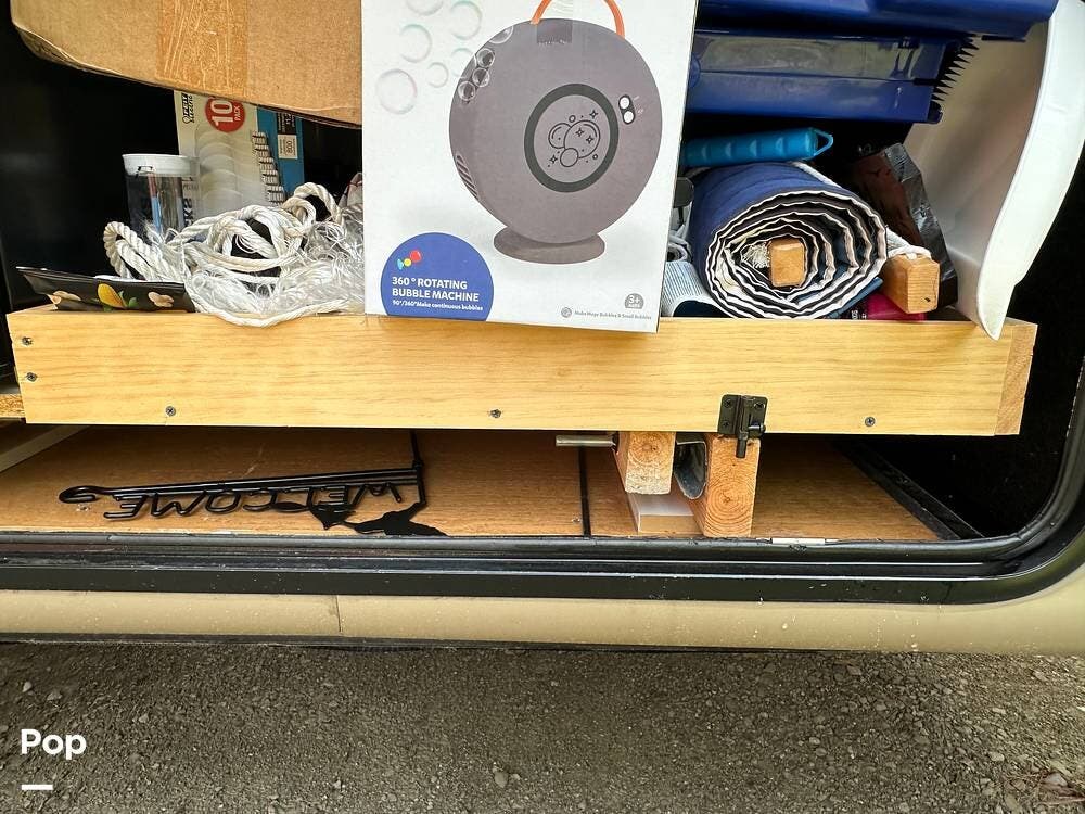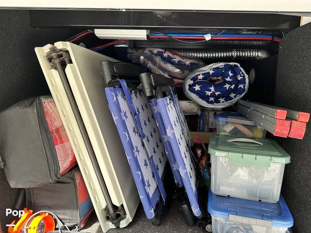 There is a large pass-through storage area with a docking station, outdoor shower, mini refrigerator, and homemade wood pull-out drawer. Two awnings for plenty of shade. Roof ladder and spare tire. Four seasons package for camping year-round.