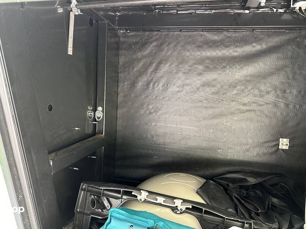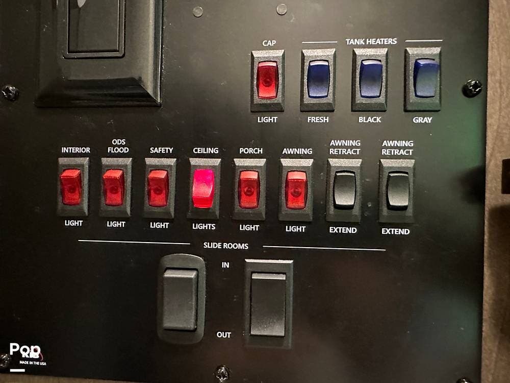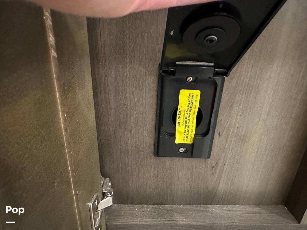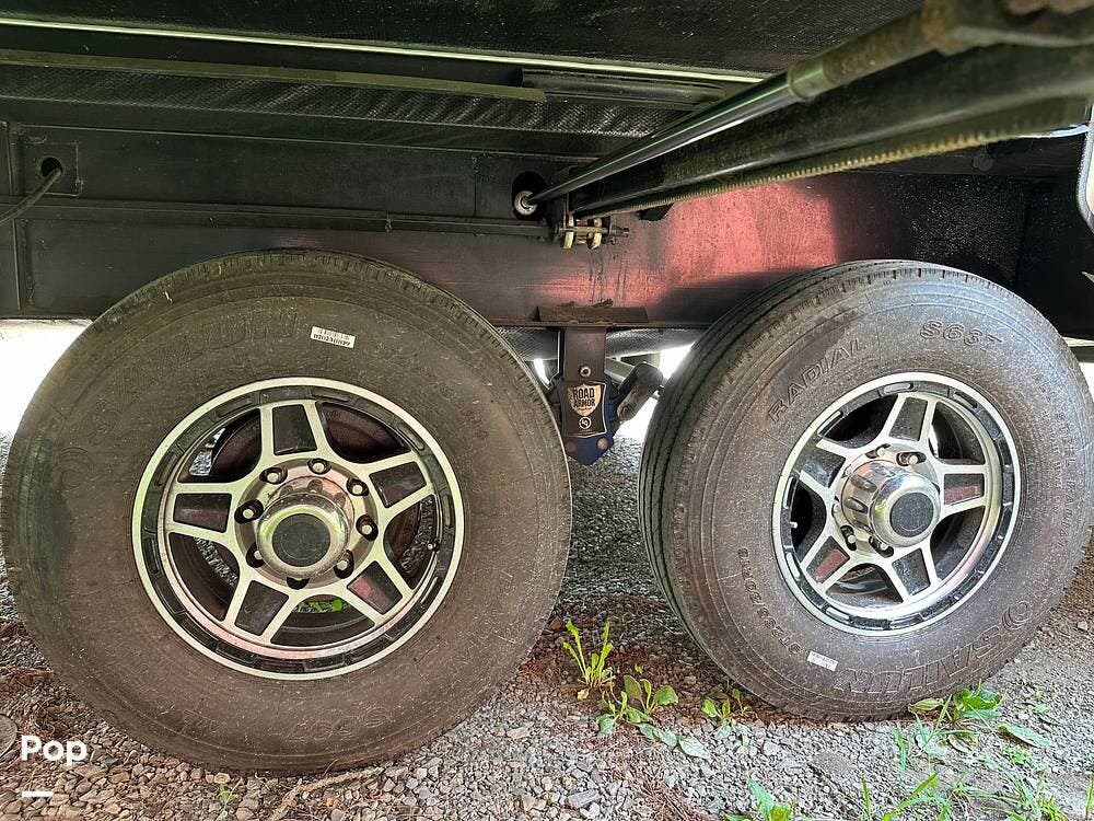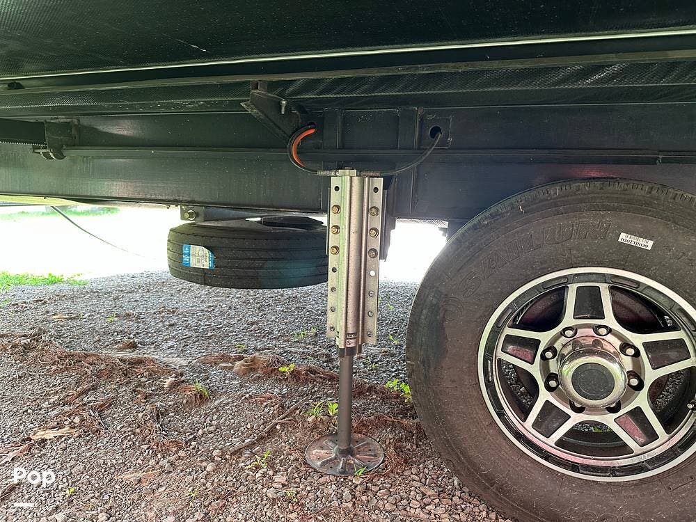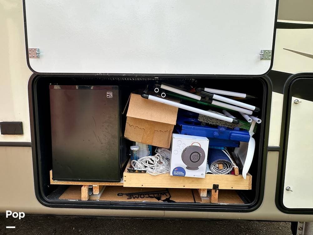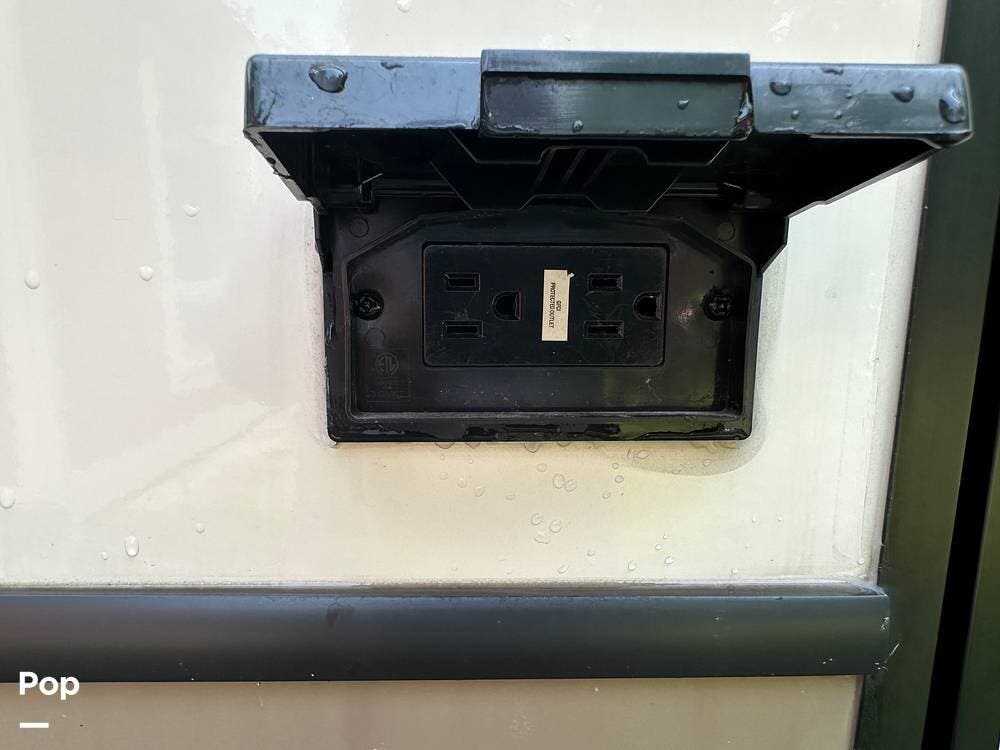 There is a large pass-through storage area with a docking station, outdoor shower, mini refrigerator, and homemade wood pull-out drawer. Two awnings for plenty of shade. Roof ladder and spare tire. Four seasons package for camping year-round.