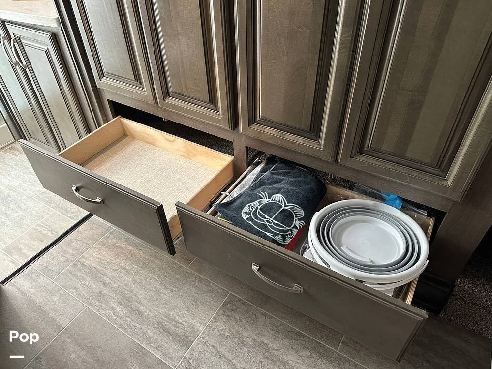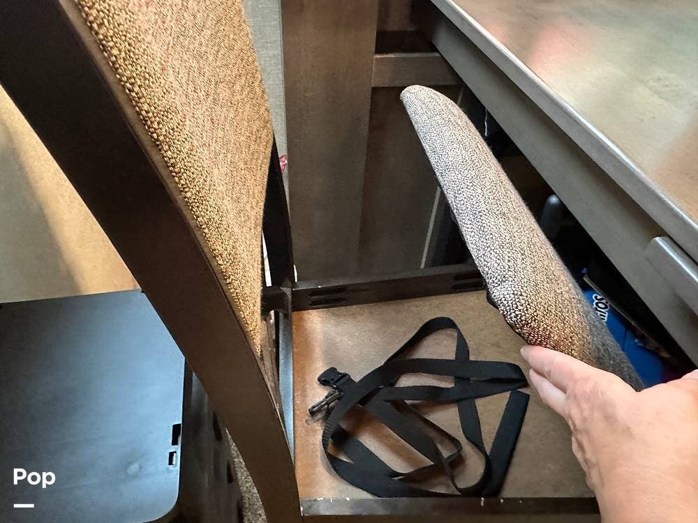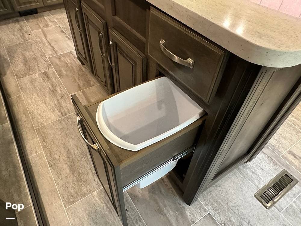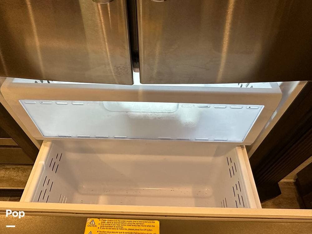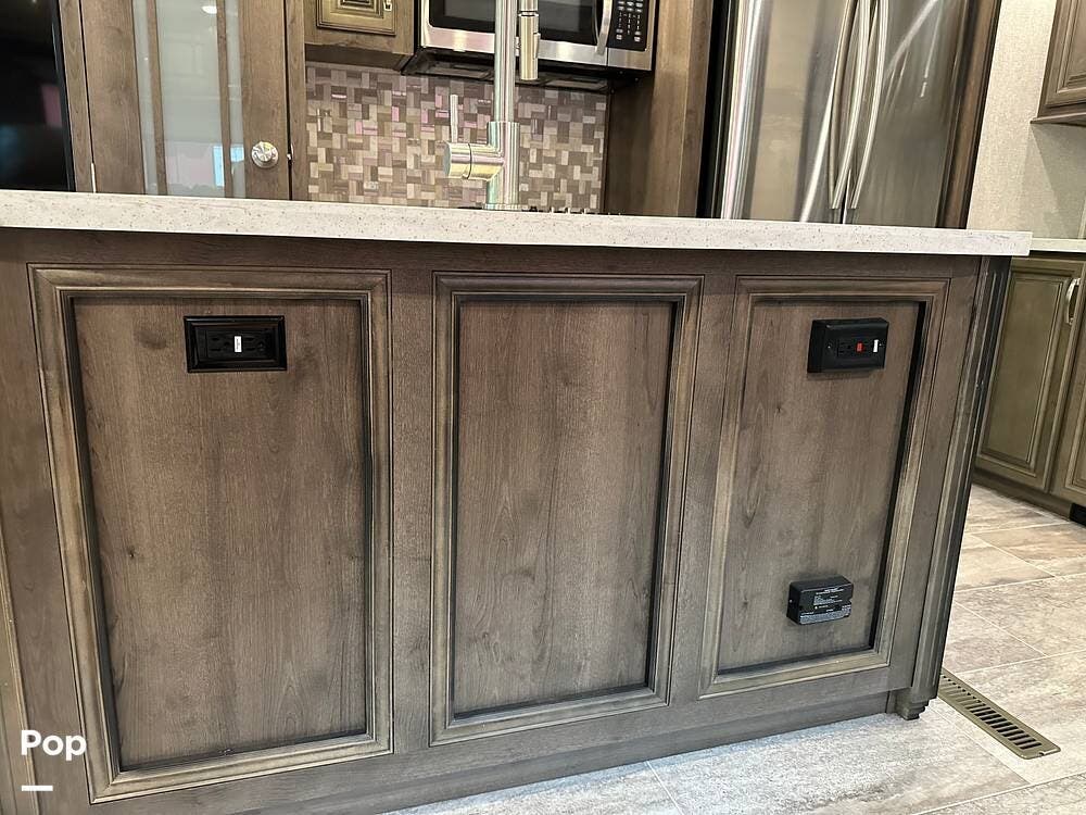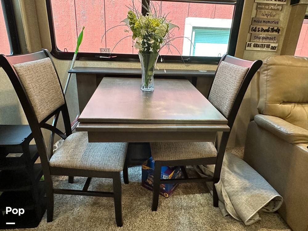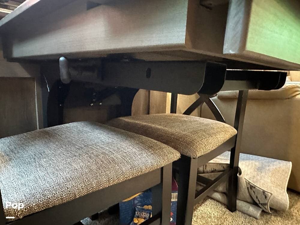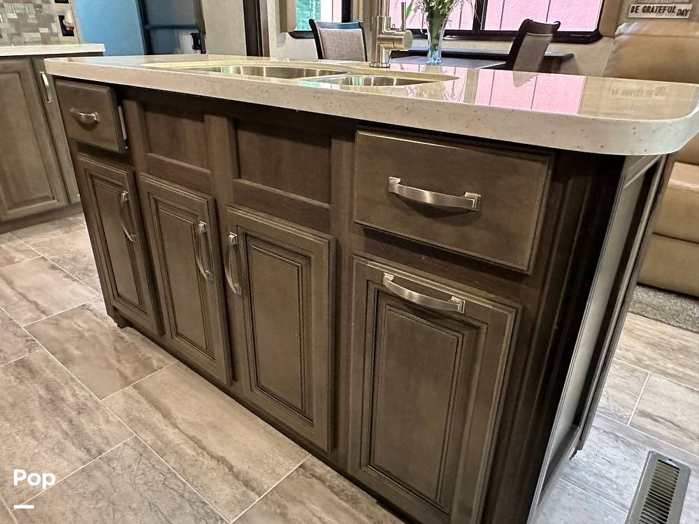 The kitchen has an island with a double sink, stove, oven, refrigerator/freezer, ice maker, pantry, buffet area, and plenty of storage. The dining area has an extension table and four chairs. Also has two pop-up charging stations and a central vacuum system. Has a removable lock for the refrigerator when traveling.