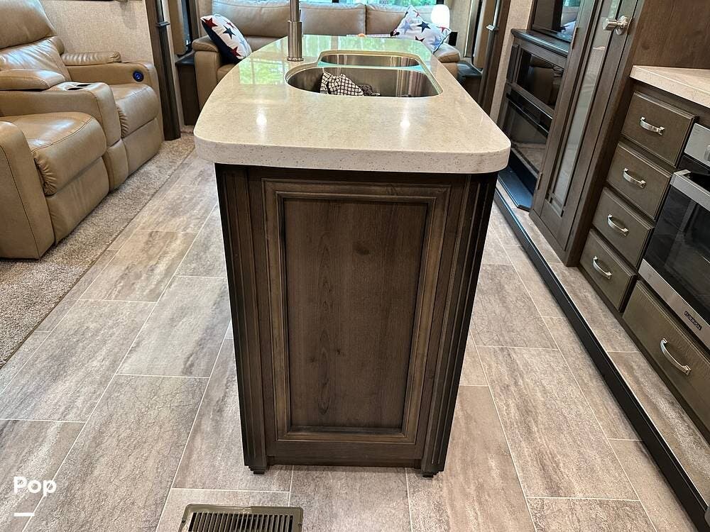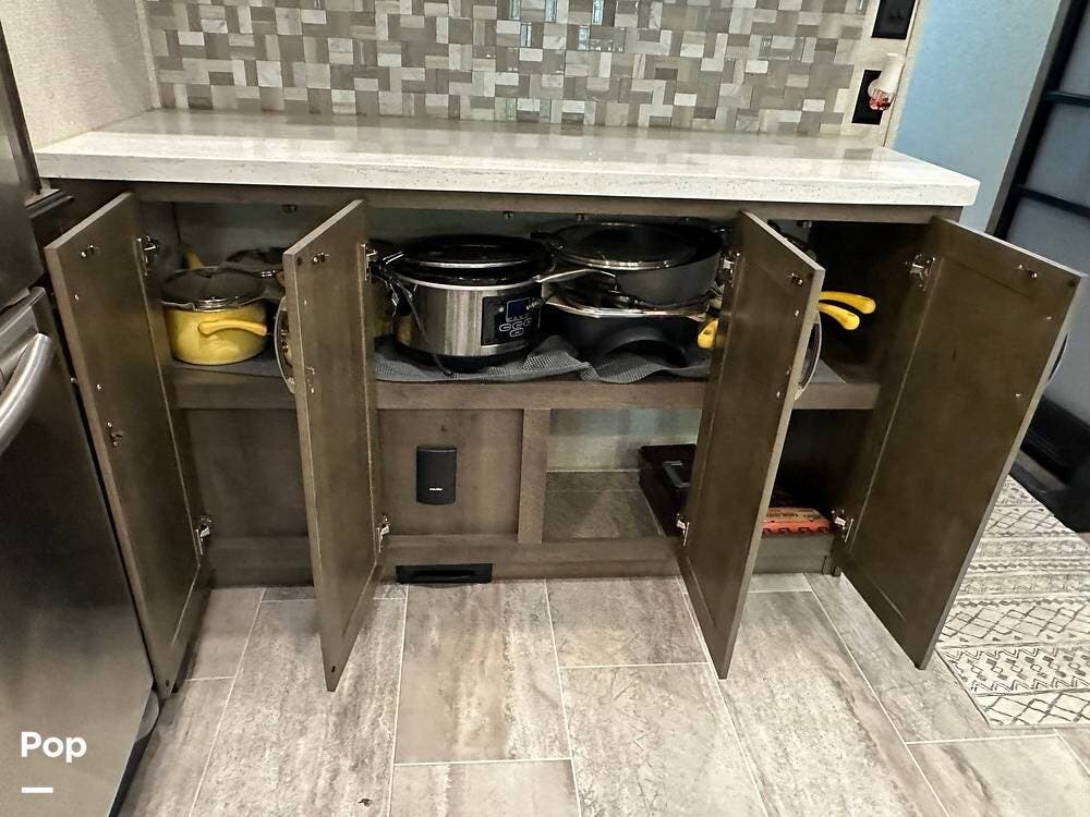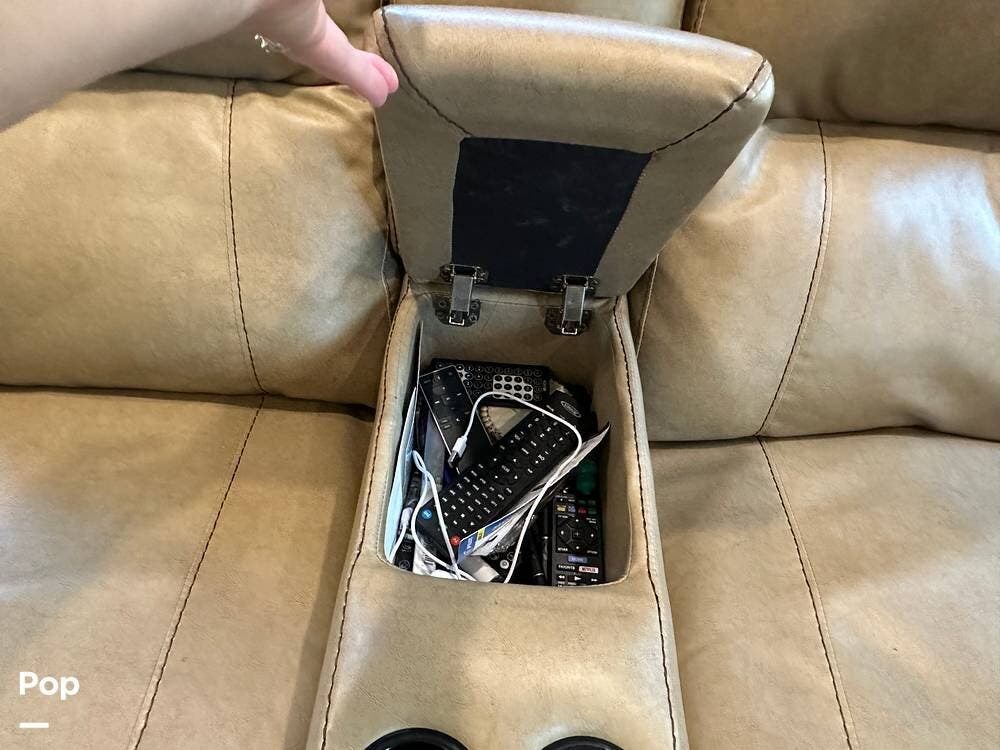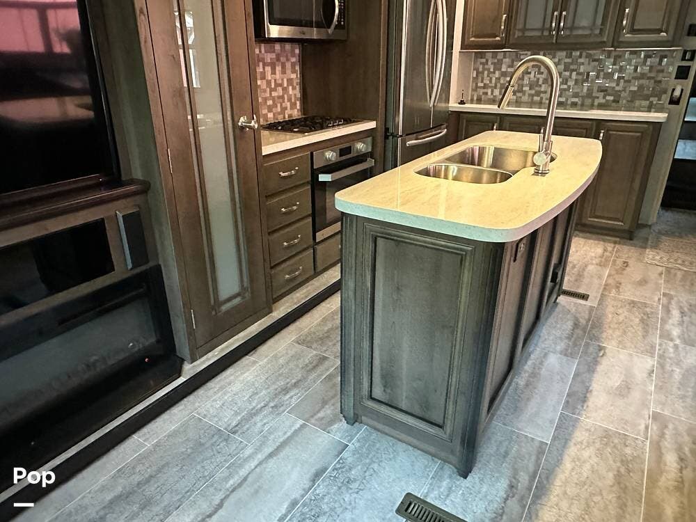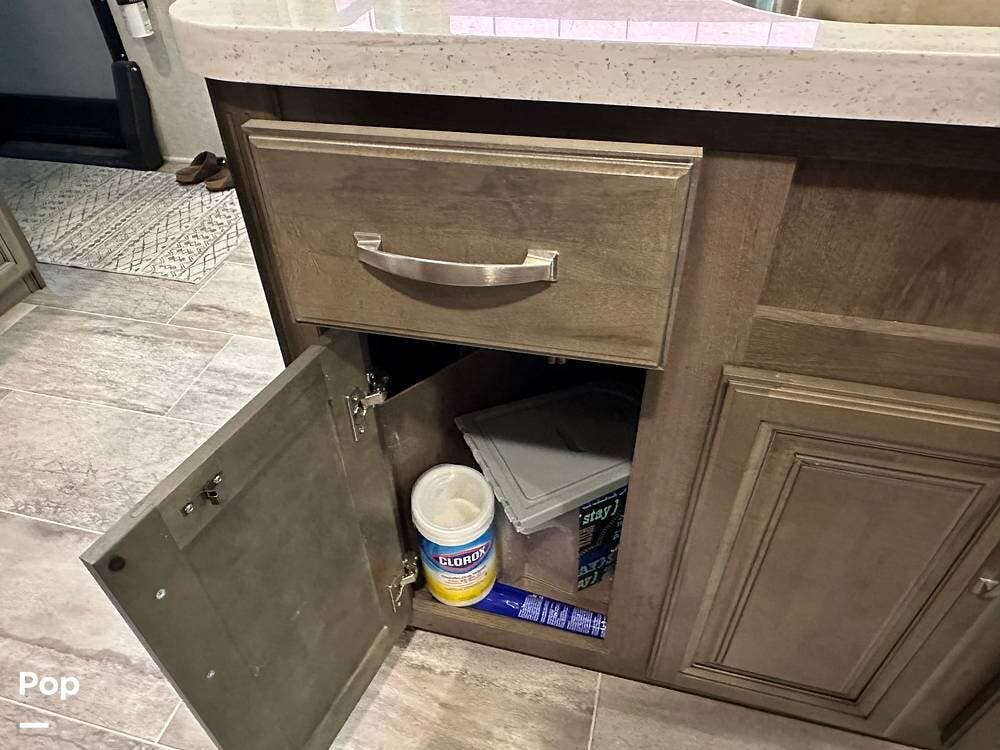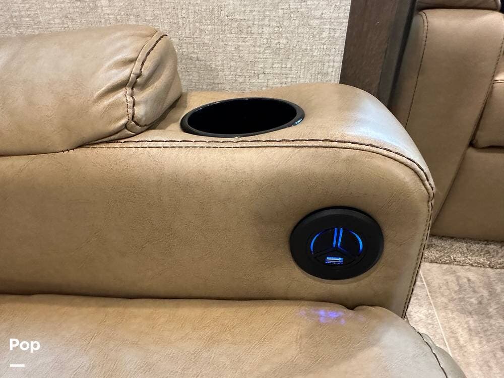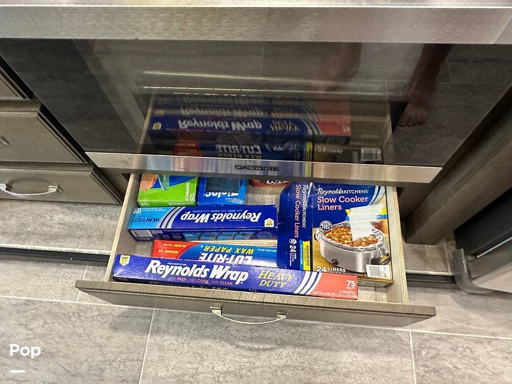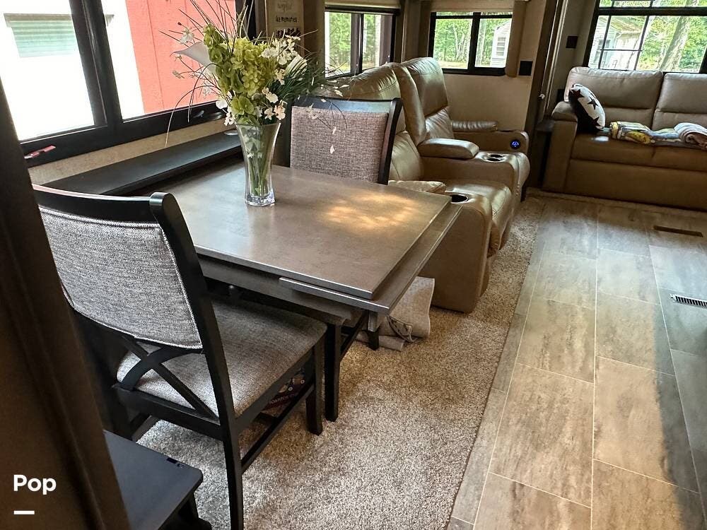 The kitchen has an island with a double sink, stove, oven, refrigerator/freezer, ice maker, pantry, buffet area, and plenty of storage. The dining area has an extension table and four chairs. Also has two pop-up charging stations and a central vacuum system. Has a removable lock for the refrigerator when traveling.