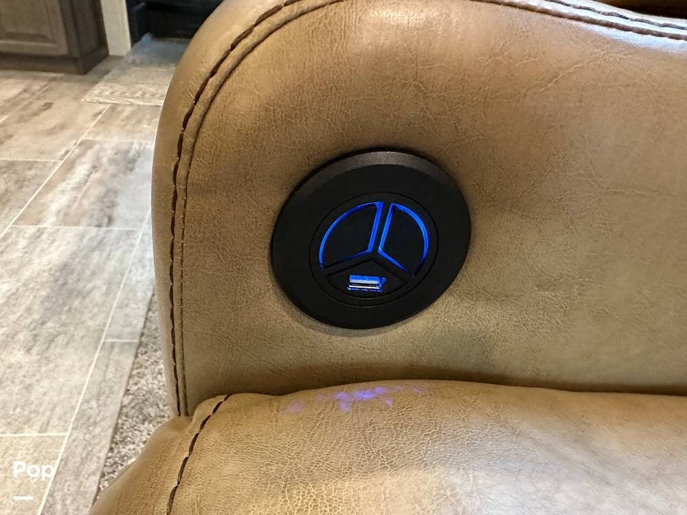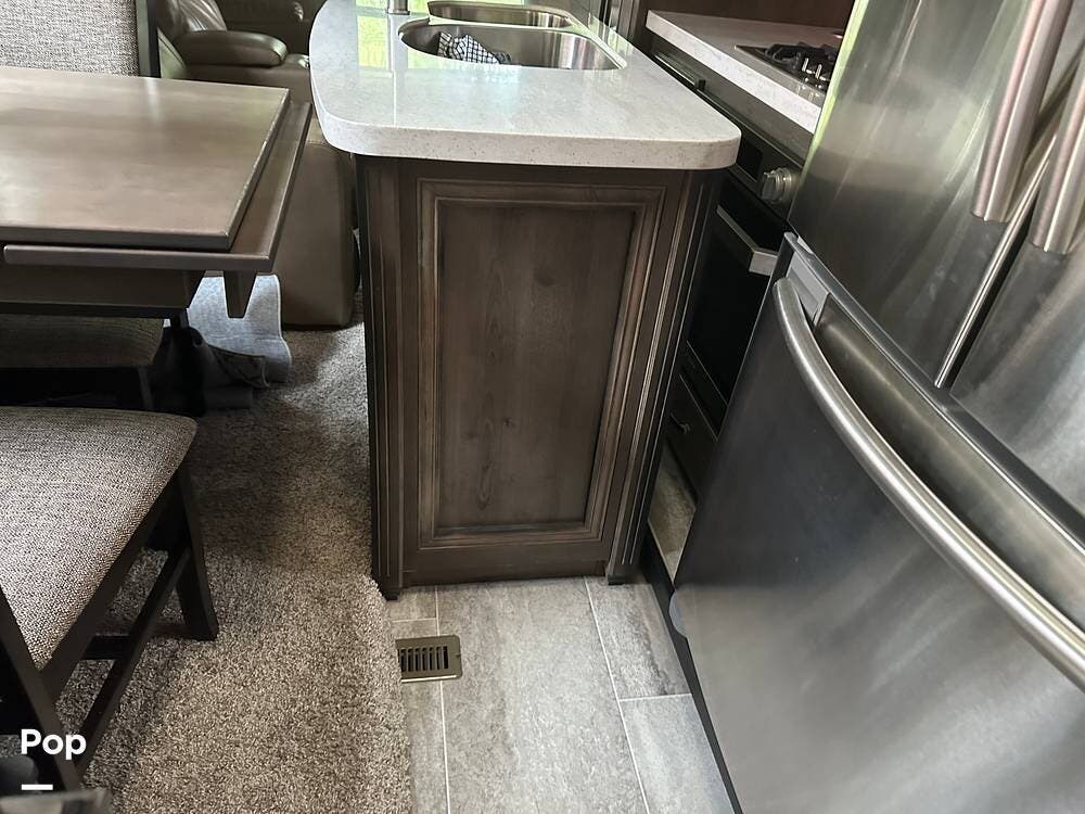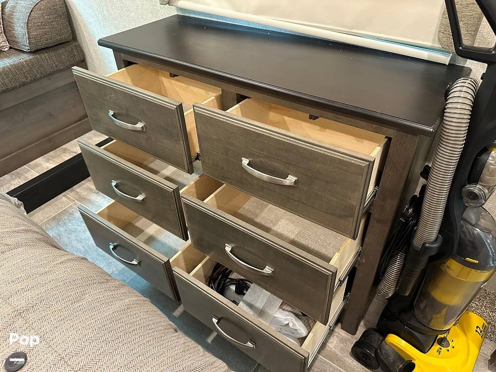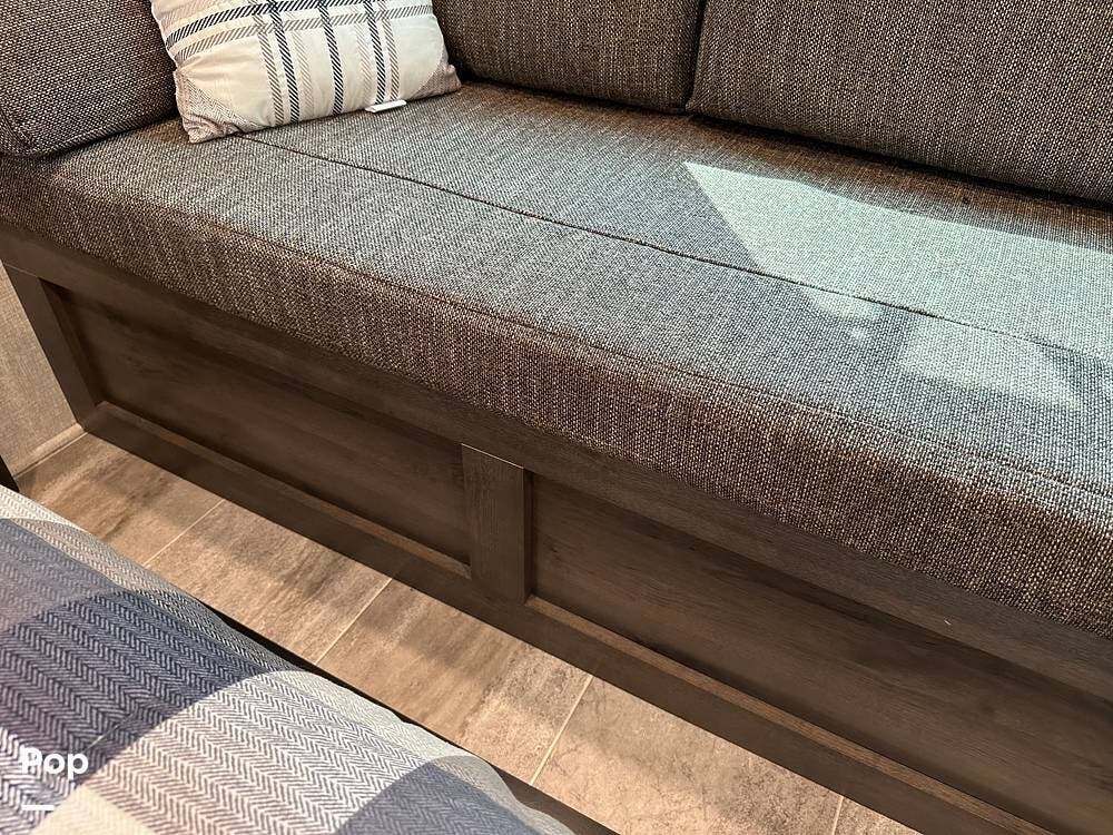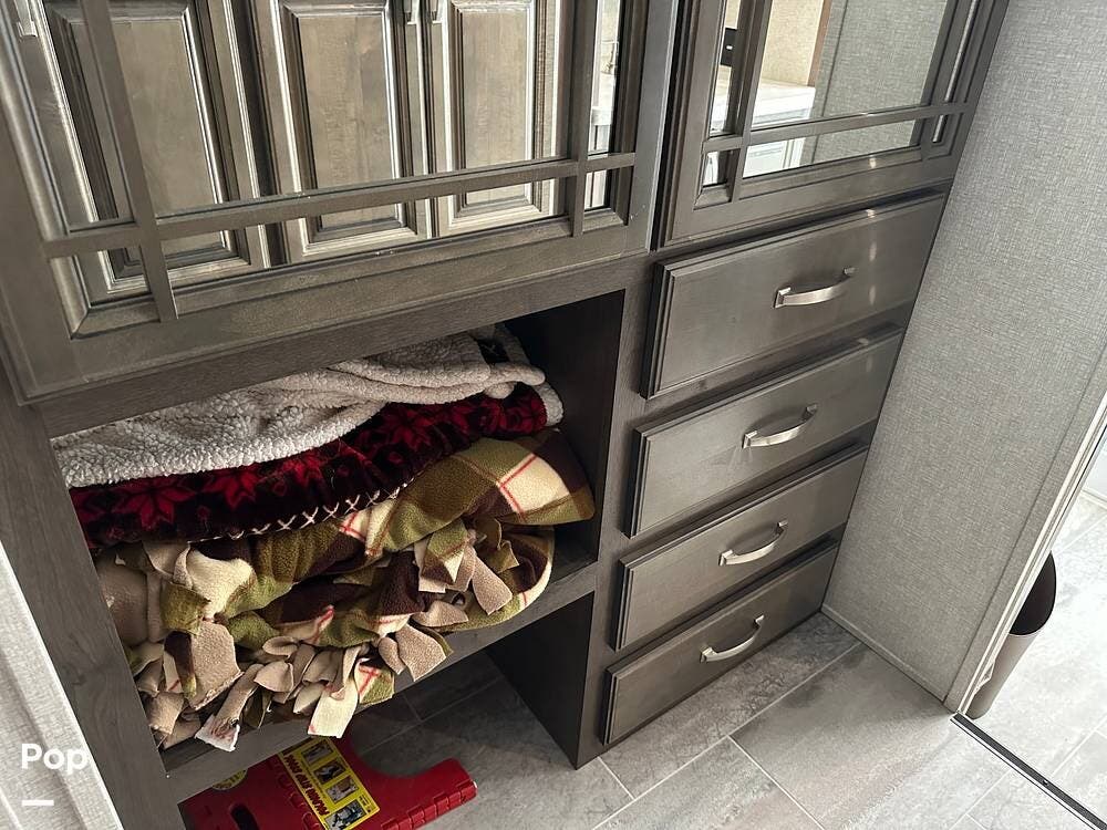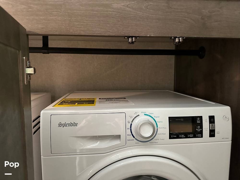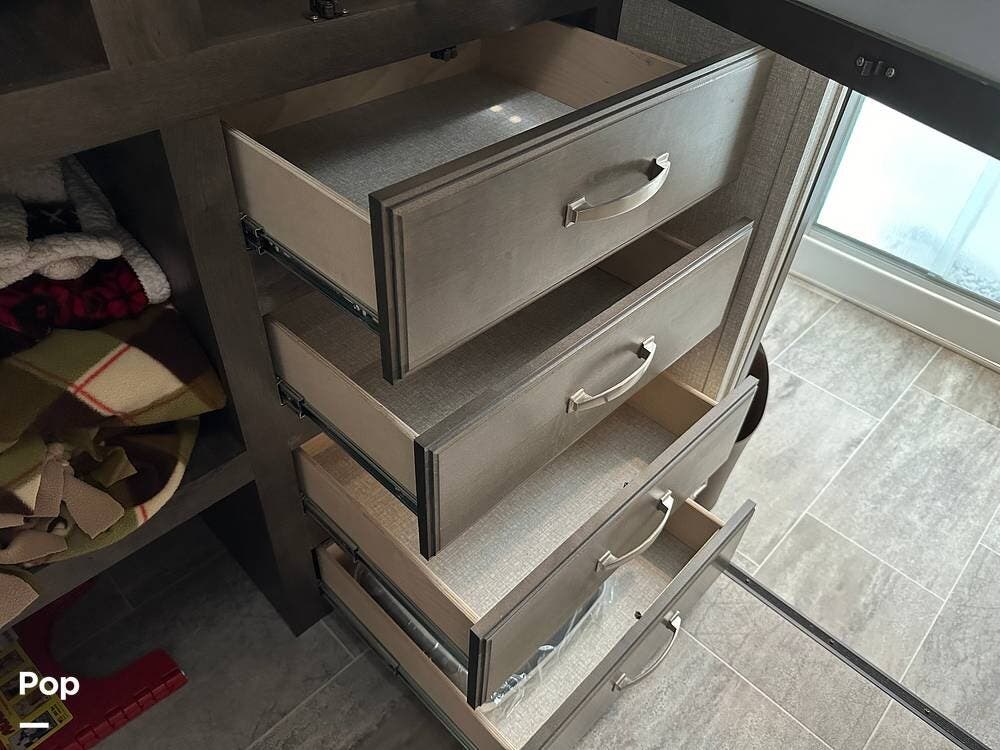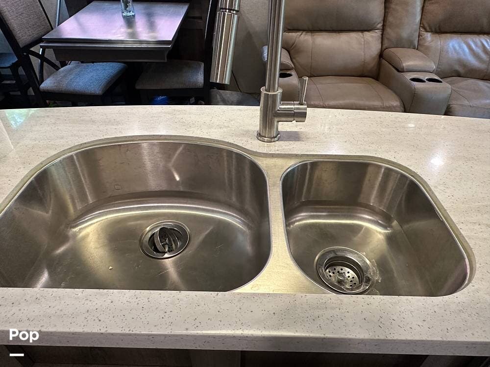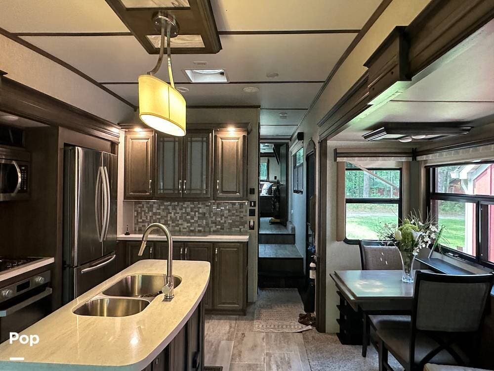 The kitchen has an island with a double sink, stove, oven, refrigerator/freezer, ice maker, pantry, buffet area, and plenty of storage. The dining area has an extension table and four chairs. Also has two pop-up charging stations and a central vacuum system. Has a removable lock for the refrigerator when traveling.