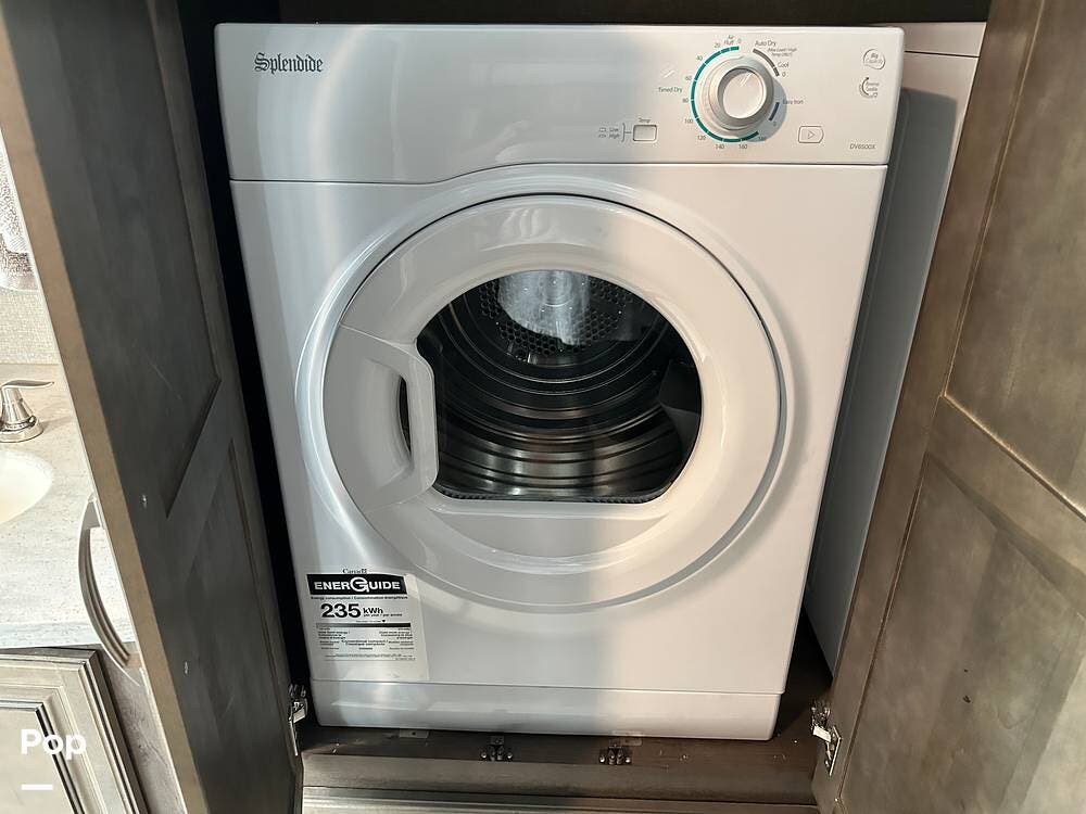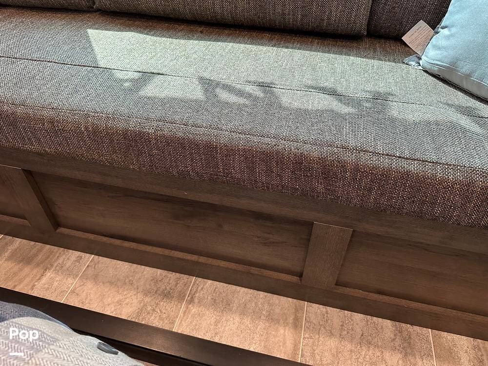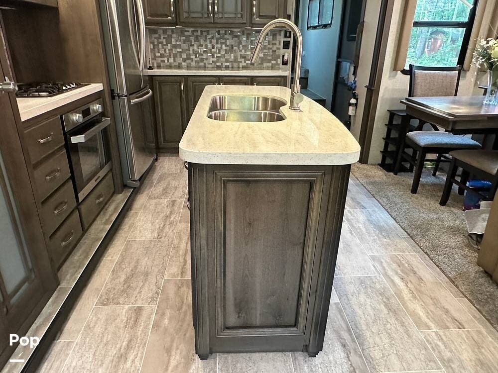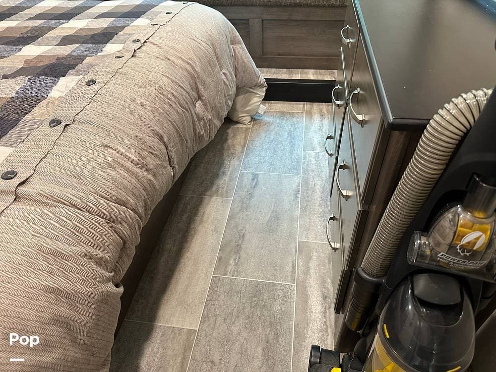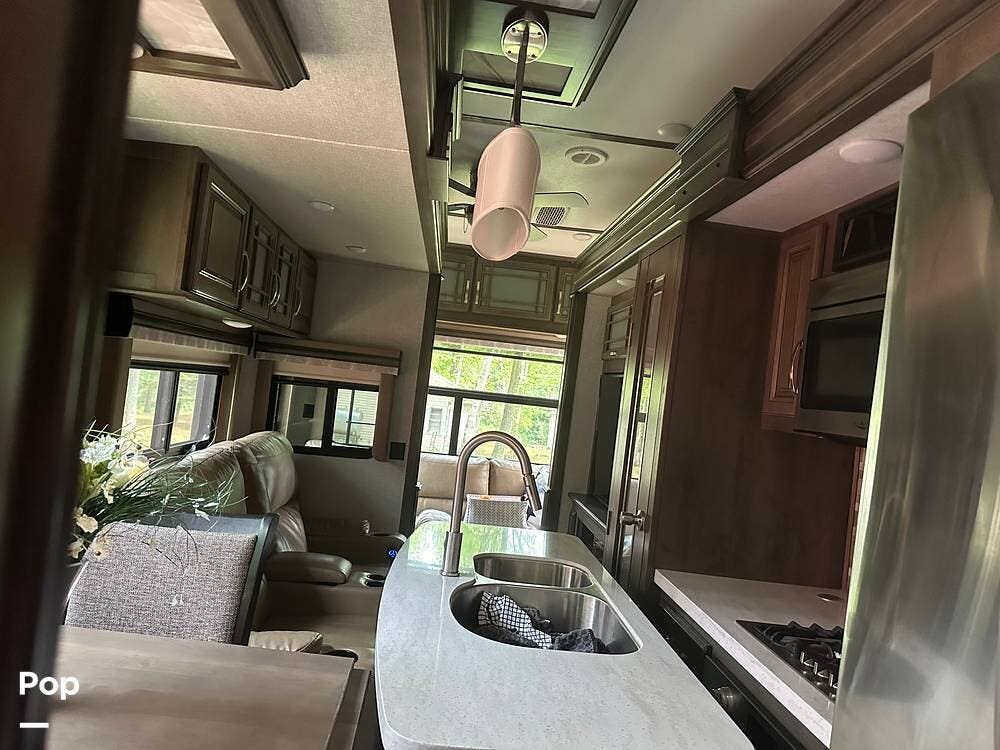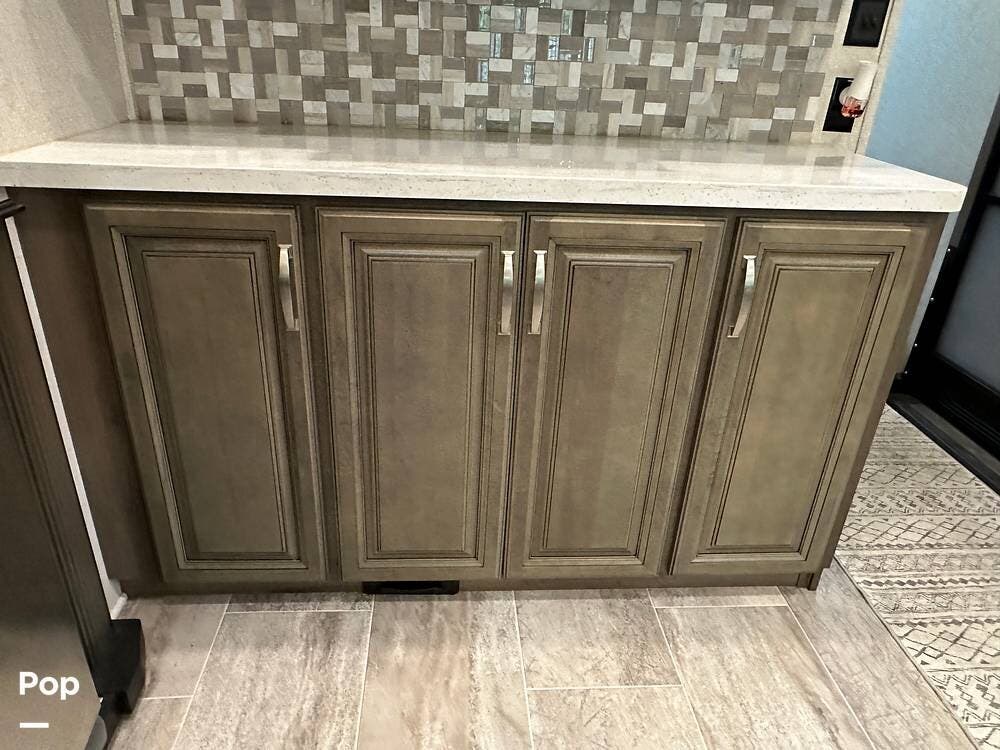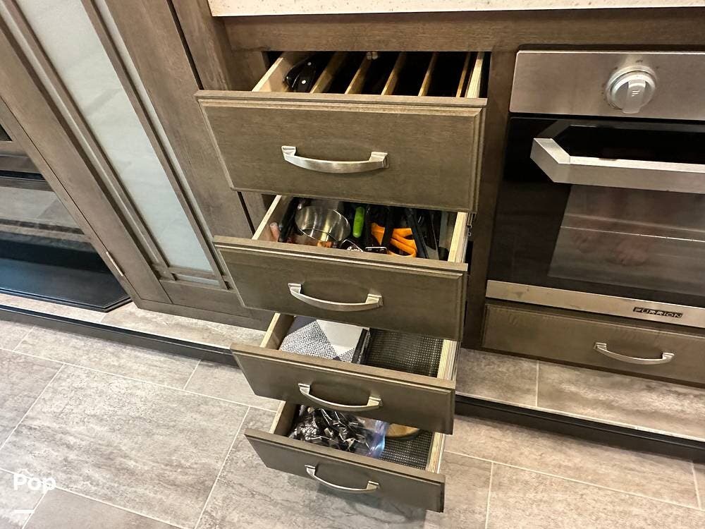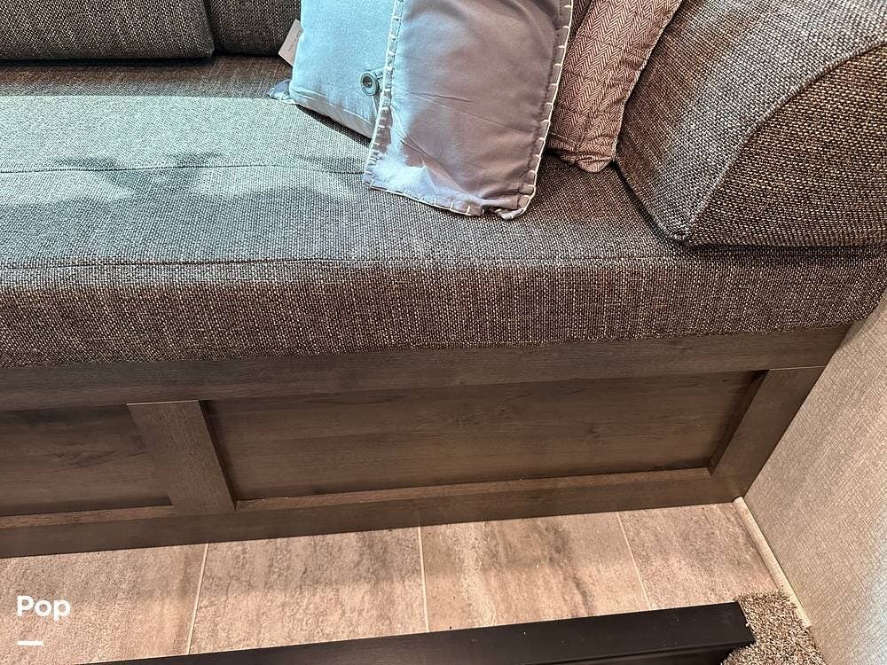 The kitchen has an island with a double sink, stove, oven, refrigerator/freezer, ice maker, pantry, buffet area, and plenty of storage. The dining area has an extension table and four chairs. Also has two pop-up charging stations and a central vacuum system. Has a removable lock for the refrigerator when traveling.