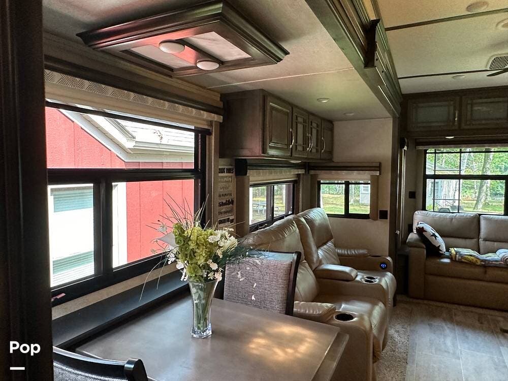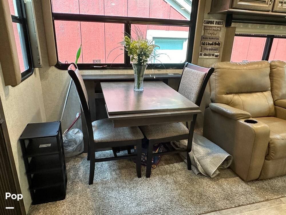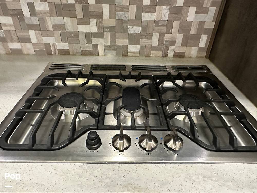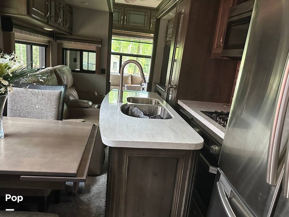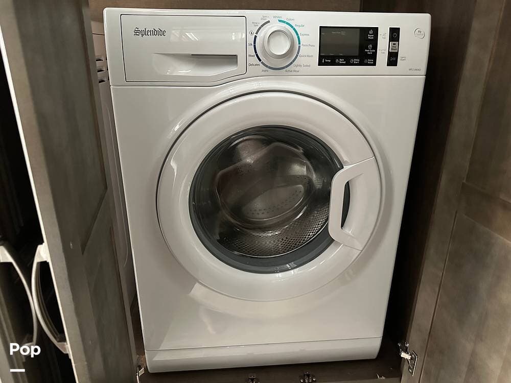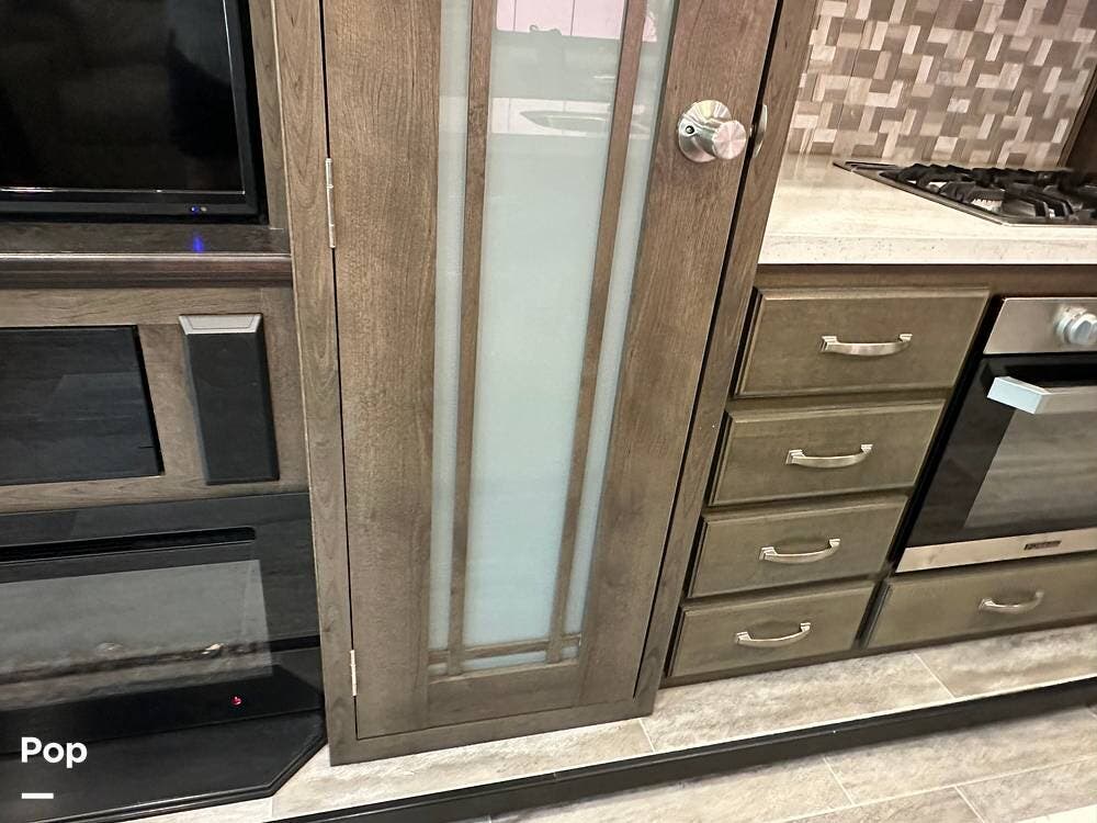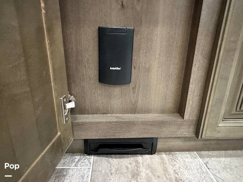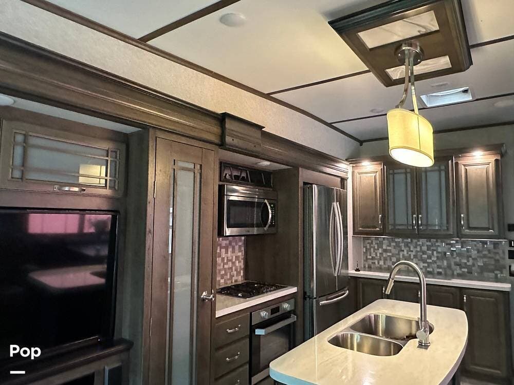 The kitchen has an island with a double sink, stove, oven, refrigerator/freezer, ice maker, pantry, buffet area, and plenty of storage. The dining area has an extension table and four chairs. Also has two pop-up charging stations and a central vacuum system. Has a removable lock for the refrigerator when traveling.