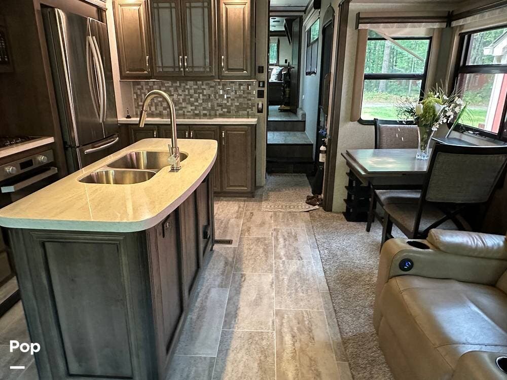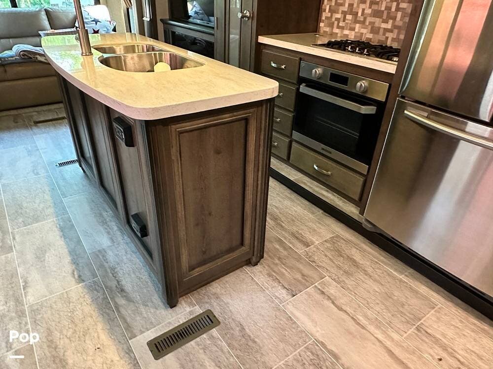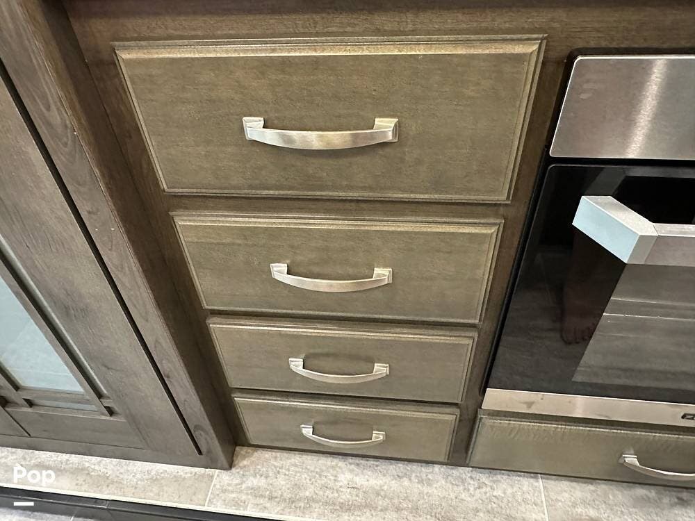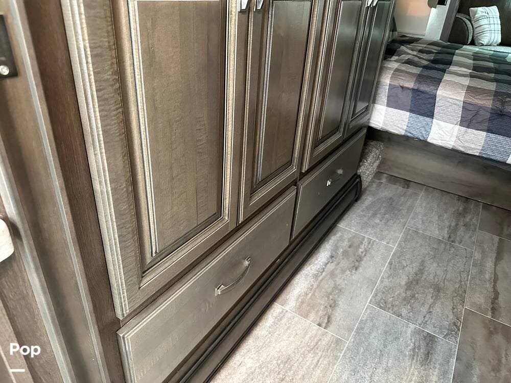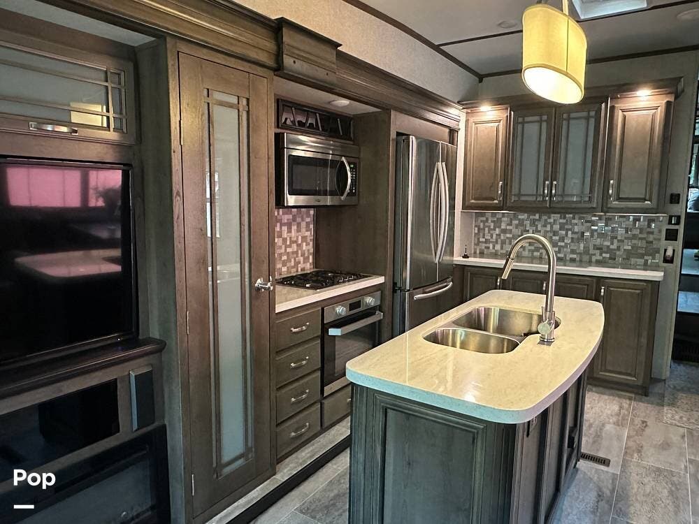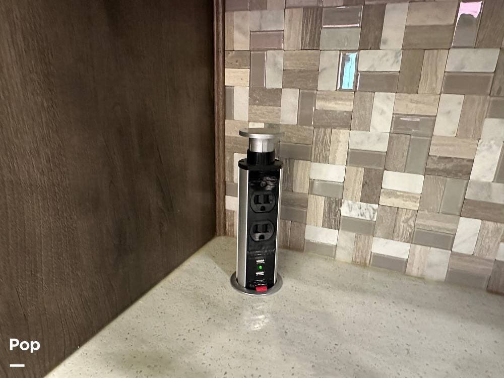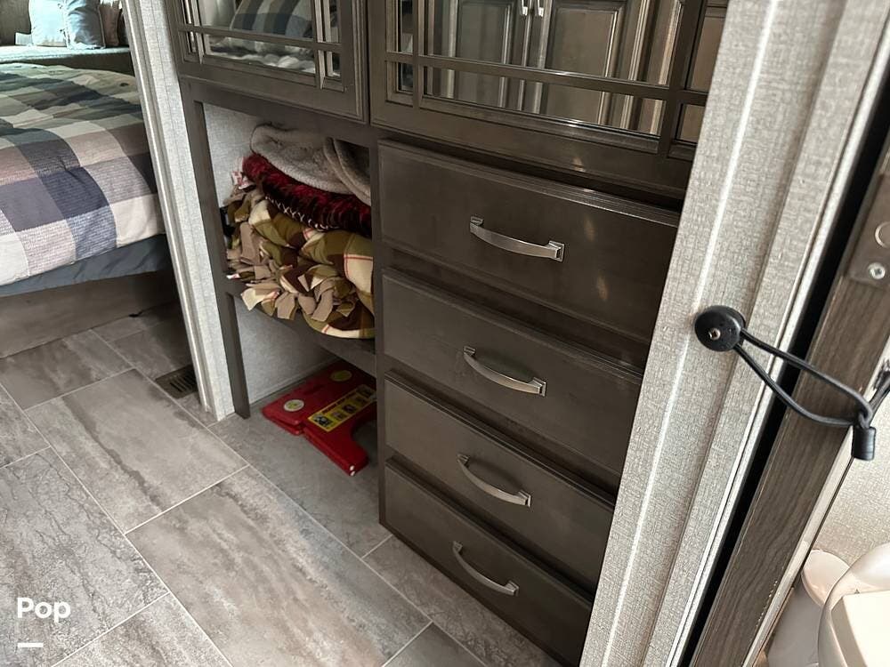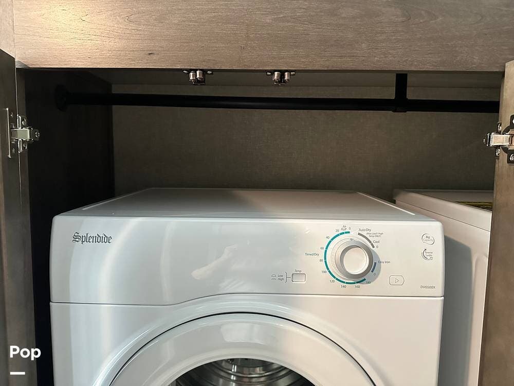 The kitchen has an island with a double sink, stove, oven, refrigerator/freezer, ice maker, pantry, buffet area, and plenty of storage. The dining area has an extension table and four chairs. Also has two pop-up charging stations and a central vacuum system. Has a removable lock for the refrigerator when traveling.