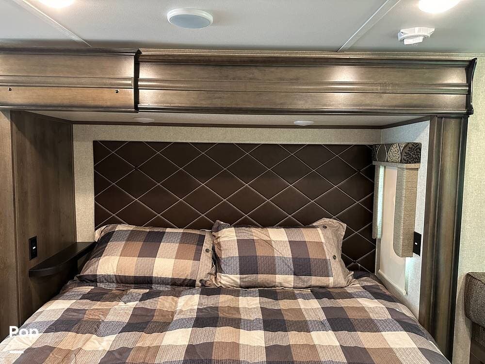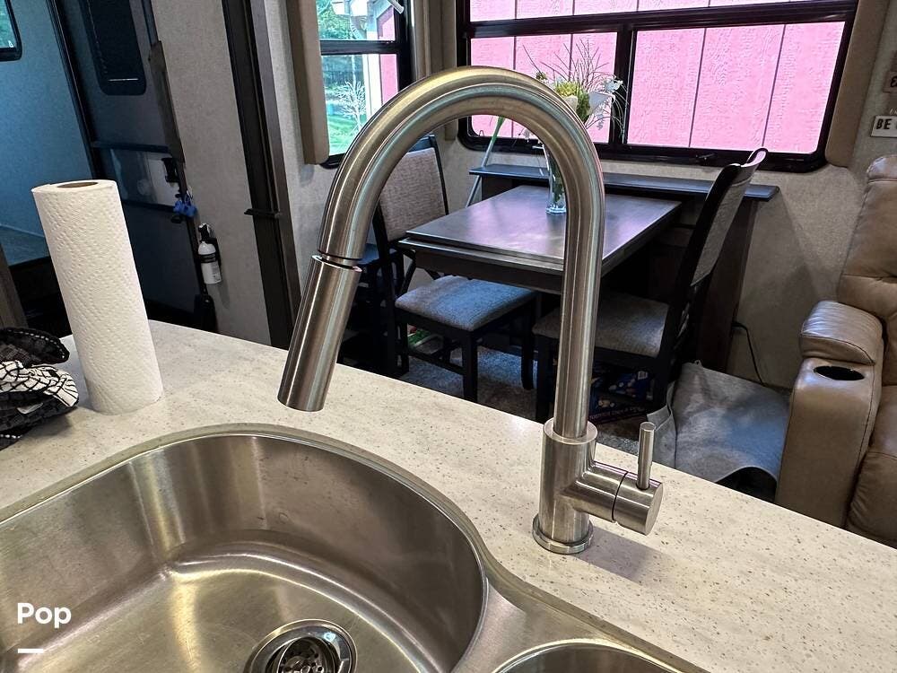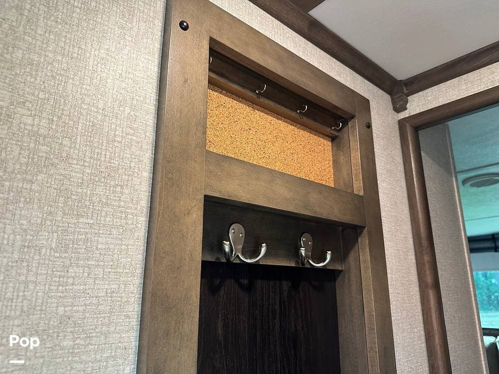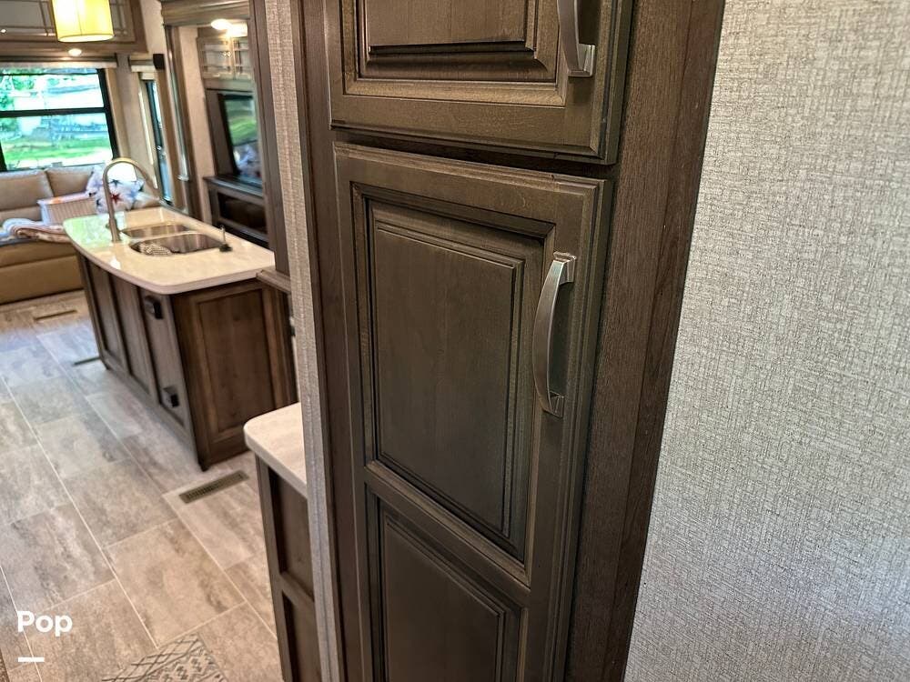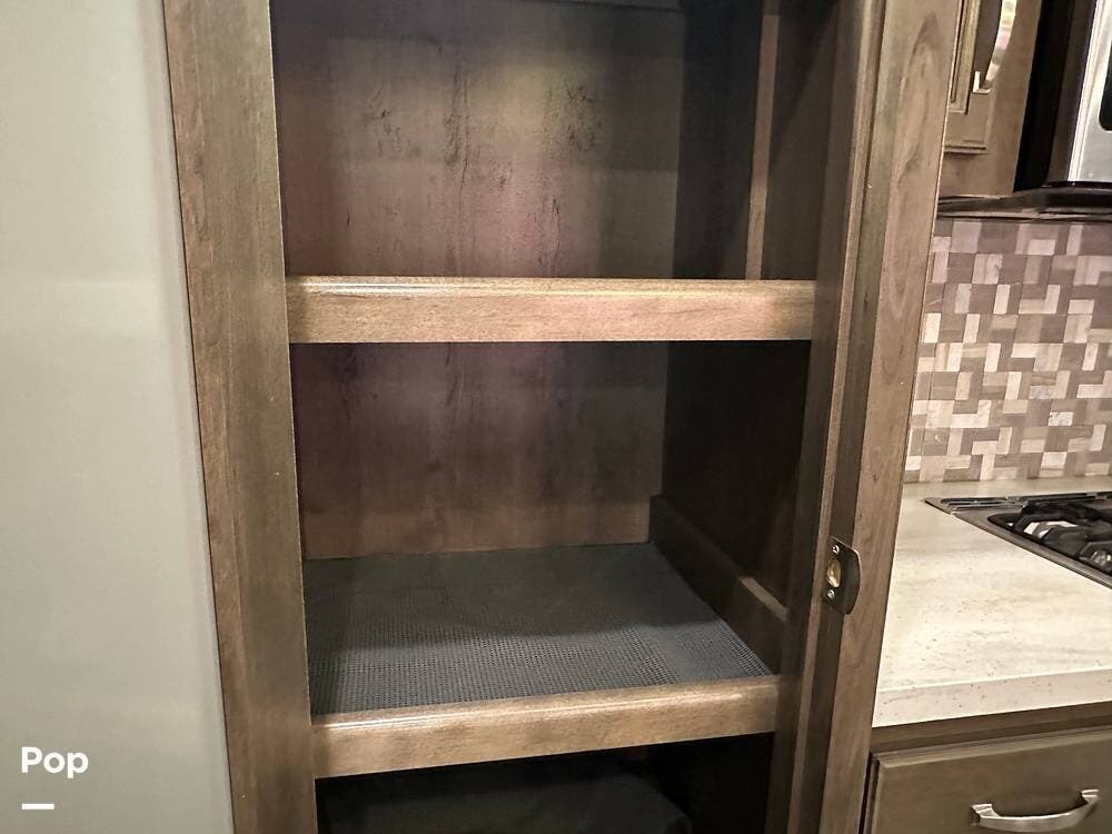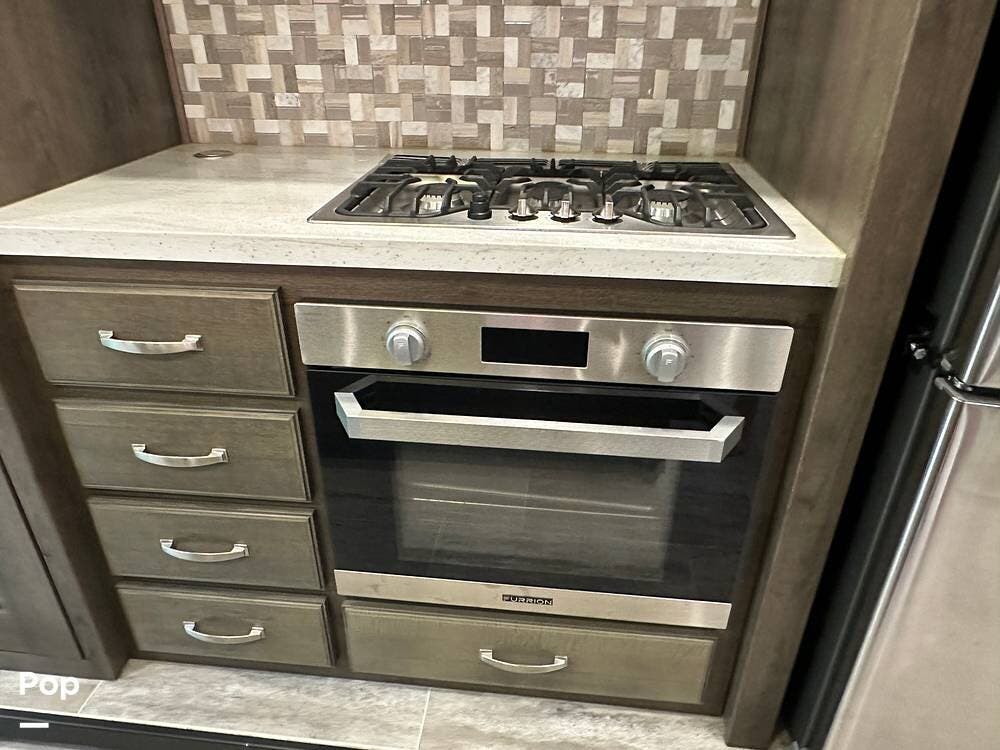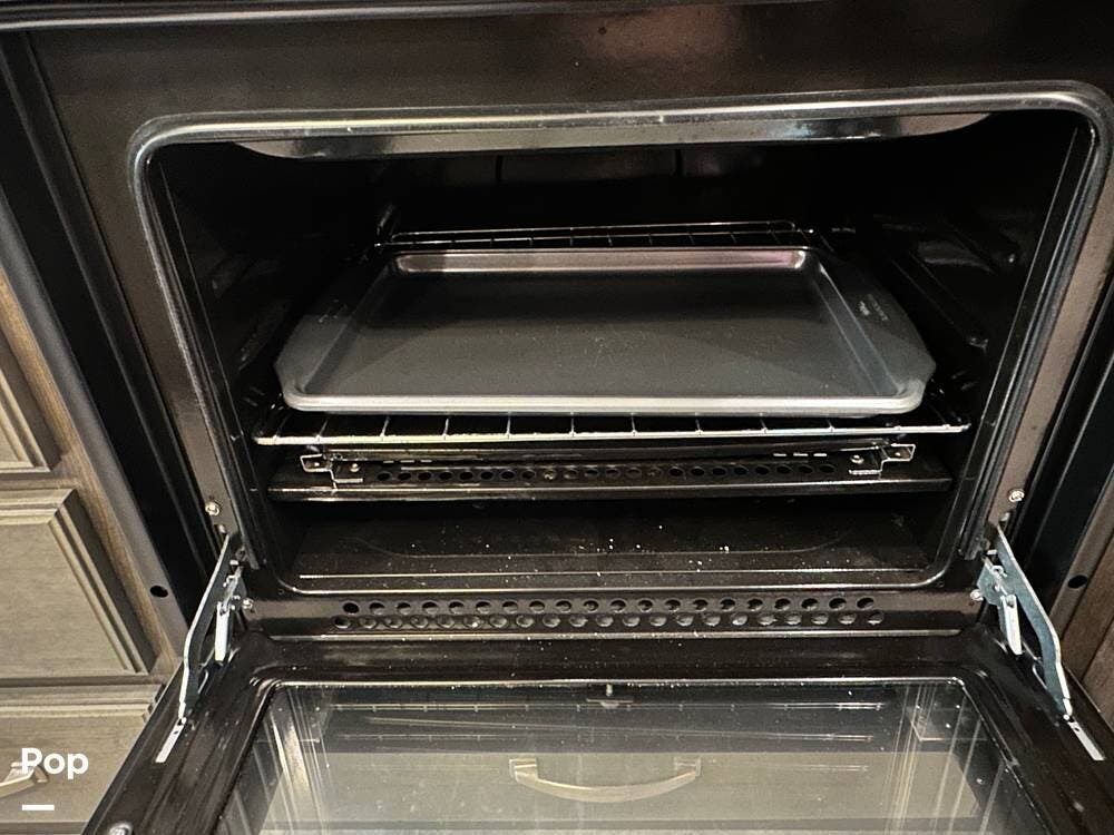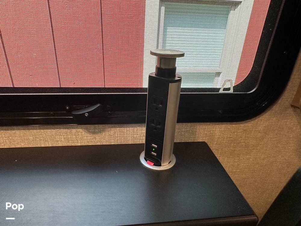 The kitchen has an island with a double sink, stove, oven, refrigerator/freezer, ice maker, pantry, buffet area, and plenty of storage. The dining area has an extension table and four chairs. Also has two pop-up charging stations and a central vacuum system. Has a removable lock for the refrigerator when traveling.