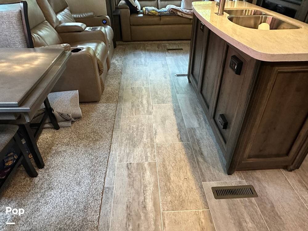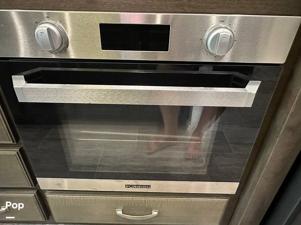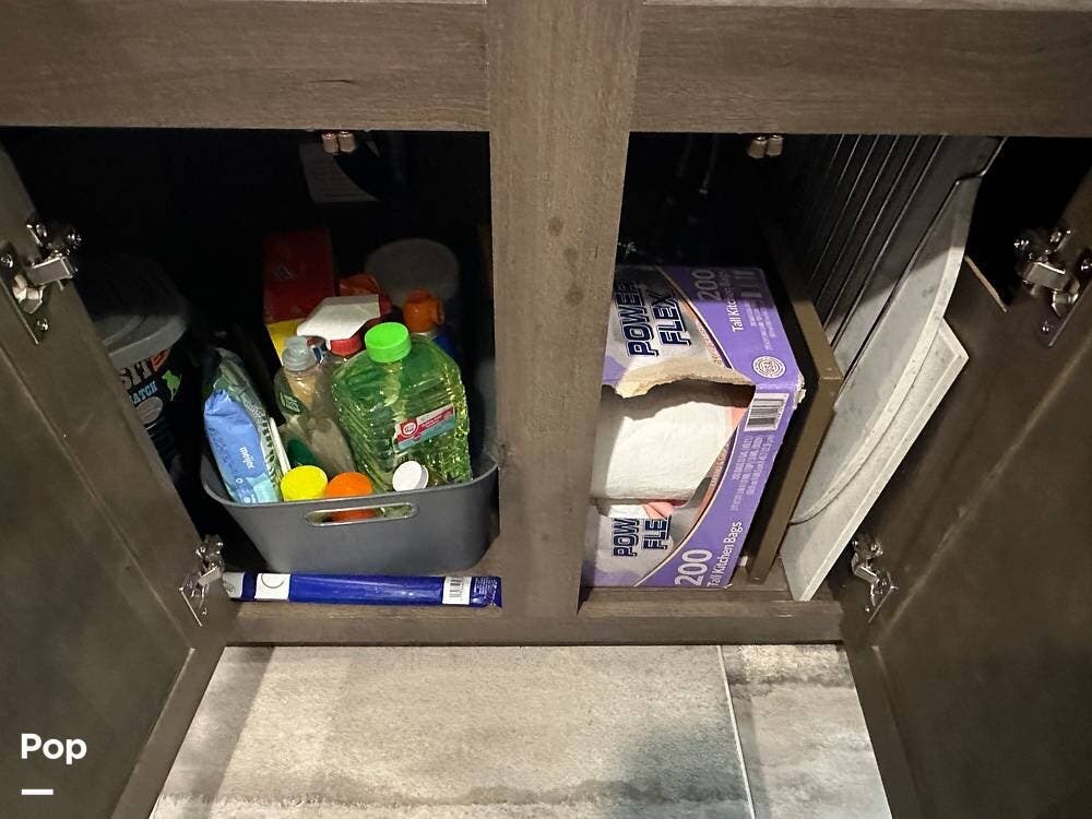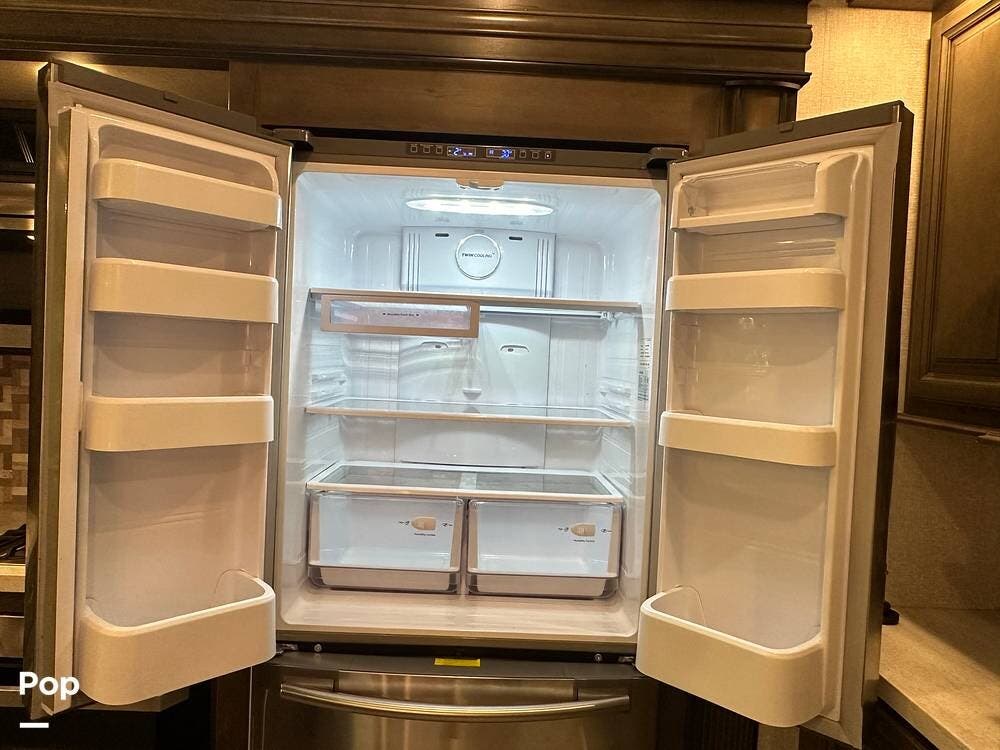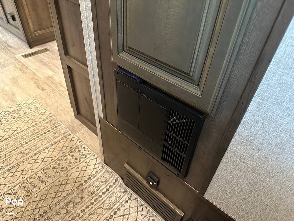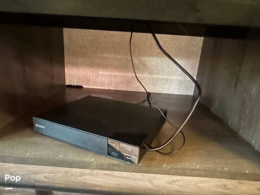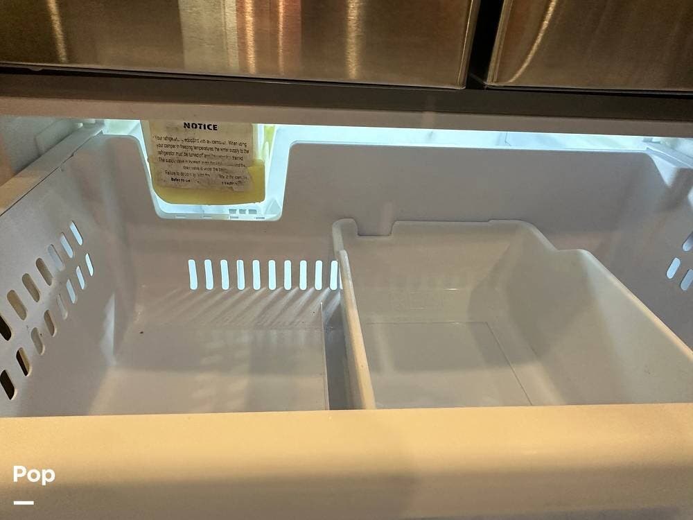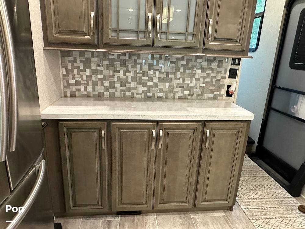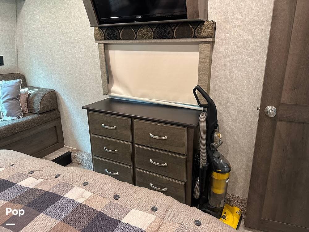 The kitchen has an island with a double sink, stove, oven, refrigerator/freezer, ice maker, pantry, buffet area, and plenty of storage. The dining area has an extension table and four chairs. Also has two pop-up charging stations and a central vacuum system. Has a removable lock for the refrigerator when traveling.