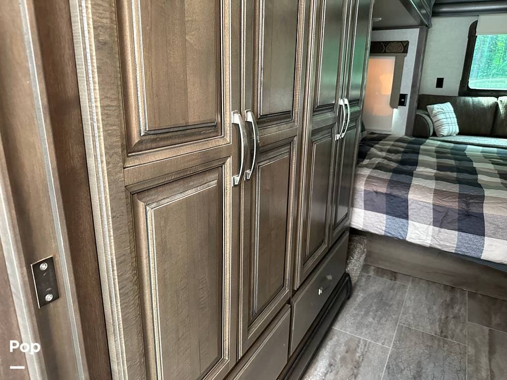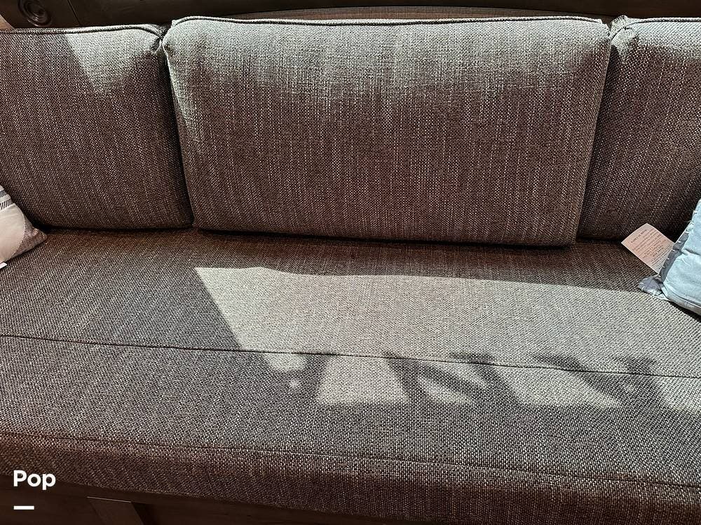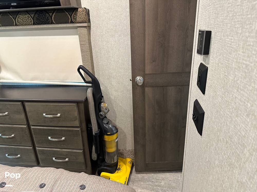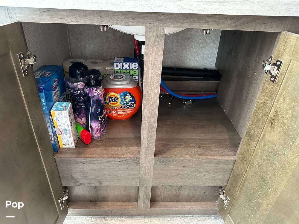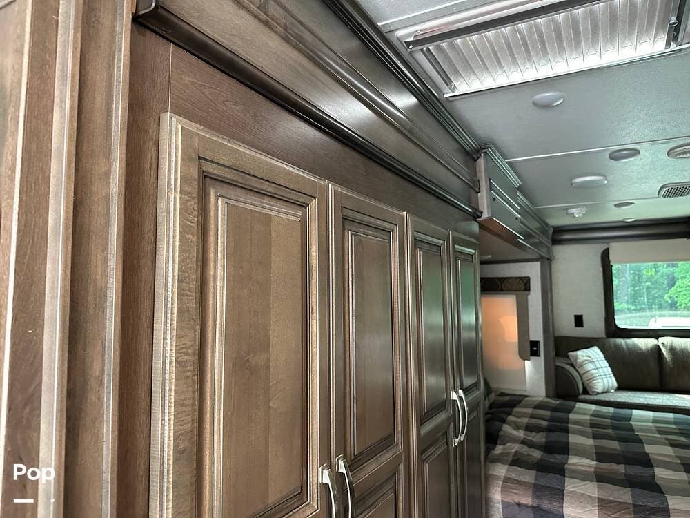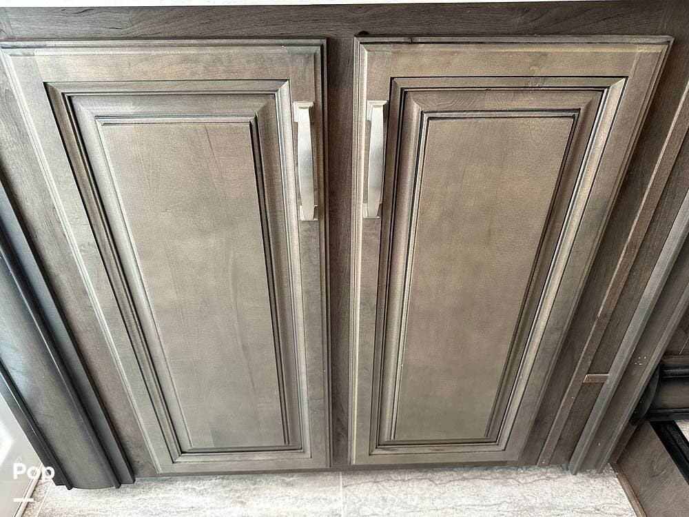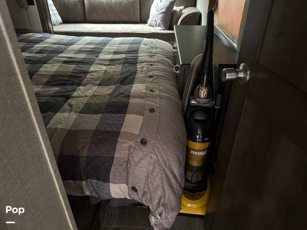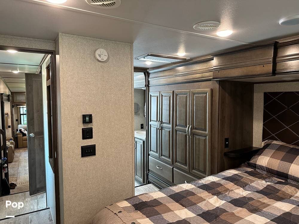 The kitchen has an island with a double sink, stove, oven, refrigerator/freezer, ice maker, pantry, buffet area, and plenty of storage. The dining area has an extension table and four chairs. Also has two pop-up charging stations and a central vacuum system. Has a removable lock for the refrigerator when traveling.