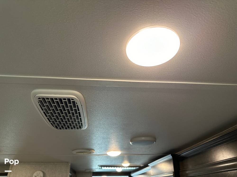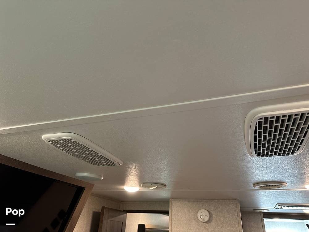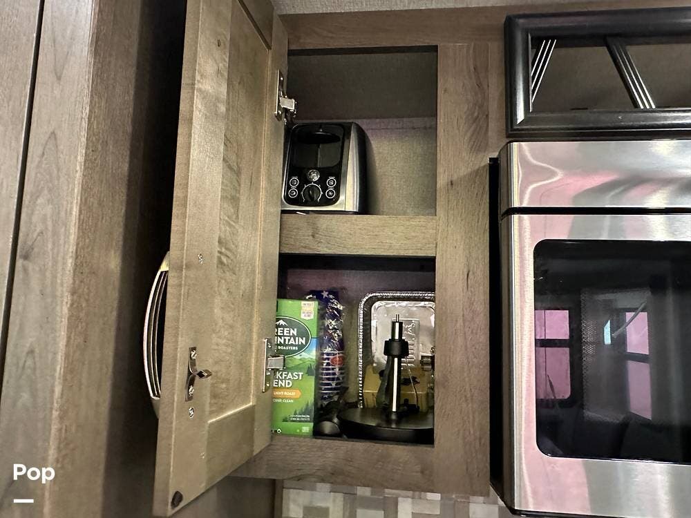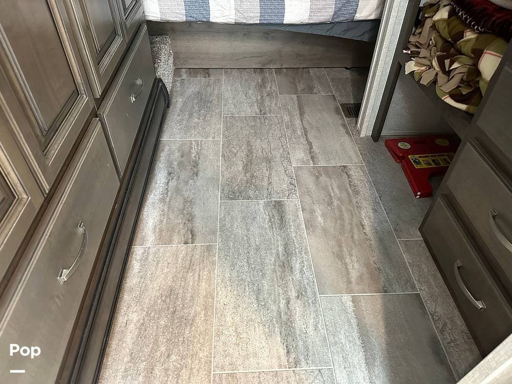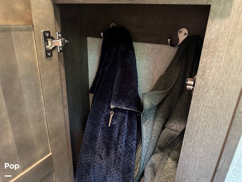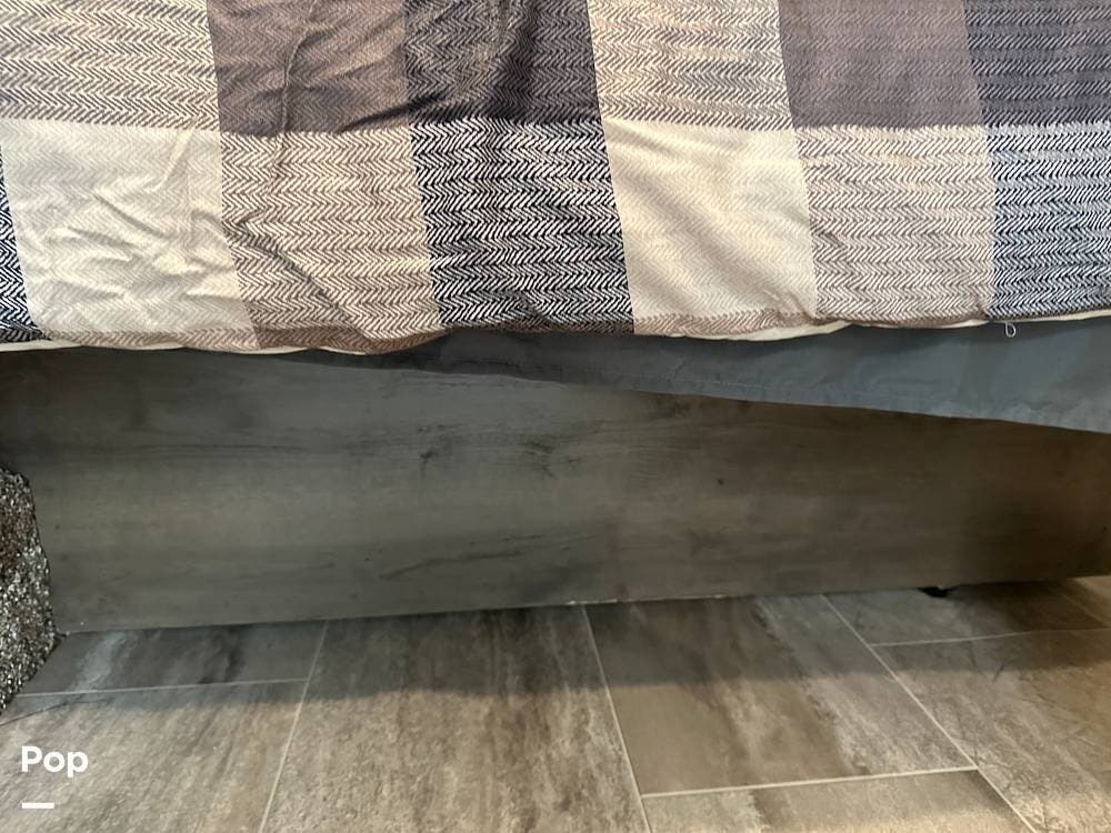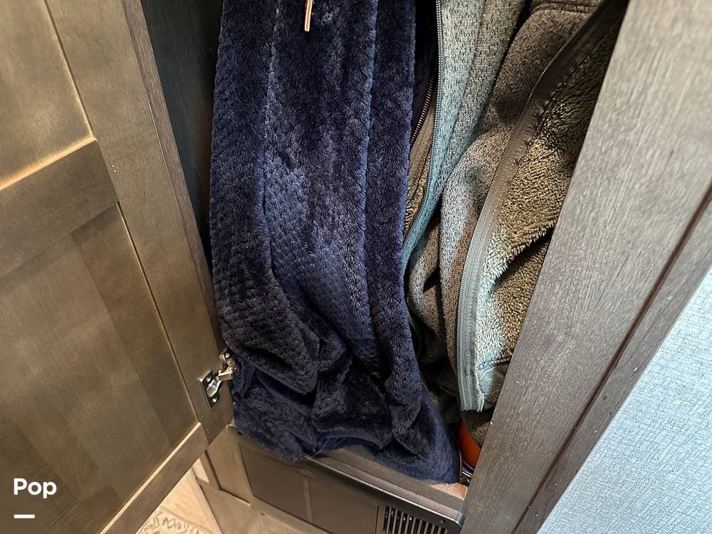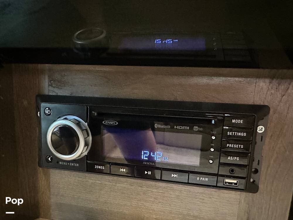 The kitchen has an island with a double sink, stove, oven, refrigerator/freezer, ice maker, pantry, buffet area, and plenty of storage. The dining area has an extension table and four chairs. Also has two pop-up charging stations and a central vacuum system. Has a removable lock for the refrigerator when traveling.