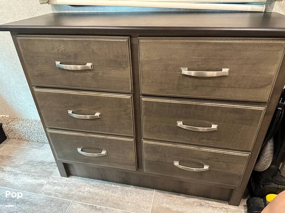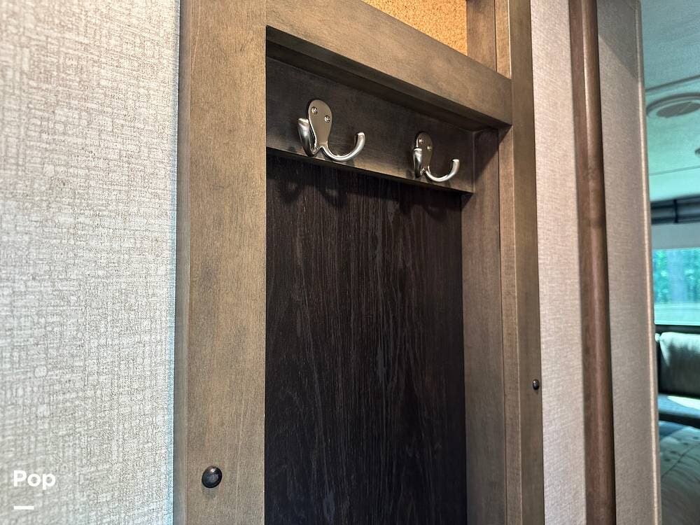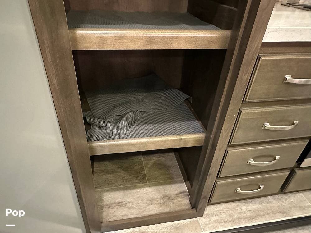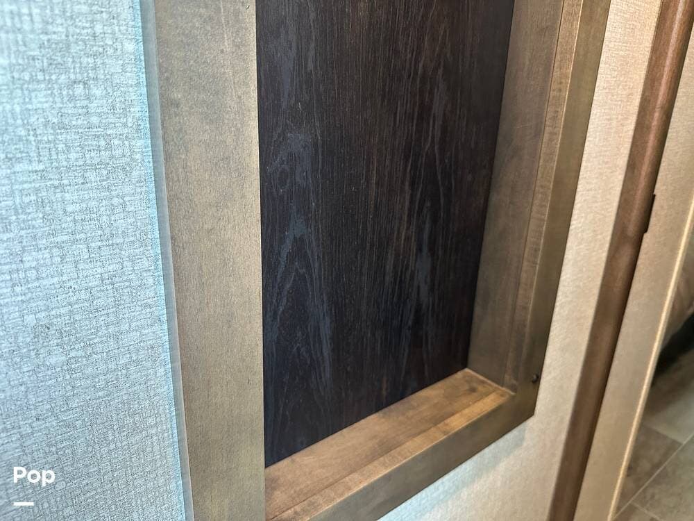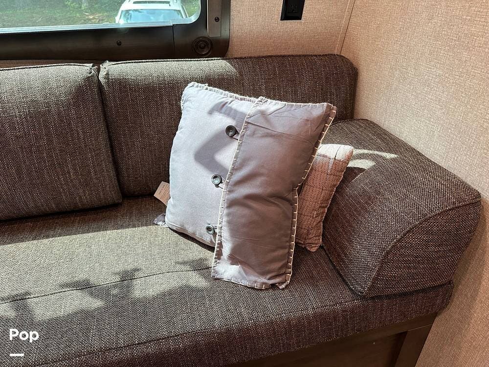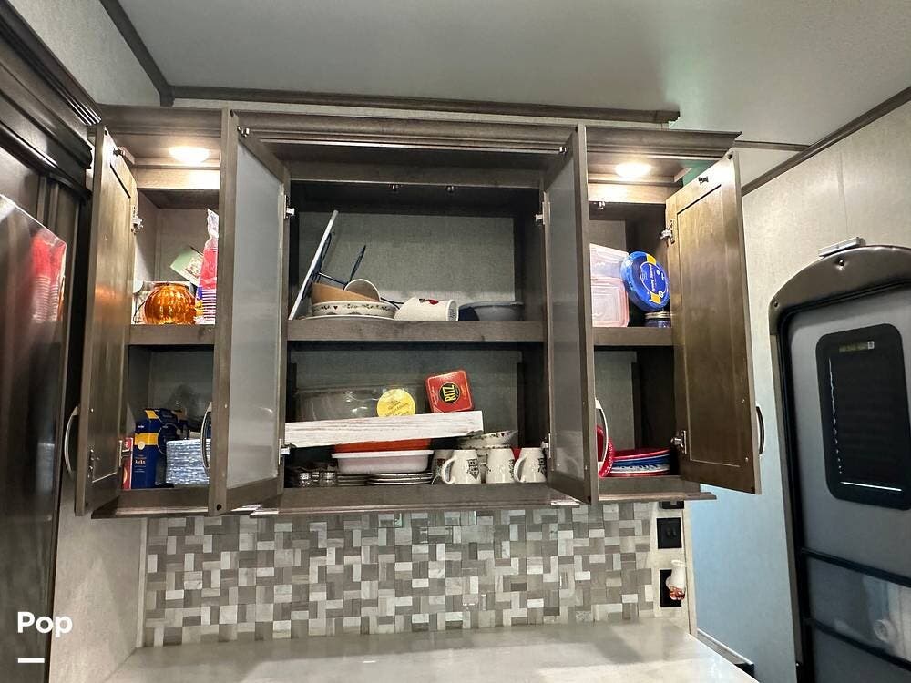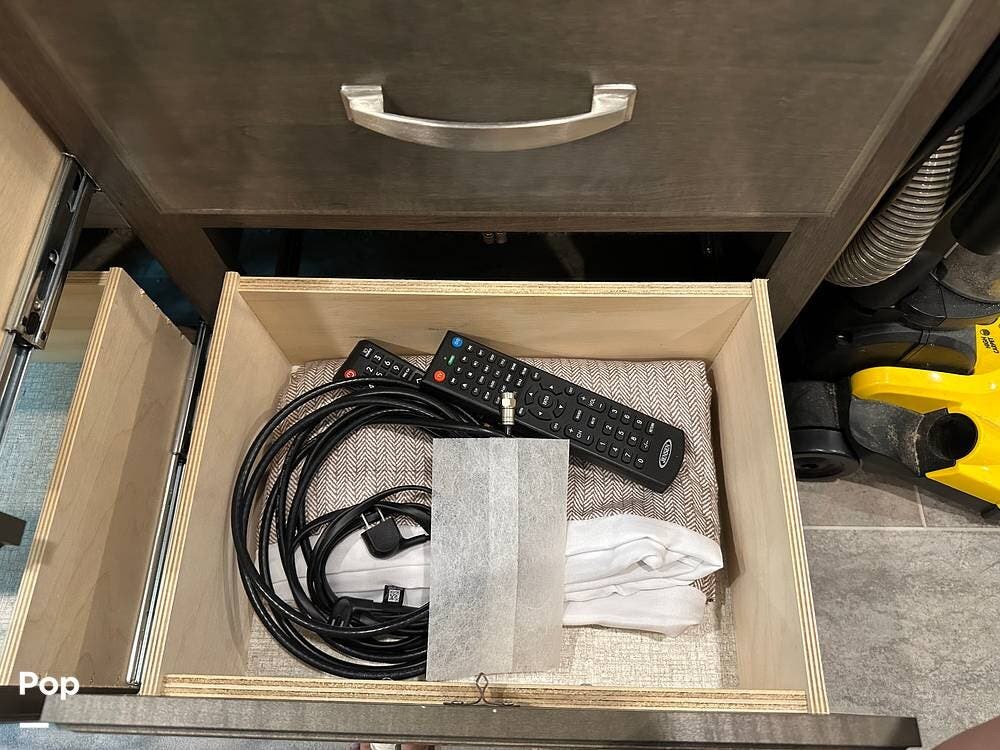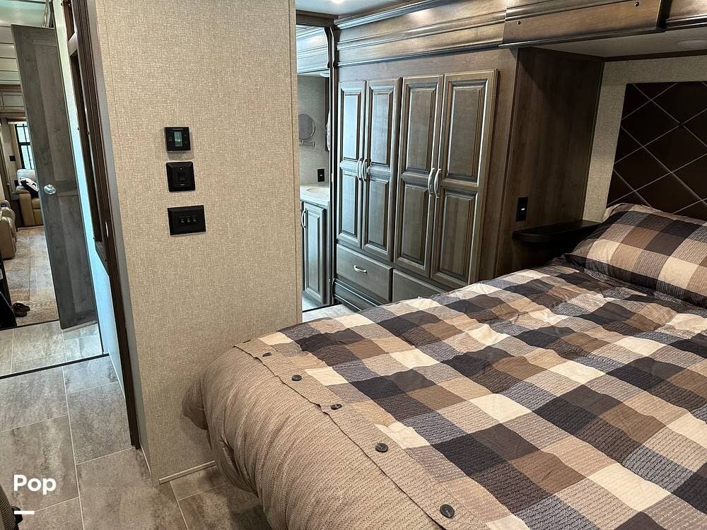 The kitchen has an island with a double sink, stove, oven, refrigerator/freezer, ice maker, pantry, buffet area, and plenty of storage. The dining area has an extension table and four chairs. Also has two pop-up charging stations and a central vacuum system. Has a removable lock for the refrigerator when traveling.