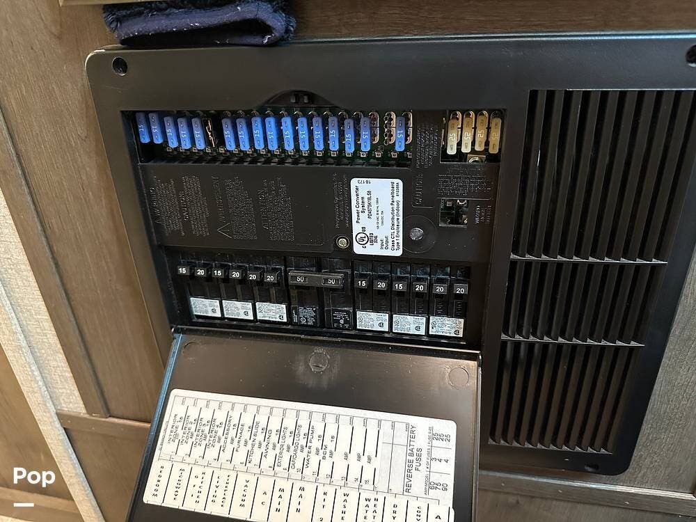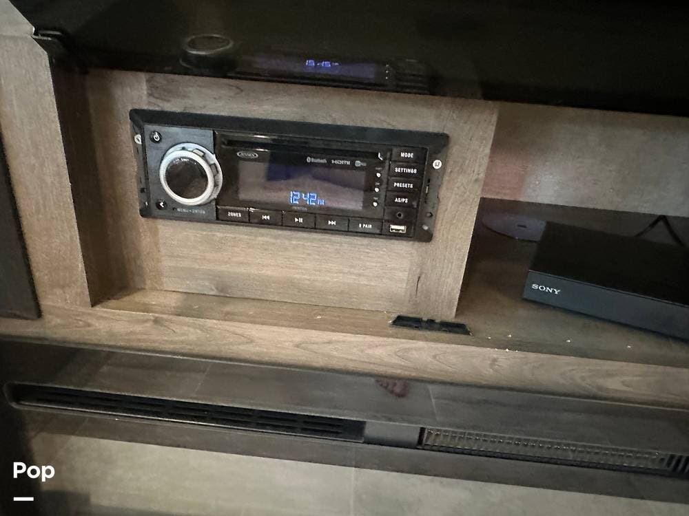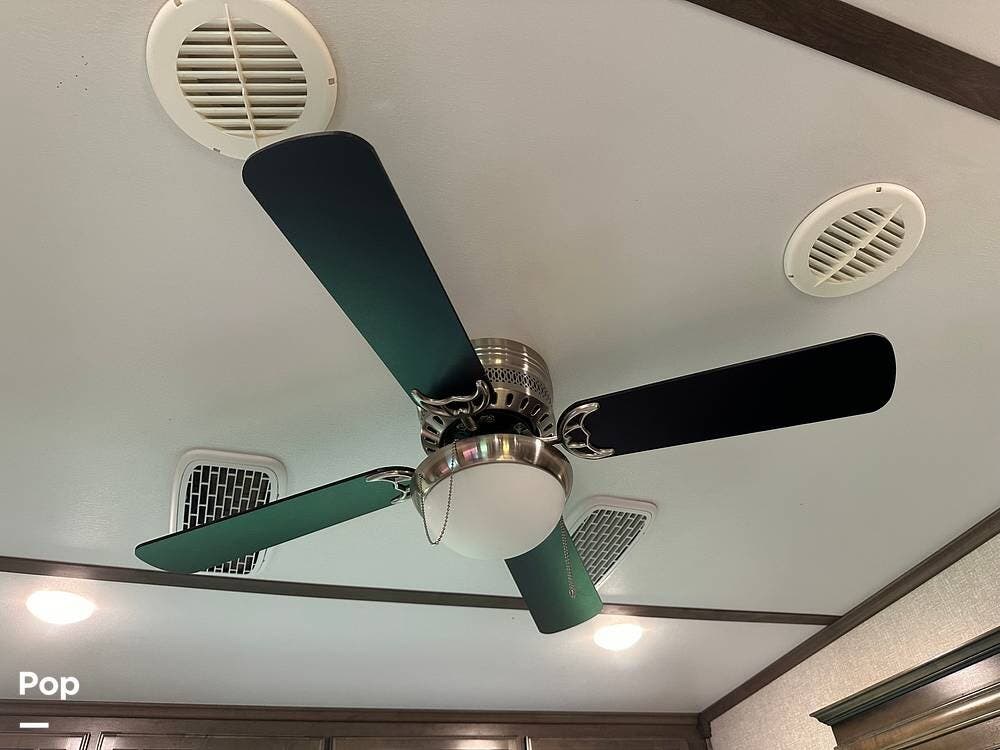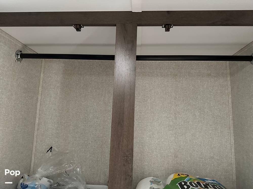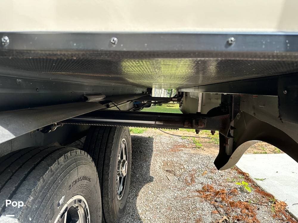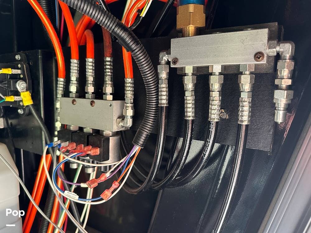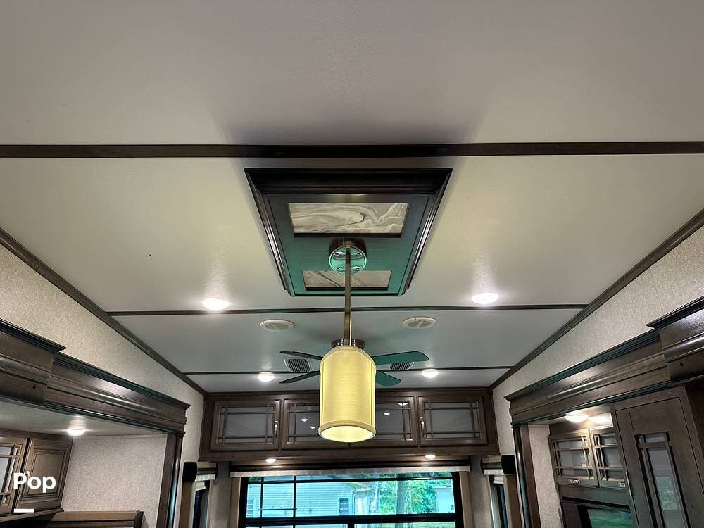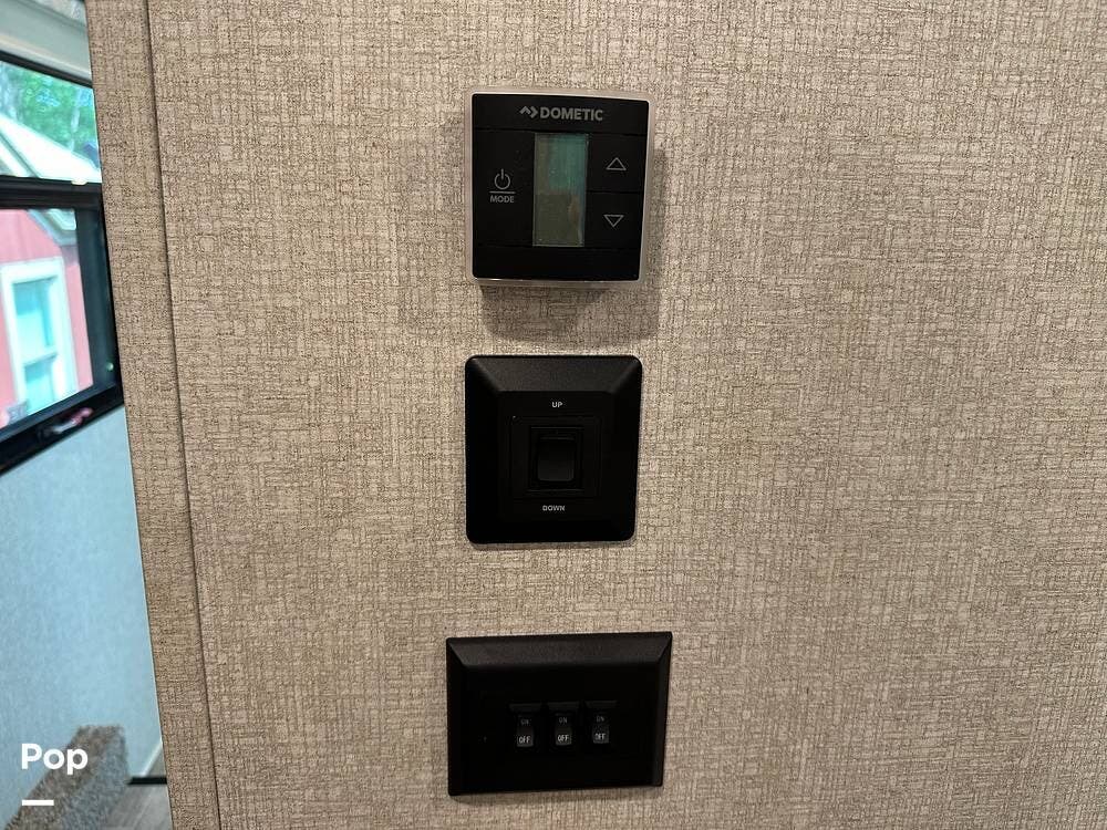 The kitchen has an island with a double sink, stove, oven, refrigerator/freezer, ice maker, pantry, buffet area, and plenty of storage. The dining area has an extension table and four chairs. Also has two pop-up charging stations and a central vacuum system. Has a removable lock for the refrigerator when traveling.