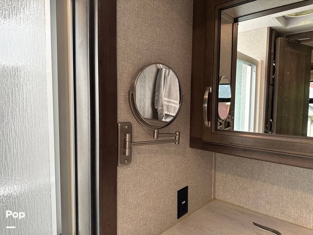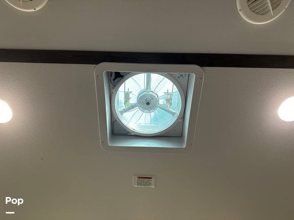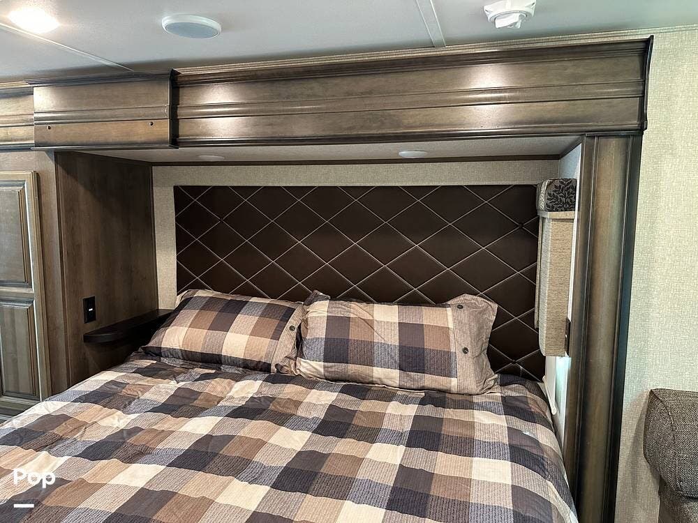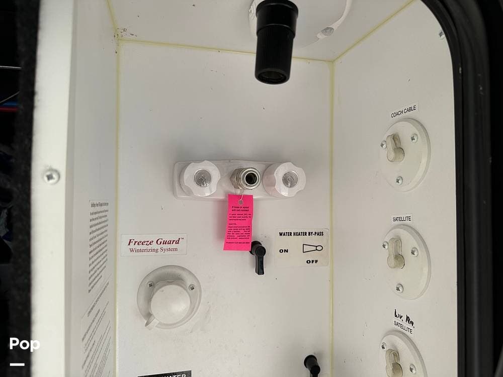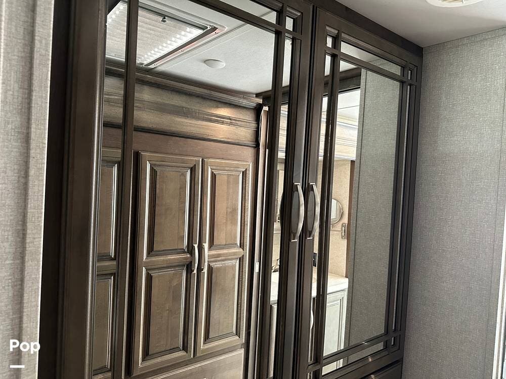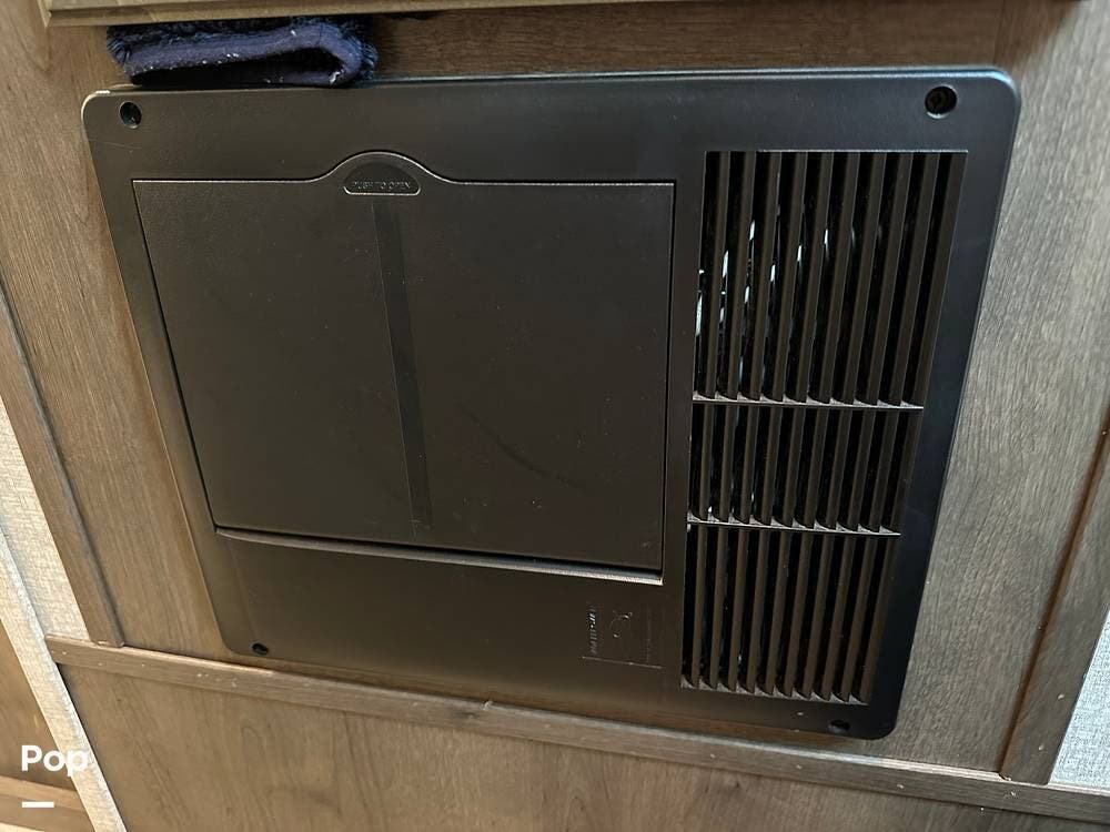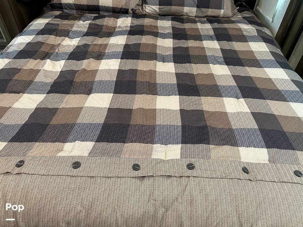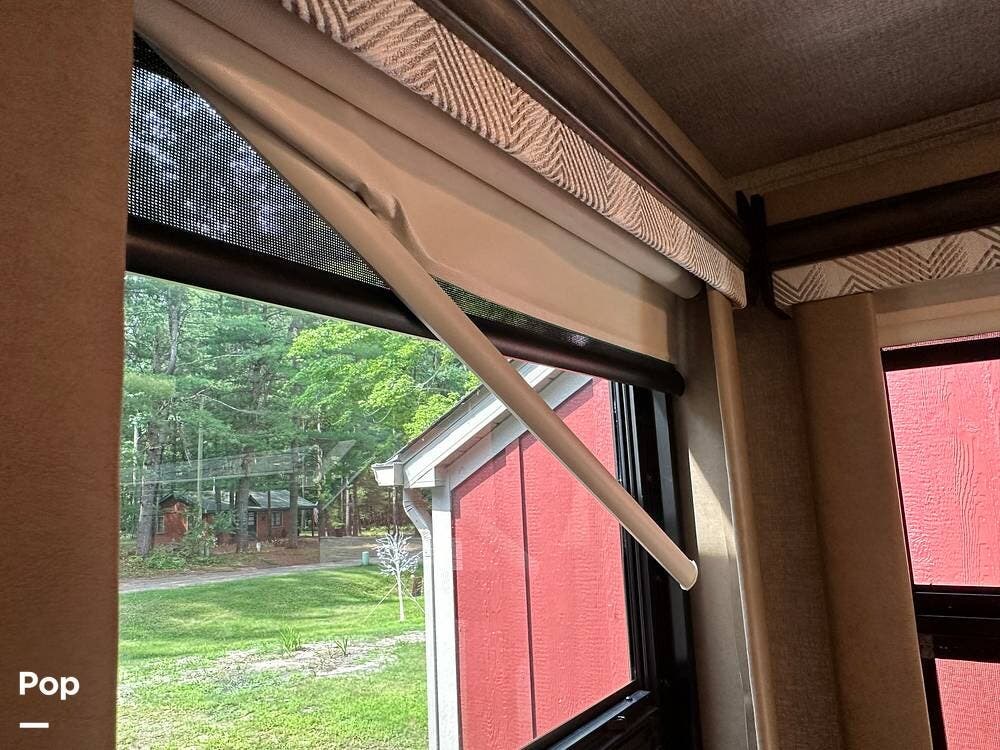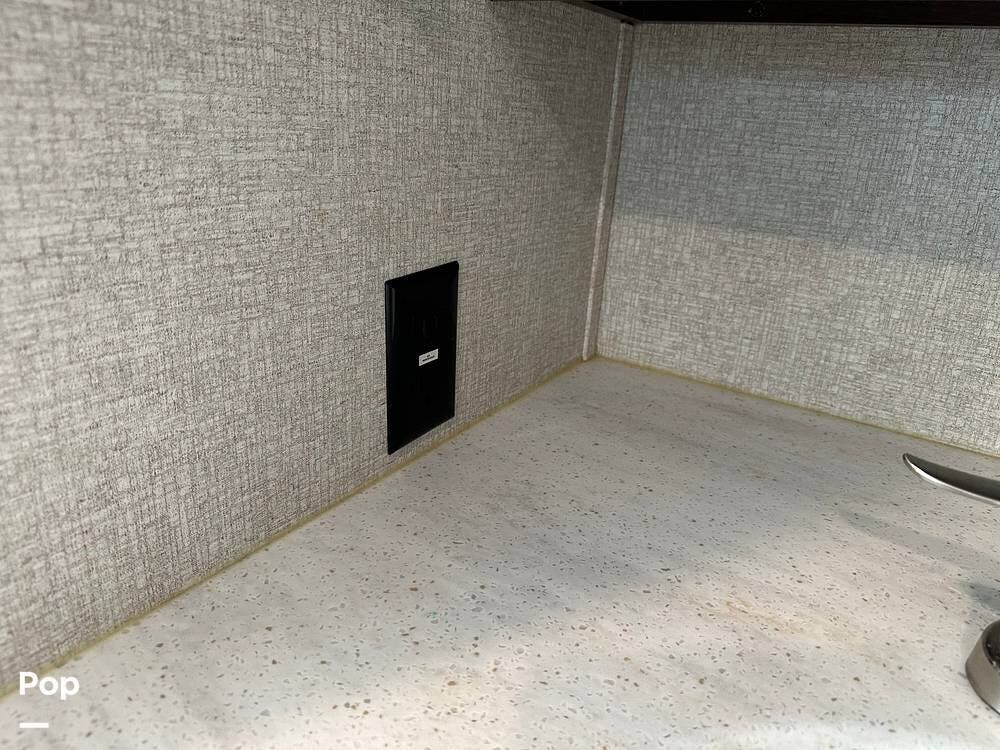 The kitchen has an island with a double sink, stove, oven, refrigerator/freezer, ice maker, pantry, buffet area, and plenty of storage. The dining area has an extension table and four chairs. Also has two pop-up charging stations and a central vacuum system. Has a removable lock for the refrigerator when traveling.