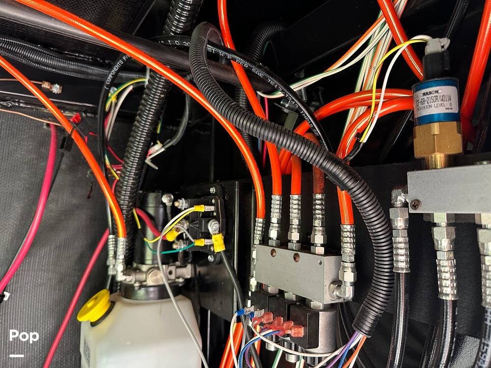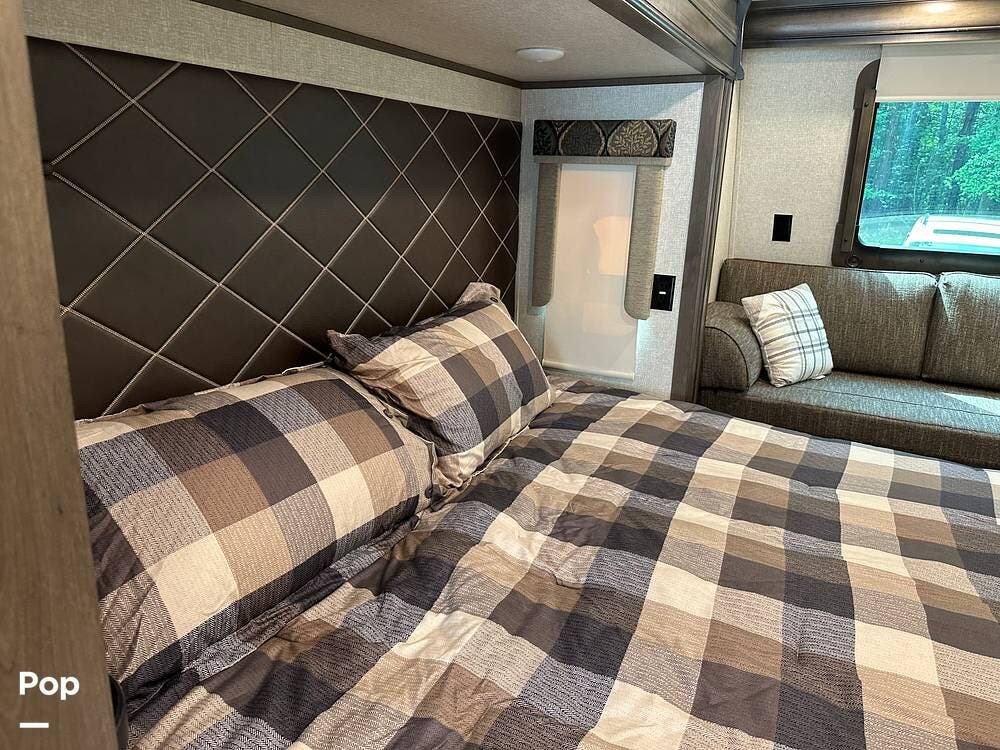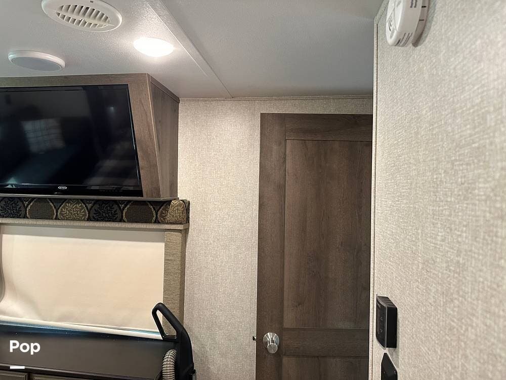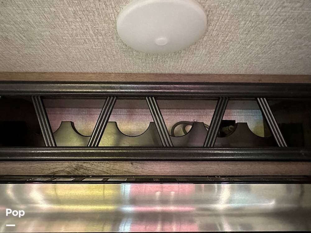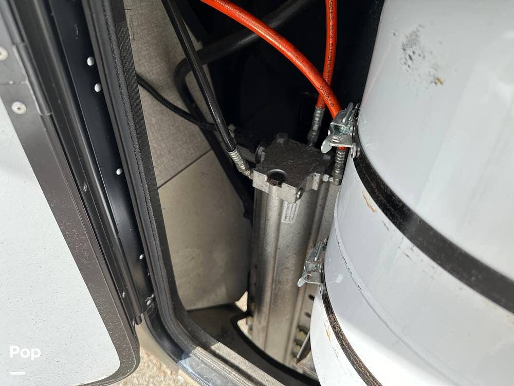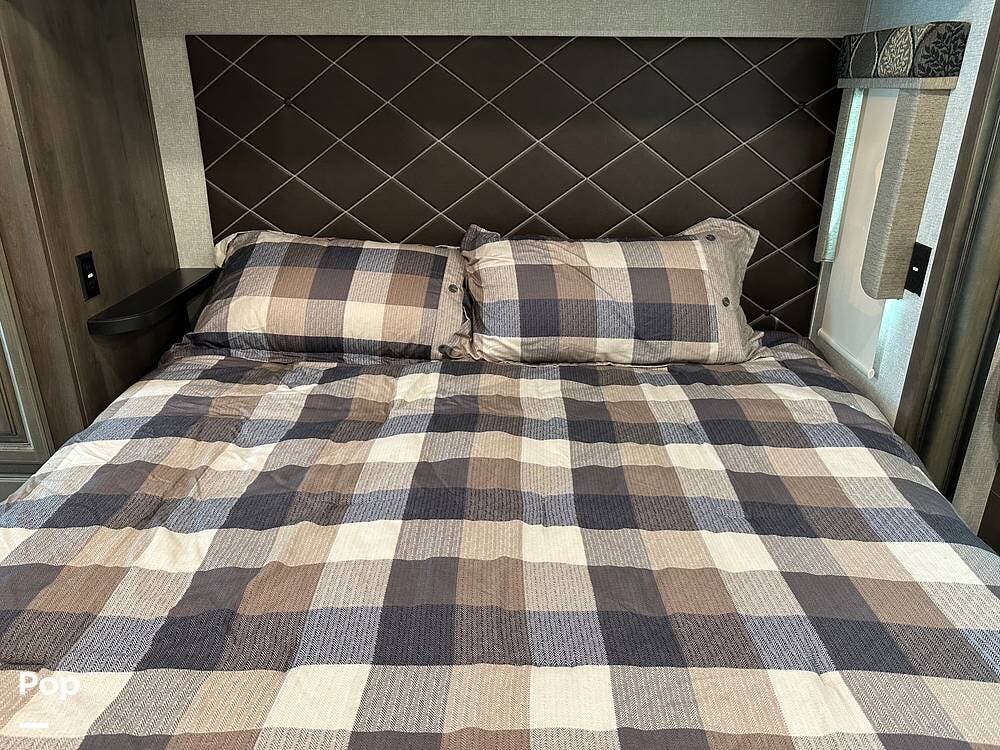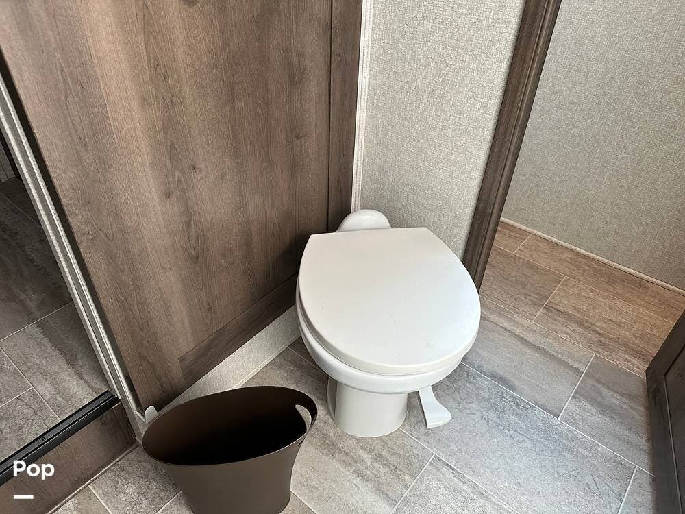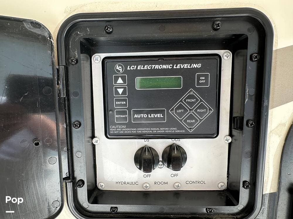 The kitchen has an island with a double sink, stove, oven, refrigerator/freezer, ice maker, pantry, buffet area, and plenty of storage. The dining area has an extension table and four chairs. Also has two pop-up charging stations and a central vacuum system. Has a removable lock for the refrigerator when traveling.