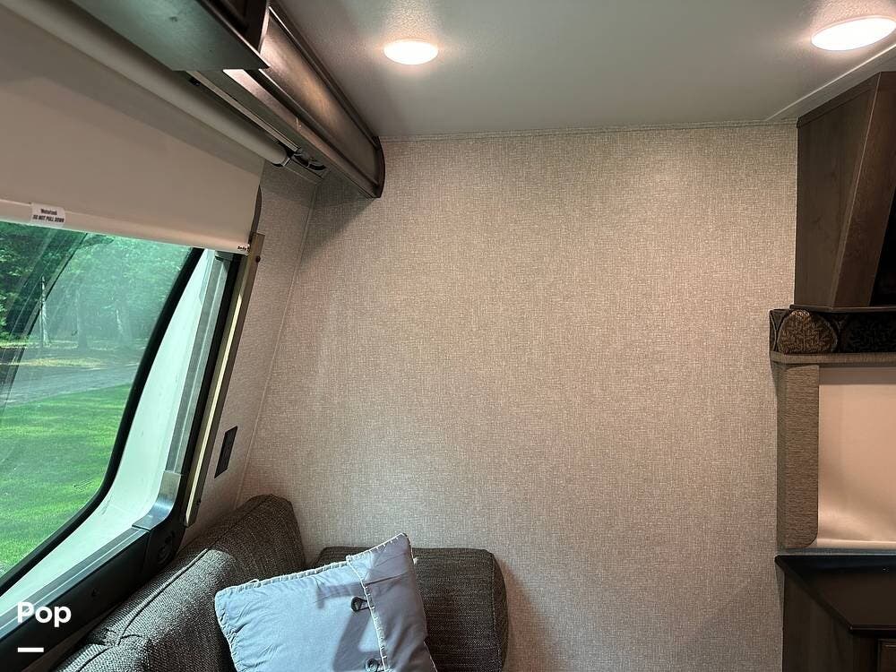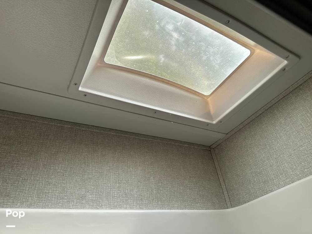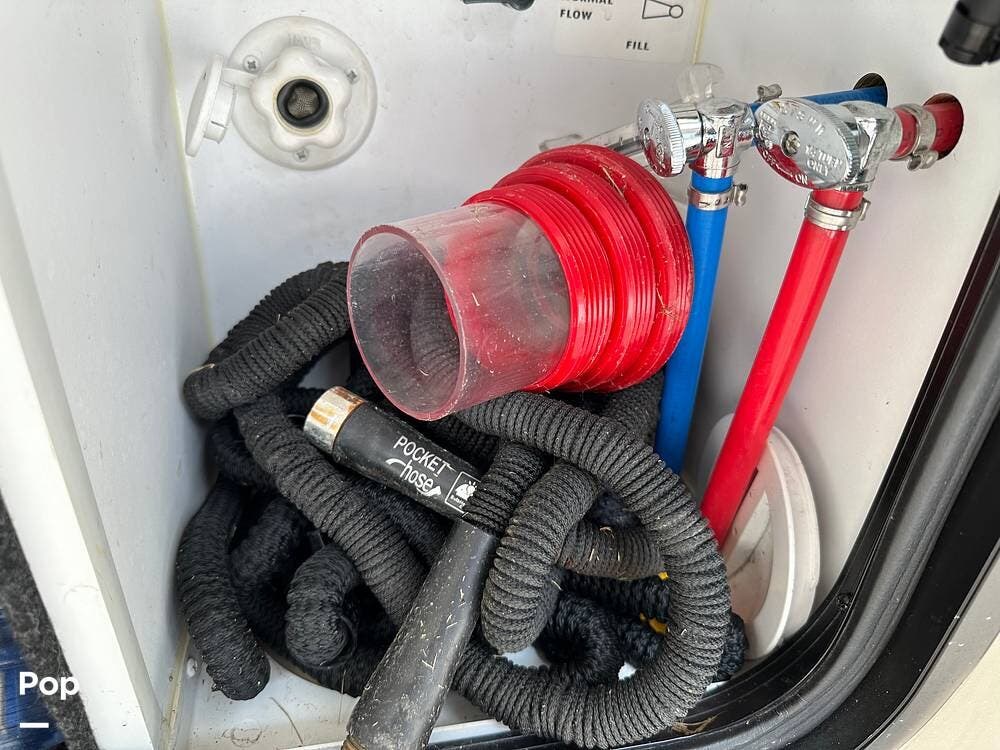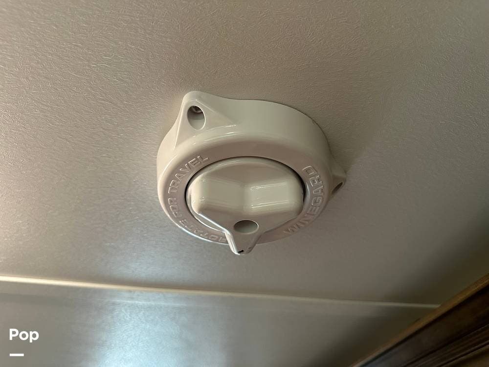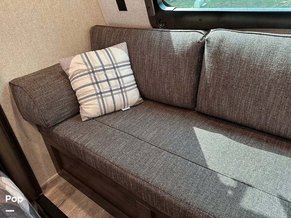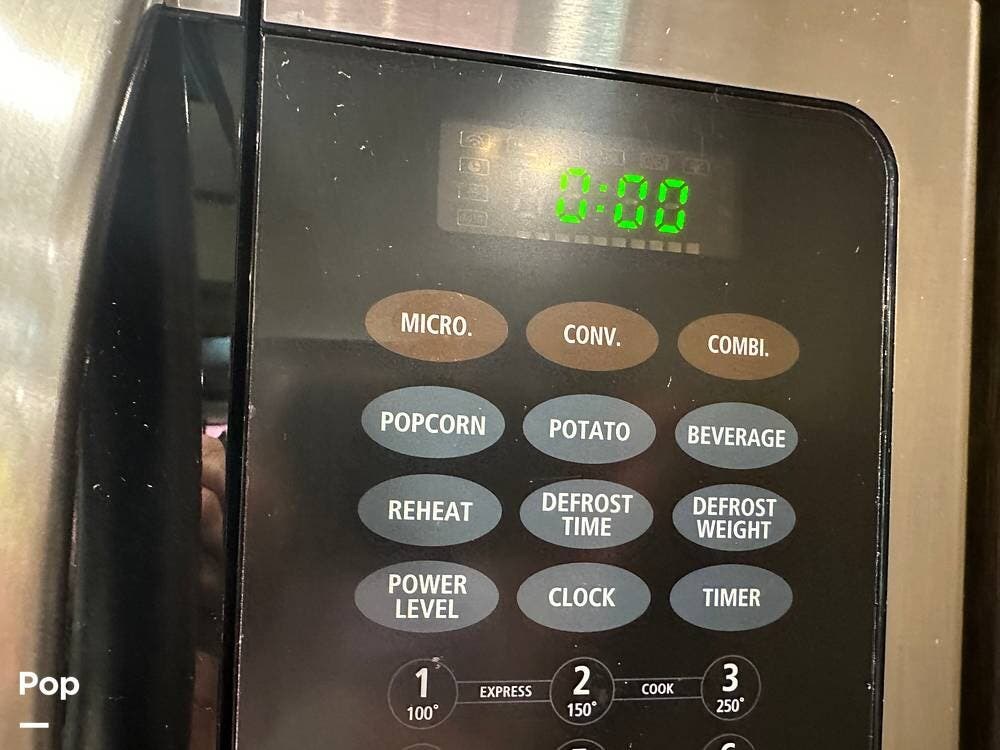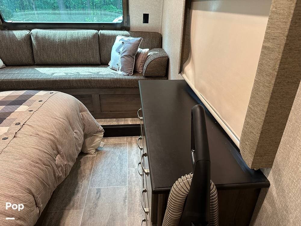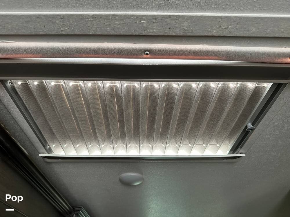 The kitchen has an island with a double sink, stove, oven, refrigerator/freezer, ice maker, pantry, buffet area, and plenty of storage. The dining area has an extension table and four chairs. Also has two pop-up charging stations and a central vacuum system. Has a removable lock for the refrigerator when traveling.