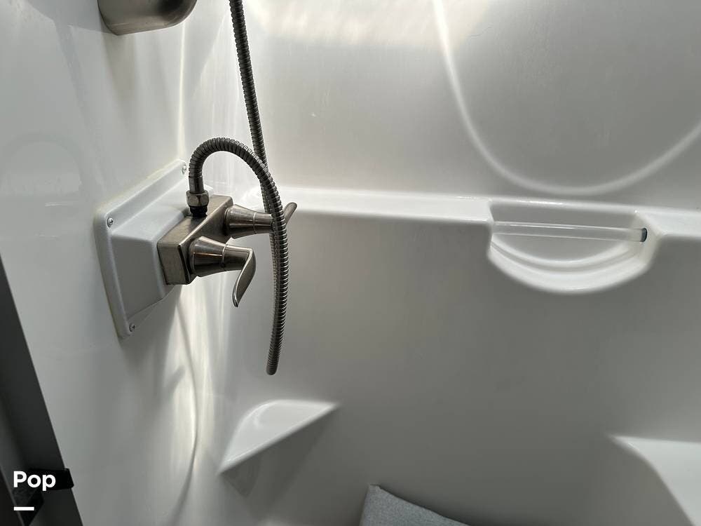 The bathroom has a head, sink with vanity, large medicine cabinet, and large shower area with glass doors and skylight. There is separate access to the bedroom.