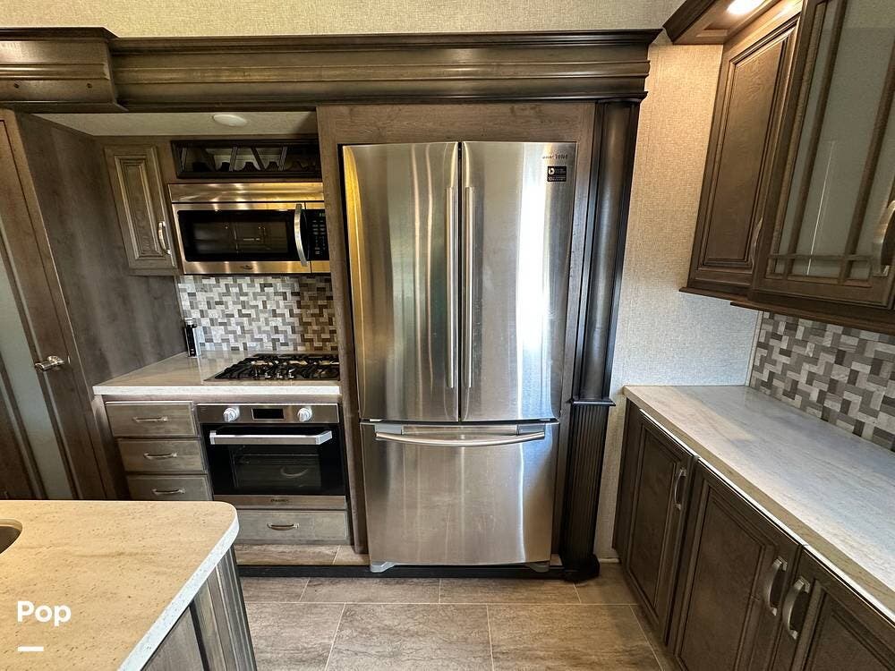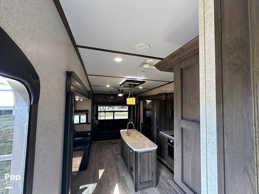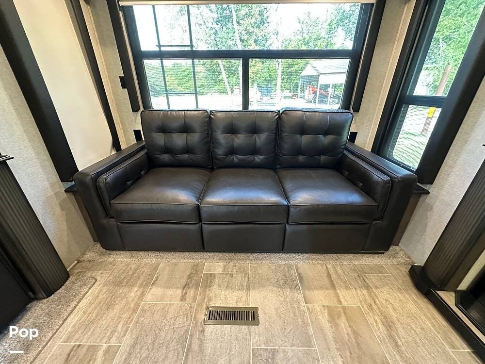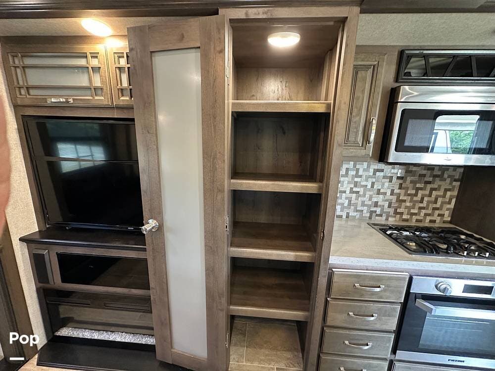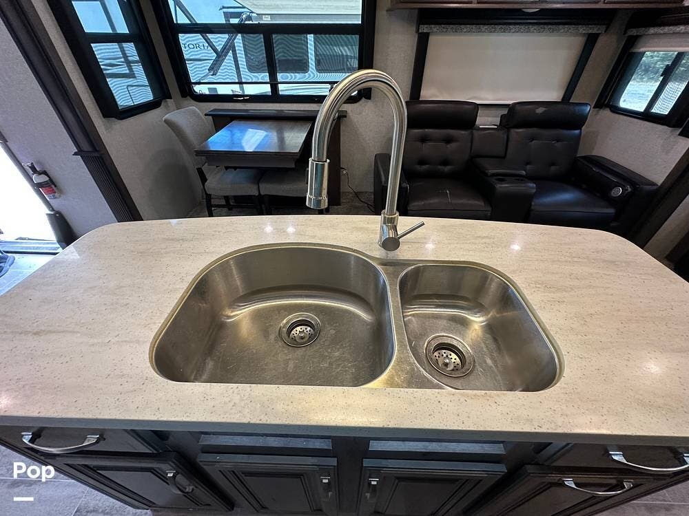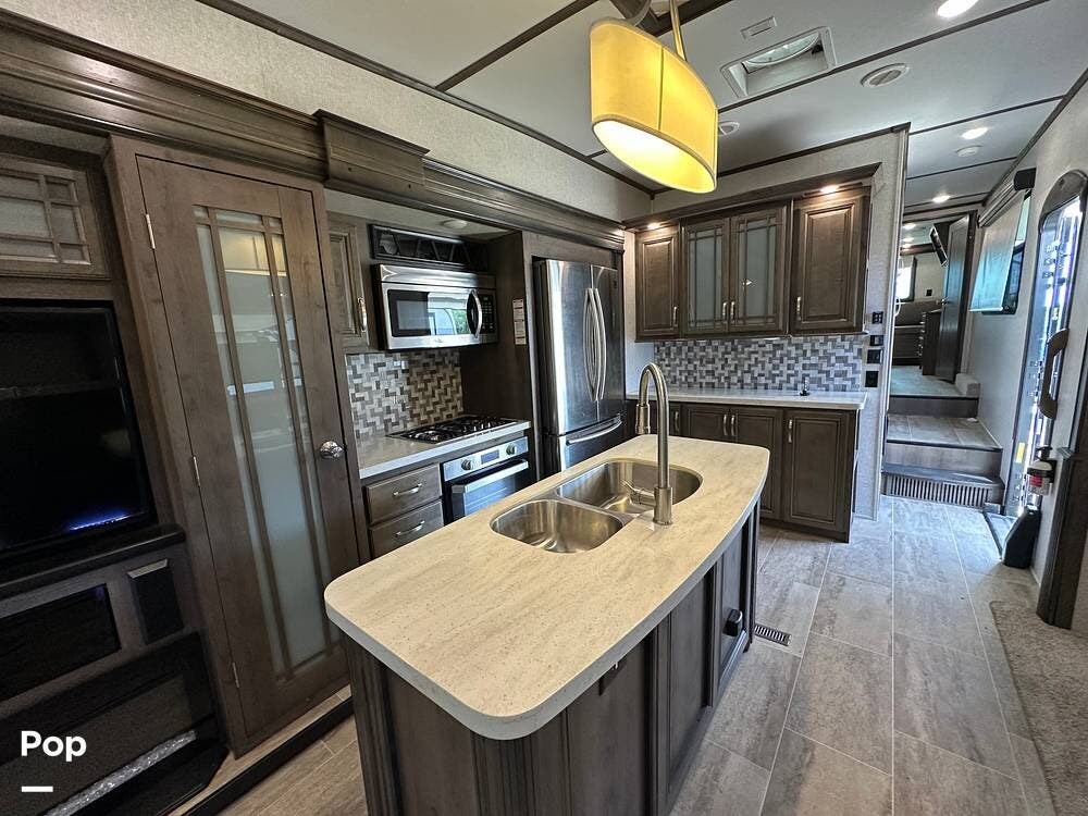 When you enter this RV, you will notice the open floor plan. The kitchen has a residential refrigerator, a double sink, a stove, and a convection microwave. With a center island and pantry, there is plenty of cabinet space.