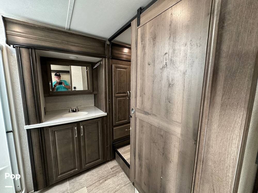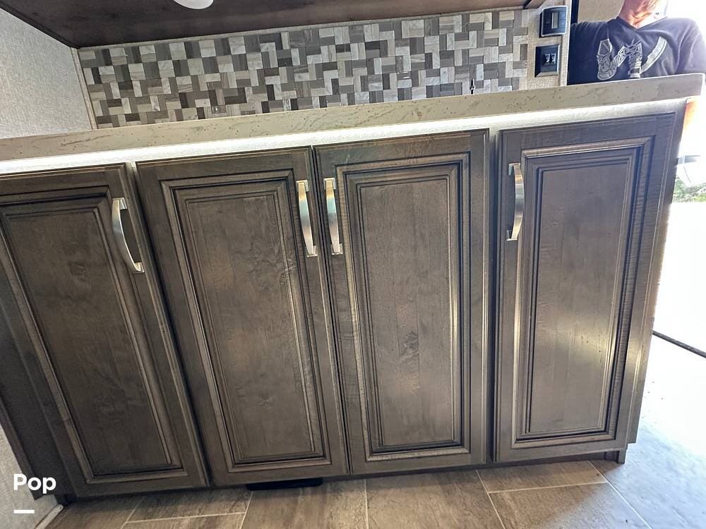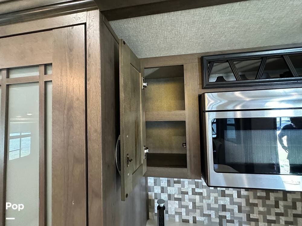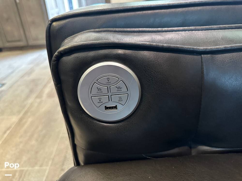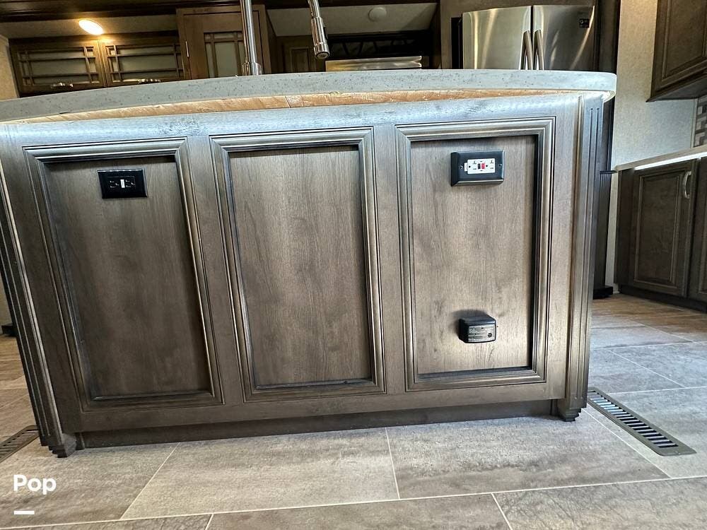 When you enter this RV, you will notice the open floor plan. The kitchen has a residential refrigerator, a double sink, a stove, and a convection microwave. With a center island and pantry, there is plenty of cabinet space.