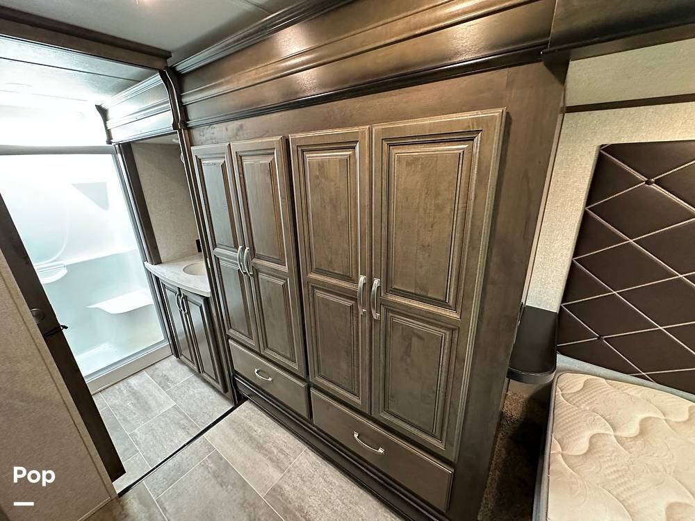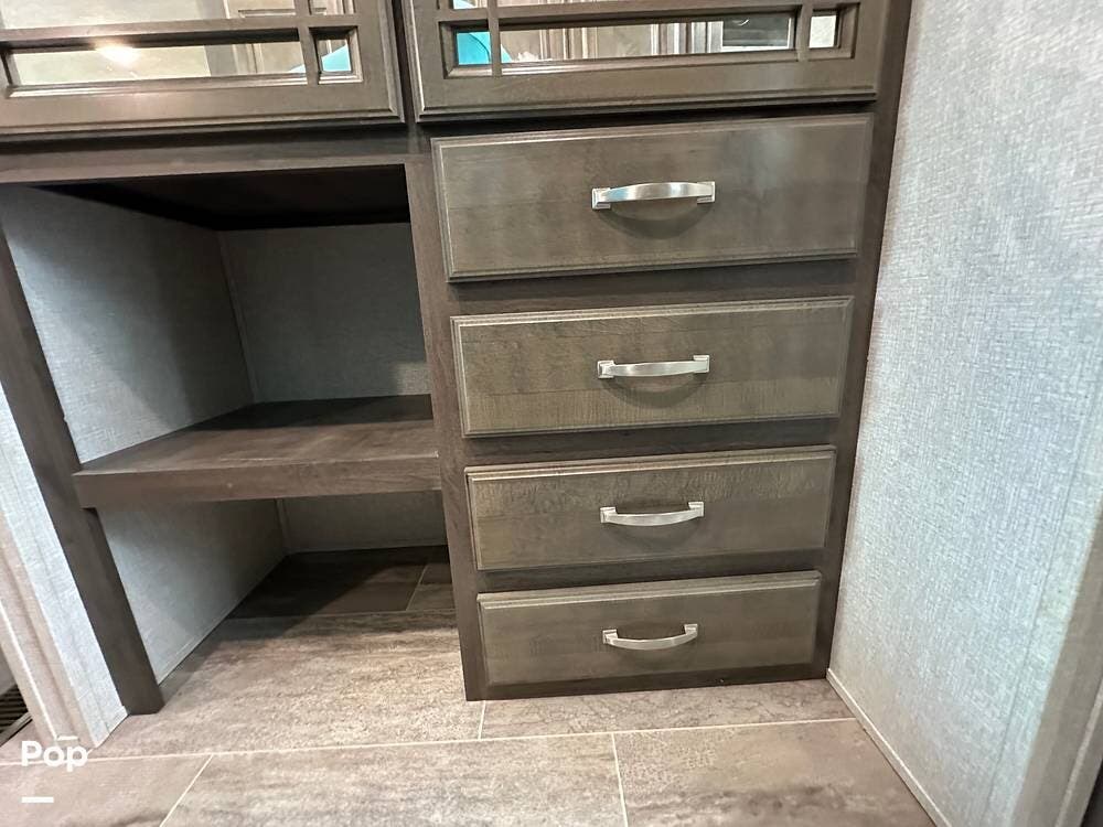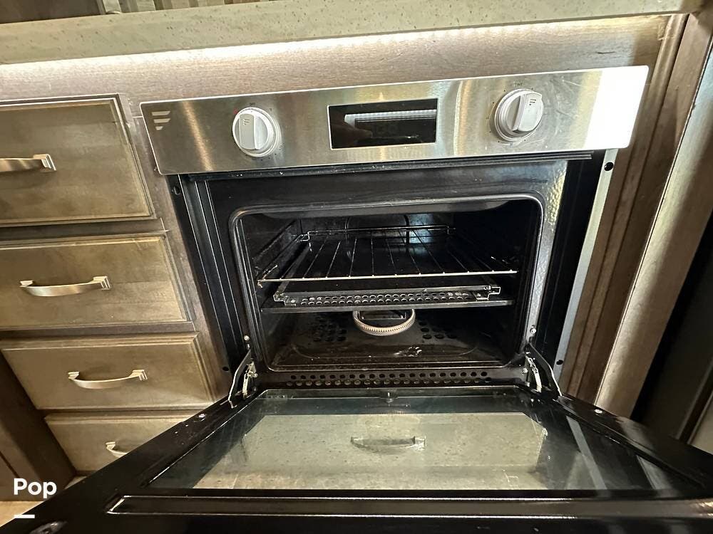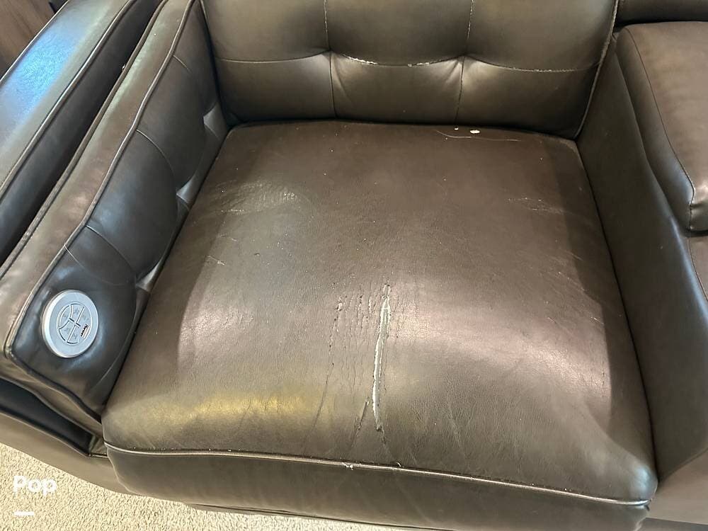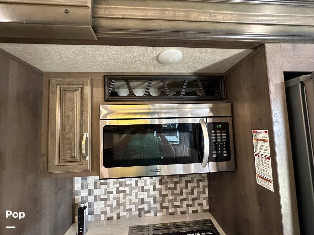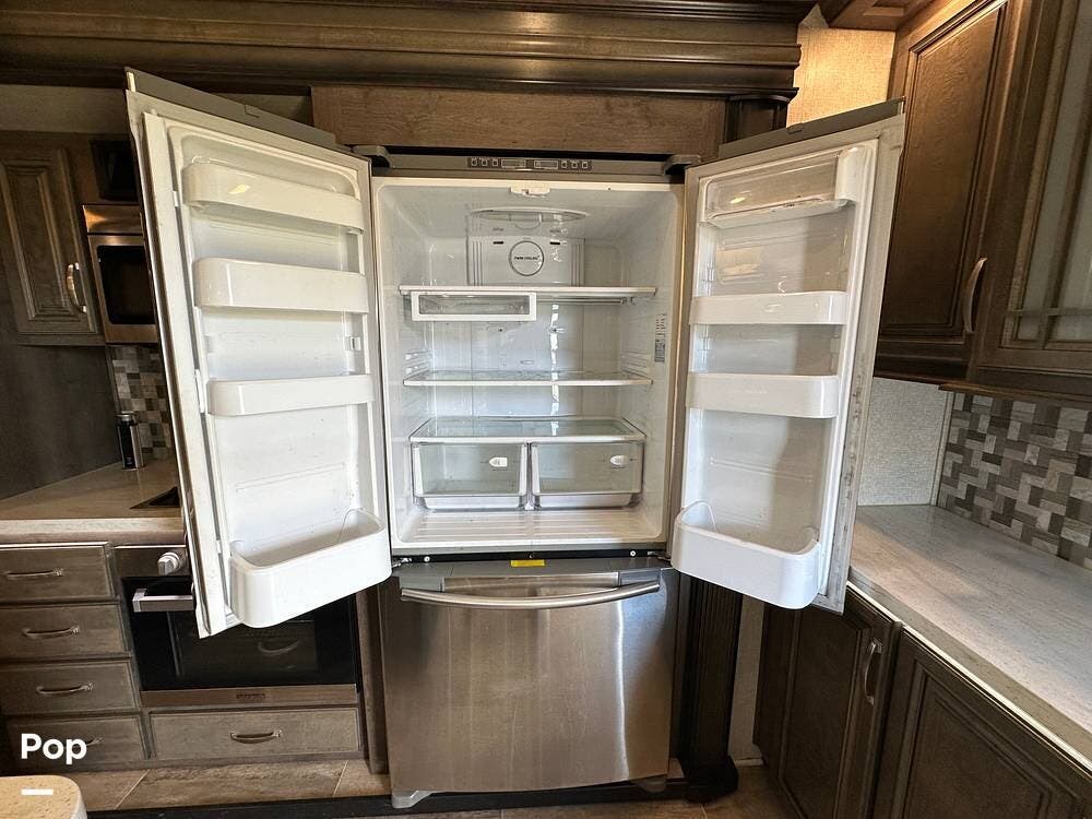 When you enter this RV, you will notice the open floor plan. The kitchen has a residential refrigerator, a double sink, a stove, and a convection microwave. With a center island and pantry, there is plenty of cabinet space.