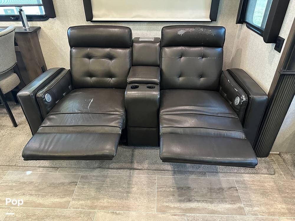 The living room has stadium reclining seats, a large TV, a stereo system, and a fireplace. There is also a couch for extra guests or the whole family.