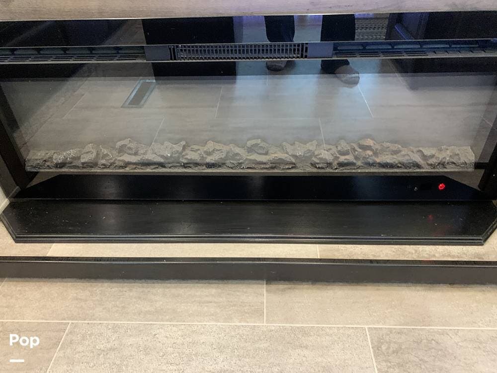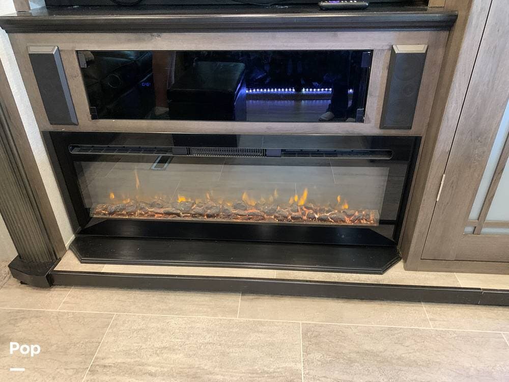 Inside is a spacious living and kitchen area featuring four slide-outs. This expansive space includes a full kitchen with top-notch amenities, plush theater seating with cupholders, a dinette, and a tri-fold sofa. The living room is enhanced by a cozy fireplace, perfect for relaxing after a day of adventure.