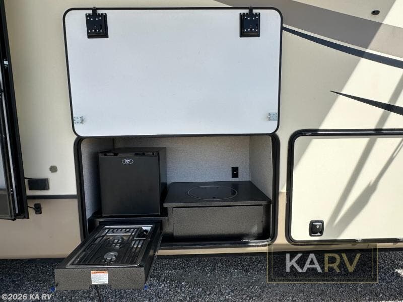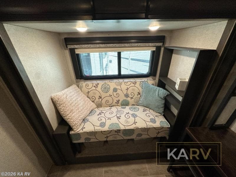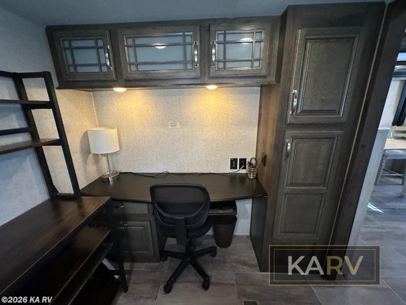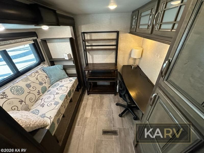 Full-timers love this fifth wheel including the new 20th anniversary edition enhancements! From the bonus room offering a hide-a-bed sofa and a desk which is quiet handy if you telecommute or your kids have homework, to the loft area offering storage and sleeping space, this Montana has it all for a couple or a family. Just imagine exploring outdoors to return to your own full kitchen including a residential refrigerator, large pantry and a kitchen island. The convection microwave comes in handy as well. You can relax on the furniture, and dine at free standing dinette while watching the HDTV and fireplace. The chairs can be moved to another room if needed. You might even choose to cook outdoors on the outside kitchen for several meals. This is the one!