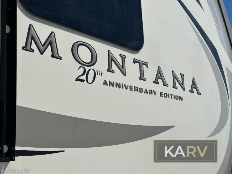When packing for your next trip in a Keystone Montana luxury fifth wheel you will appreciate the enormous drop frame pass-through storage compartment, the MORyde "Step Above" entry steps with strut assist, and the LED light package including "super-bright" taillights with backup marker and off-door scare light. The Montana 20th Anniversary Edition adds exclusive features such as the Key TV satellite prep, LED accent lighting, Tru-fit slide construction, and Easy Sweep resilient flooring. You will love the in-floor heating ducts, which allow for more airflow to be distributed evenly for optimal comfort. the LED motion sensor light in the pass-through compartment and convenience center, plus the Four Season Living package allowing you to travel whenever you like. It's time to find the luxury fifth wheel you can enjoy for years to come, choose a Montana by Keystone today!