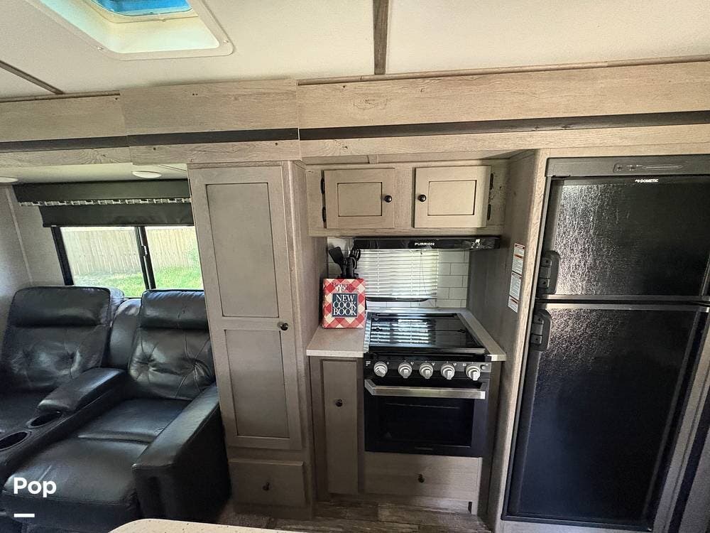 A central kitchen island anchors the space, surrounded by a three‑burner stove, microwave, and mid‑size 10 cu ft fridge powered by both electric and propane. A dinette rounds out the communal hub.