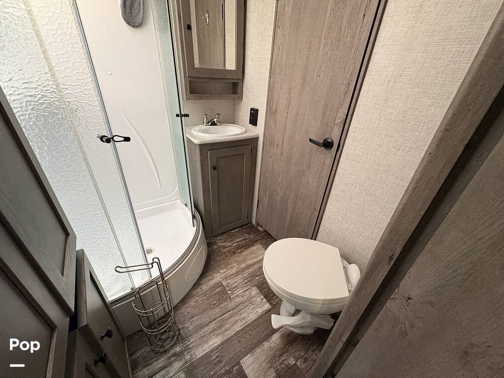 The bathroom, located mid-coach between the living and bedroom areas, features a 34-inch radius shower, a porcelain toilet, and vinyl flooring.