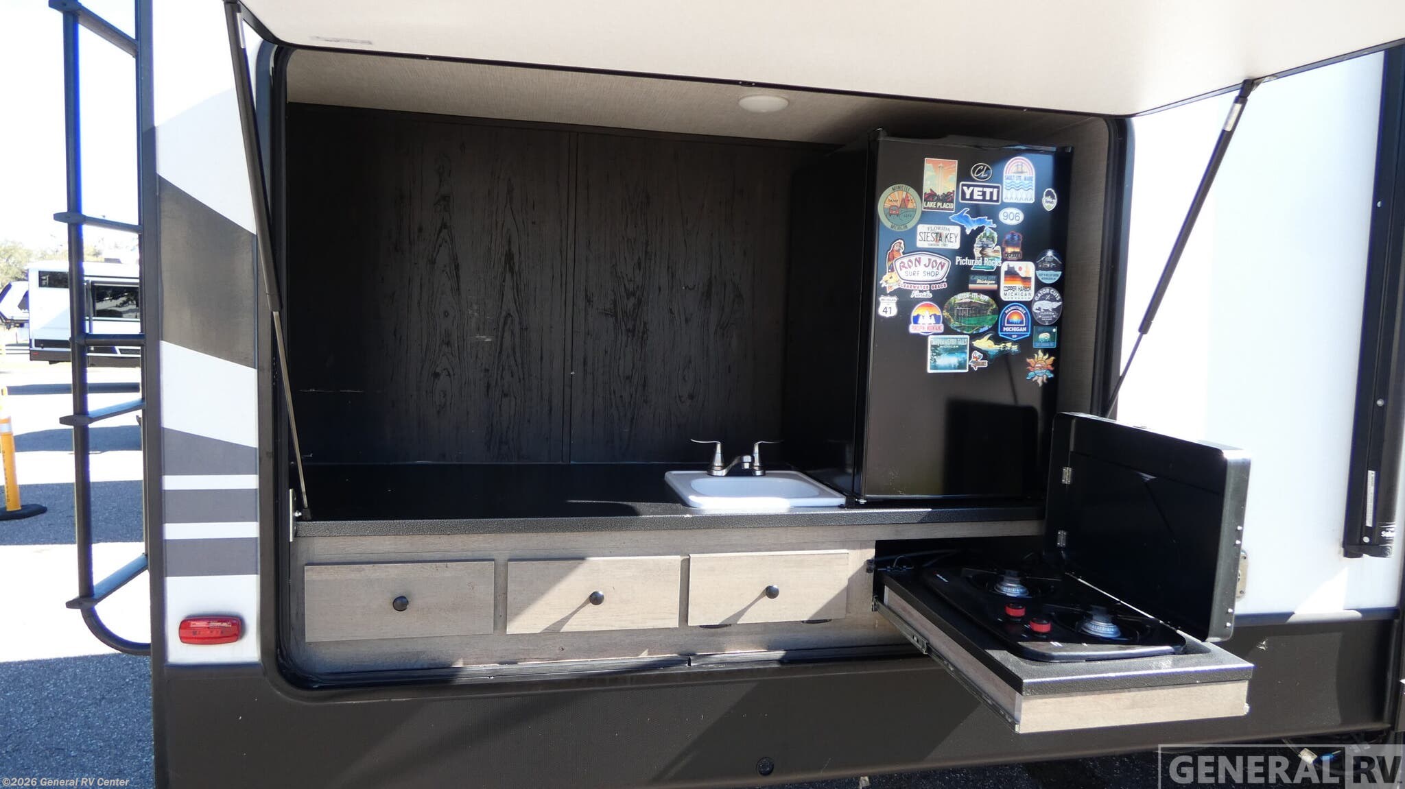 **Keystone Outback toy hauler 335CG highlights:** * Outdoor Kitchen * Kitchen Skylight * Three Slides * Fireplace * Master Suite This Outback toy hauler is a fully equipped unit that has an exterior pass-through storage which will hold most of your gear that you need to set up and tear down, as well as some outdoor games or extra luggage. The separate garage area, where you will store your toys as you travel, has its own space with a private entry into the central living area and a flip-down sofa sleeper with a bunk bed above the entertainment center. You will thoroughly enjoy the freedom of the outdoor kitchen that includes a refrigerator, a two-burner stove, and a sink, and preparing a hearty dinner in the interior full kitchen will be a breeze with the help of the kitchen island and large pantry. The Keystone Outback is a trailer that has truly been designed for a lifetime of RVing. With its tinted safety glass windows, heated and enclosed underbelly, block foam insulation, and various smoke detectors, you can continuously travel with a clear peace of mind. Because the Outback comes with a 30,000 BTU furnace and a 15,000 BTU air conditioner, you will always remain comfortable through any climate as you sleep inside each night, and the 50 AMP power source will ensure that you are able to use each of your favorite electric features.
