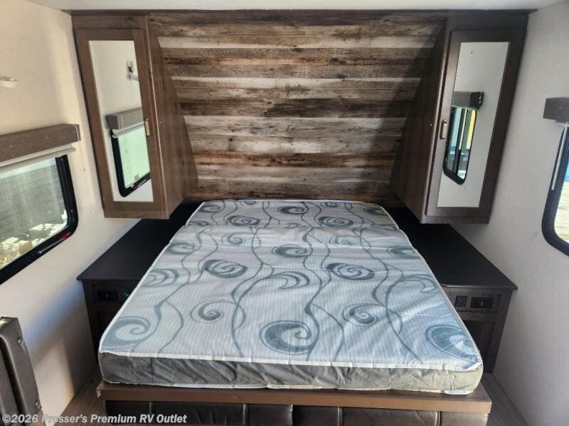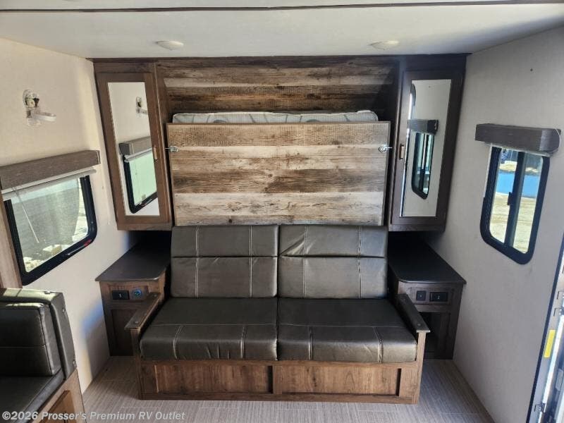 Envision relaxing on the sofa while the family plays a board game at the U-shaped dinette slide out while it's raining outside. This Passport travel trailer provides seating and sleeping arrangements for four people, plus a full bathroom. You can enjoy a front living area during the daytime, and a Murphy bed at night. No more looking at your unmade bed while camping. The full bathroom in the rear allows you to skip the public facilities and store extra clothing in the wardrobe, the kitchen amenities provide the necessary appliances to make your favorite meals, and you will find storage for all your things inside, and outside in the pass-through compartment. Comfort, relaxation, and fun are what you will get every time you take this model out.