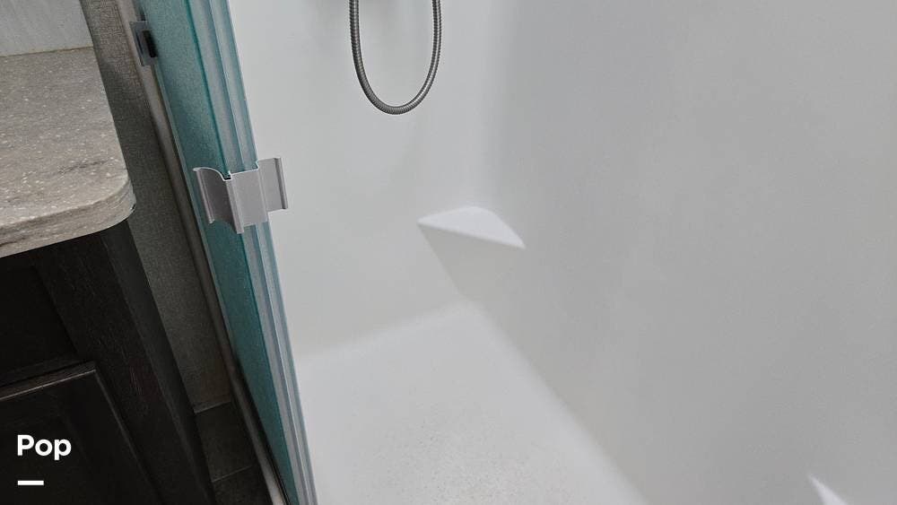 The bathroom is well-appointed with a spacious shower, vanity, and storage for toiletries.