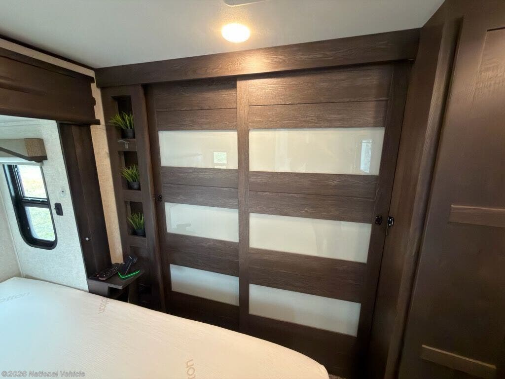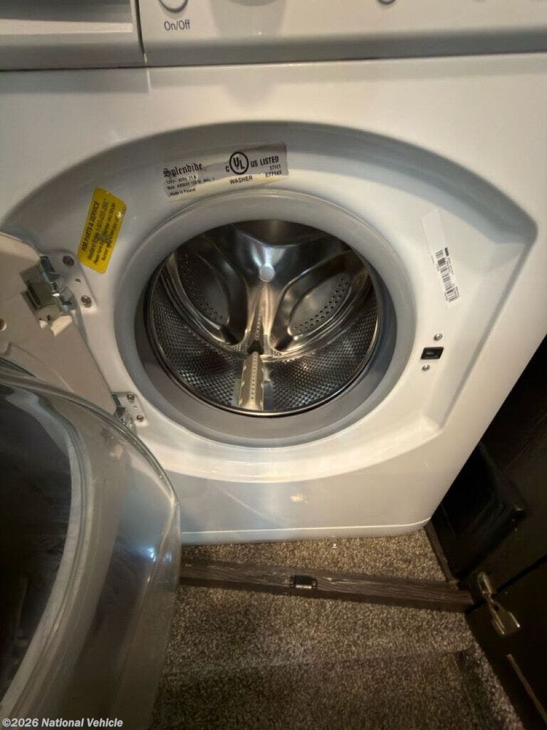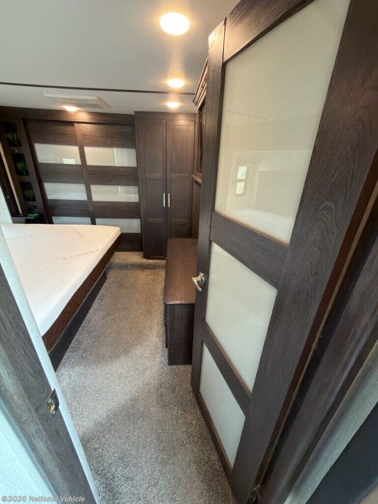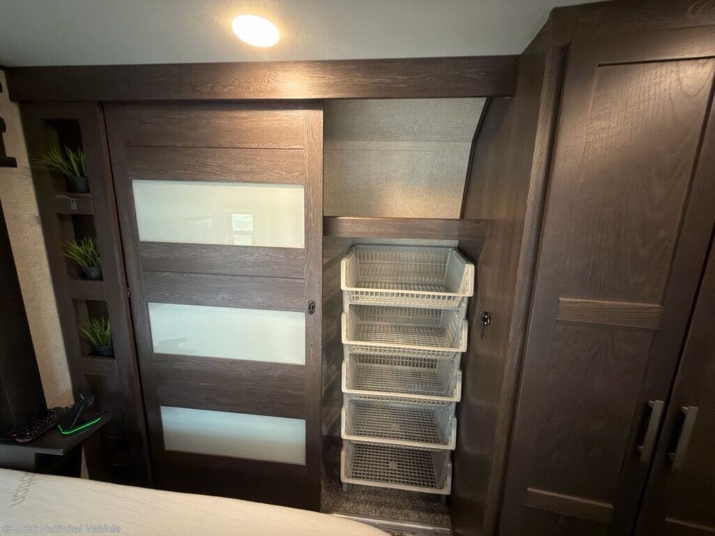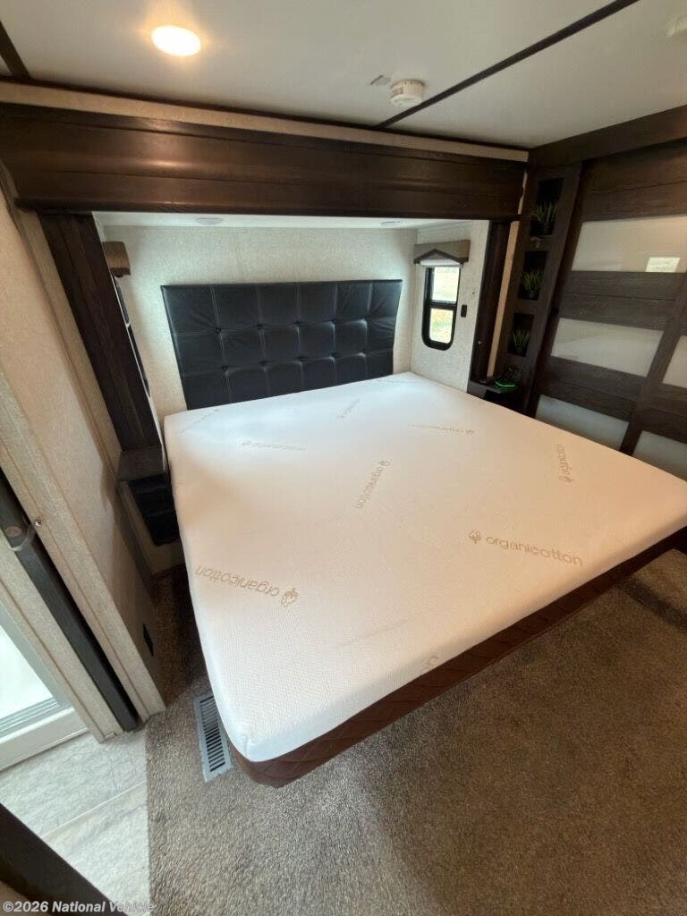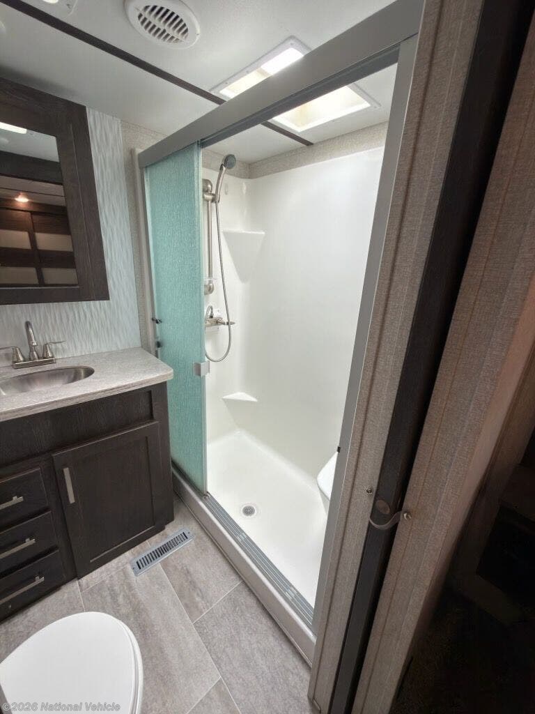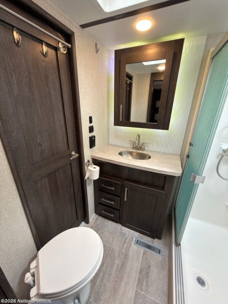 In the front, the private master suite provides a comfortable retreat with a king-size bed, generous wardrobe space, and washer/dryer prep for extended stays. The spacious bathroom includes a large shower and residential-style fixtures, giving you all the comforts of home on the road.